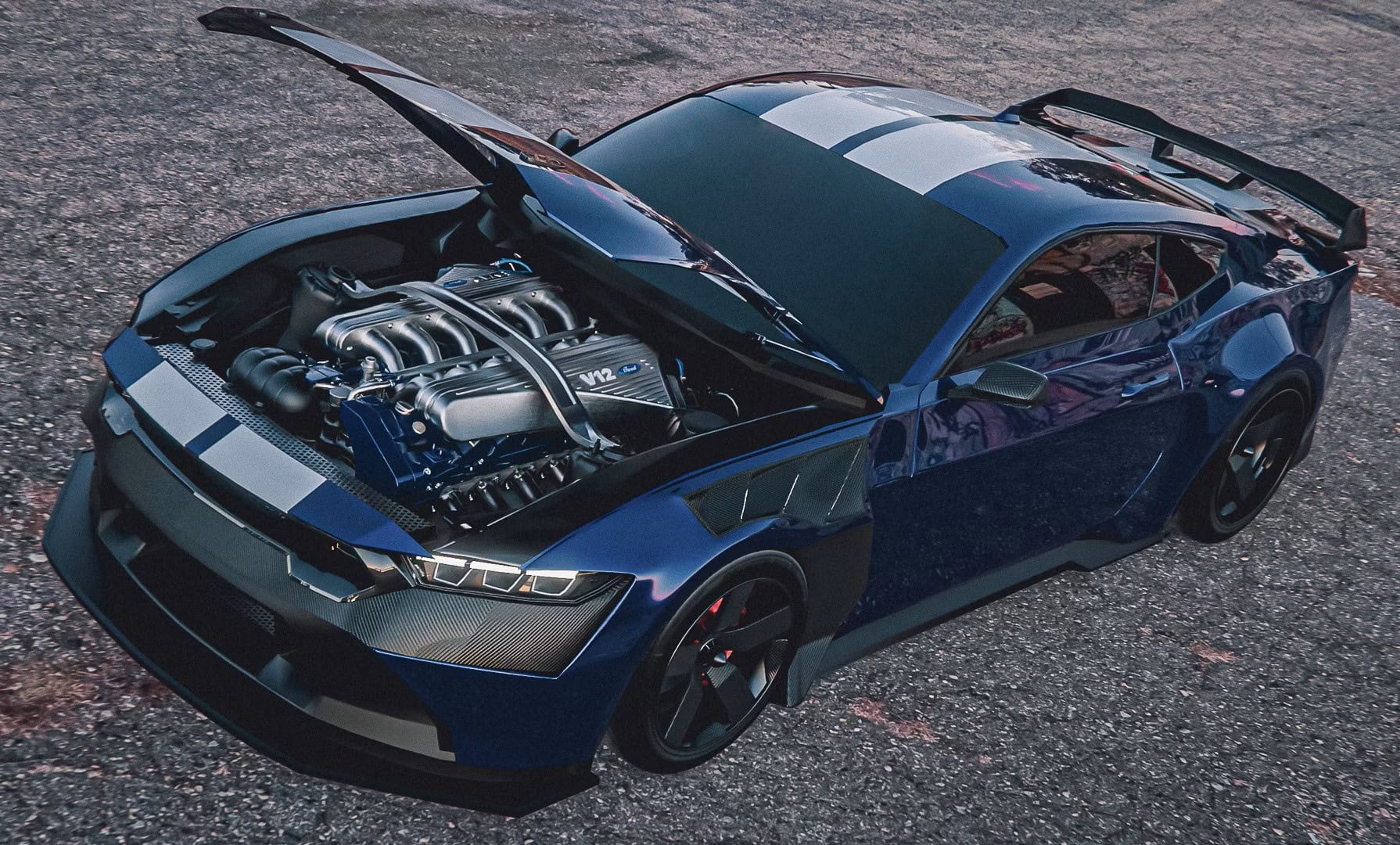 Oubliez la Ford Mustang Raptor et même la Mustang GTD, la Ford Mustang S650 V12 a tellement de cylindres qu’il est impossible de ne pas aimer. Ford a fait des choses incroyables avec la Mustang ces derniers temps. Alors que la Chevrolet Camaro et la Dodge Challenger Hellcat s’effacent dans un lointain souvenir, Ford continue de les écraser. La Dark Horse est une voiture de performance sérieuse et La Mustang GTD est une destructrice de tout concurrent sur piste et Ford prévoit une version tout-terrain de la Mustang, style Safari afin qu’elle puisse s’attaquer aux rallyes et pas seulement auc Cars and Coffee… Maintenat, c’est magique, deux EcoBoosts forment un V12… Qu’en est-il d’une Mustang à moteur V12 ? Ce ne serait pas la première fois qu’un moteur 12 cylindres porterait l’insigne de cheval de Ford devant lui. Plus tôt cette année, Tony Angelo, vagabond, YouTuber et animateur de Hot Rod Garage, a mis un V12 Aston Martin dans une Mustang Fox Body. C’est cette Aston Martin V12 qui a vraiment suscité l’intérêt, parce que le V12 qu’Aston Martin utilisait à cette époque n’était que deux V6 Ford Duratec mariés ensembles.