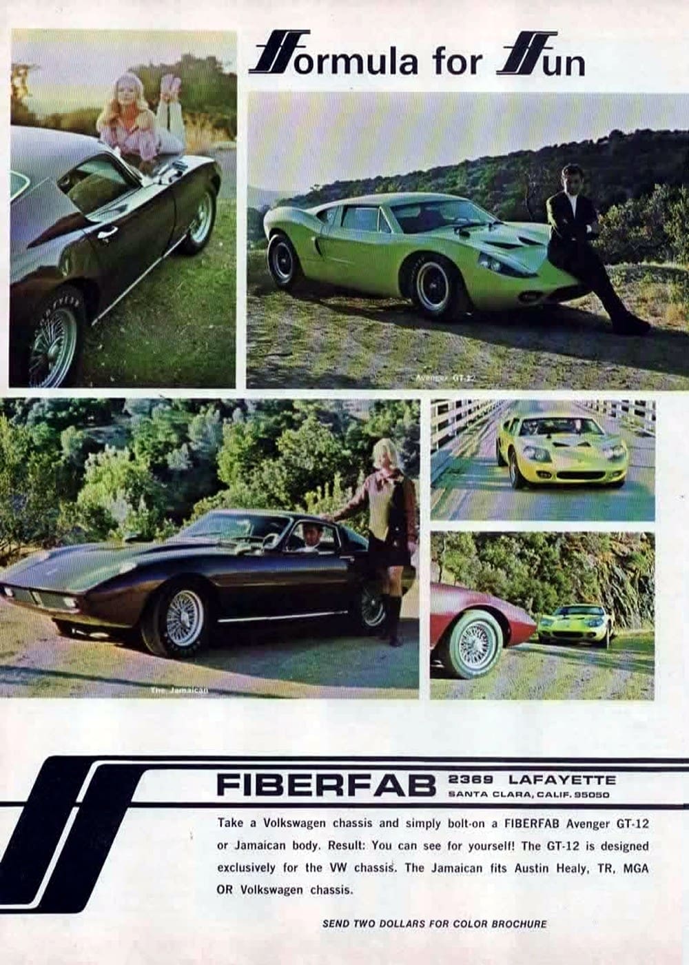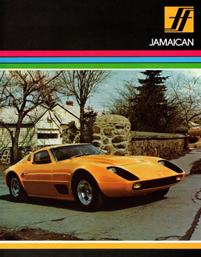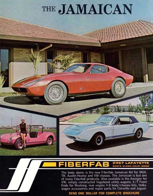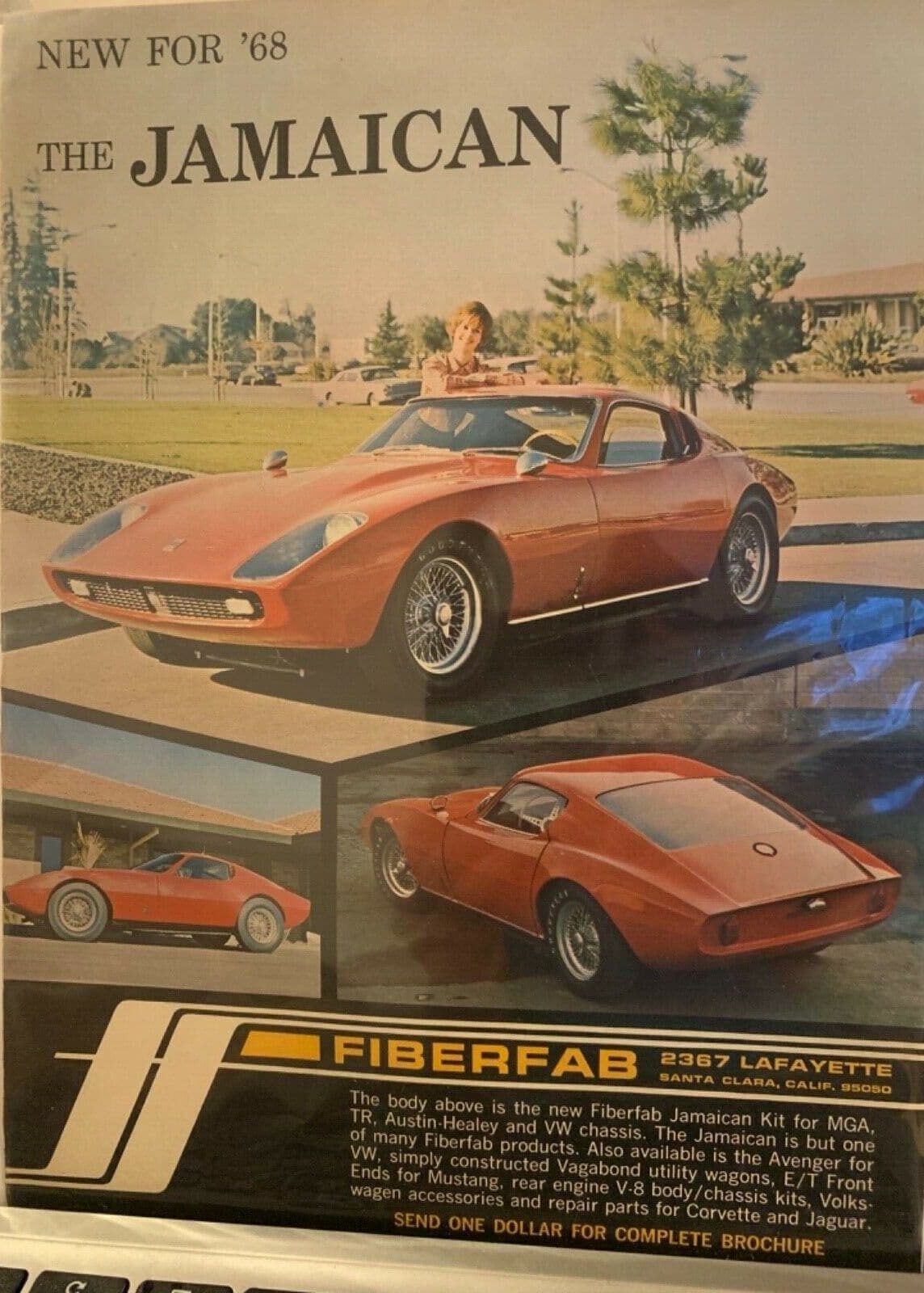 La Fiberfab Jamaican originale qui avait été mise en chantier en début 1967 en hommage à la Présidente (alors qu’elle n’avait pas encore été assassinée) était malgré tout sortie en 1968 (en tant qu’hommage à la Présidente assassinée) ! Il s’agissait essentiellement d’un kit comprenant une nouvelle carrosserie en fibre de verre pouvant être ajustée au châssis d’une TR3, TR4, MGA ou (grande) Austin-Healey. De nombreux Américains ont écrit à la société pour demander une version V8 du Jamaïcain, et ils ont donc développé une nouvelle carrosserie et un nouveau châssis pouvant être équipés d’un V8 Corvette et de ses trains roulants. Mais la version II a été mise au placard et n’en est sortie qu’en 1983.