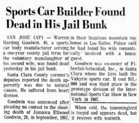 Comme écrit ci-dessus, en 1967, Goodwin a été arrêté pour suspicion de meurtre dans la mort par balle de Jamaïca Karen Goodwin (née Elwood), sa deuxième épouse de 28 ans et Présidente-Propriétaire de Fiberfab. Il a été reconnu coupable d’homicide volontaire et condamné à douze mois d’emprisonnement. Il est mort d’une crise cardiaque le 26 décembre 1968 alors qu’il purgeait sa peine ! Hebler grand gagnant financier de cette gabegie, a, malgré (où à cause de) cette tragédie, continué la production de kits, en sortant en 1968 la Fiberfab Jamaïcan I imaginée en début 1967 en hommage à la Présidente Jamaïca Karen Goodwin (née Elwood), 28 ans, Présidente-Propriétaire de Fiberfab qui avait été assassinée l’année précédente ! Une voiture conçue par Chris Bebee qui, selon certains, avait été influencée par la Lamborghini Miura !