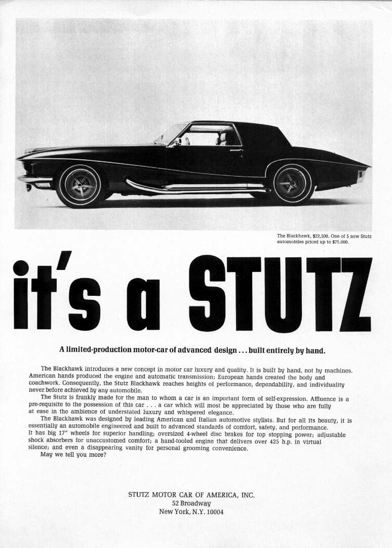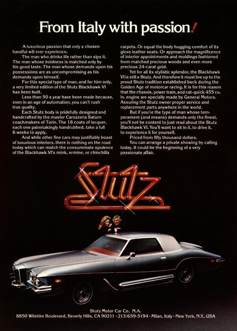 Les salles d’exposition Stutz d’autrefois (années’20 et’30) attiraient aussi les riches. Les supports marketing Art déco d’alors montraient des scènes luxueuses et faisaient des promesses de sécurité, utilisant des souvenirs du pedigree des Stutz de course. Les Stutz des années vingt attiraient la richesse générationnelle des Américains qui dépensaient six chiffres (ajustés) pour une voiture de luxe avant la Grande Dépression. Mais dans les années soixante-dix, la clientèle relancée de Stutz était un peu différente. La marque a immédiatement trouvé une base parmi les riches et les célèbres, principalement la variété d’artistes les plus dingues de l’univers. La toute première Stutz Blackhawk a été vendue à nul autre d’autre qu’Elvis Presley qui a déboursé 26.500 $ (195.000 US $ actuellement) pour avoir sa Stutz Blackhawk qui n’était qu’une Pontiac Grand Prix fortement modifiée (Kustomizée).