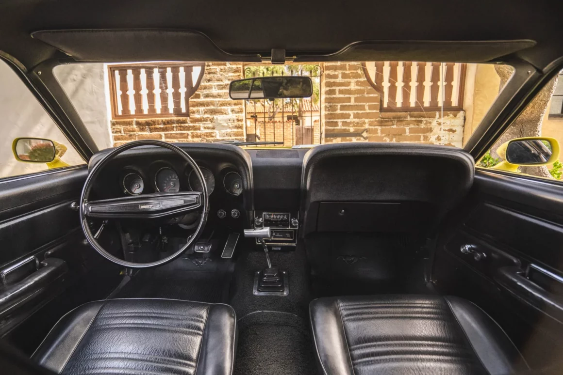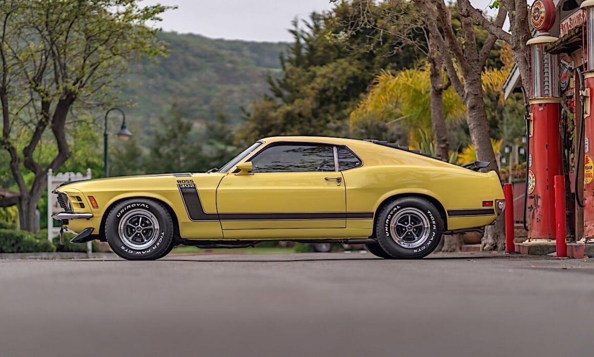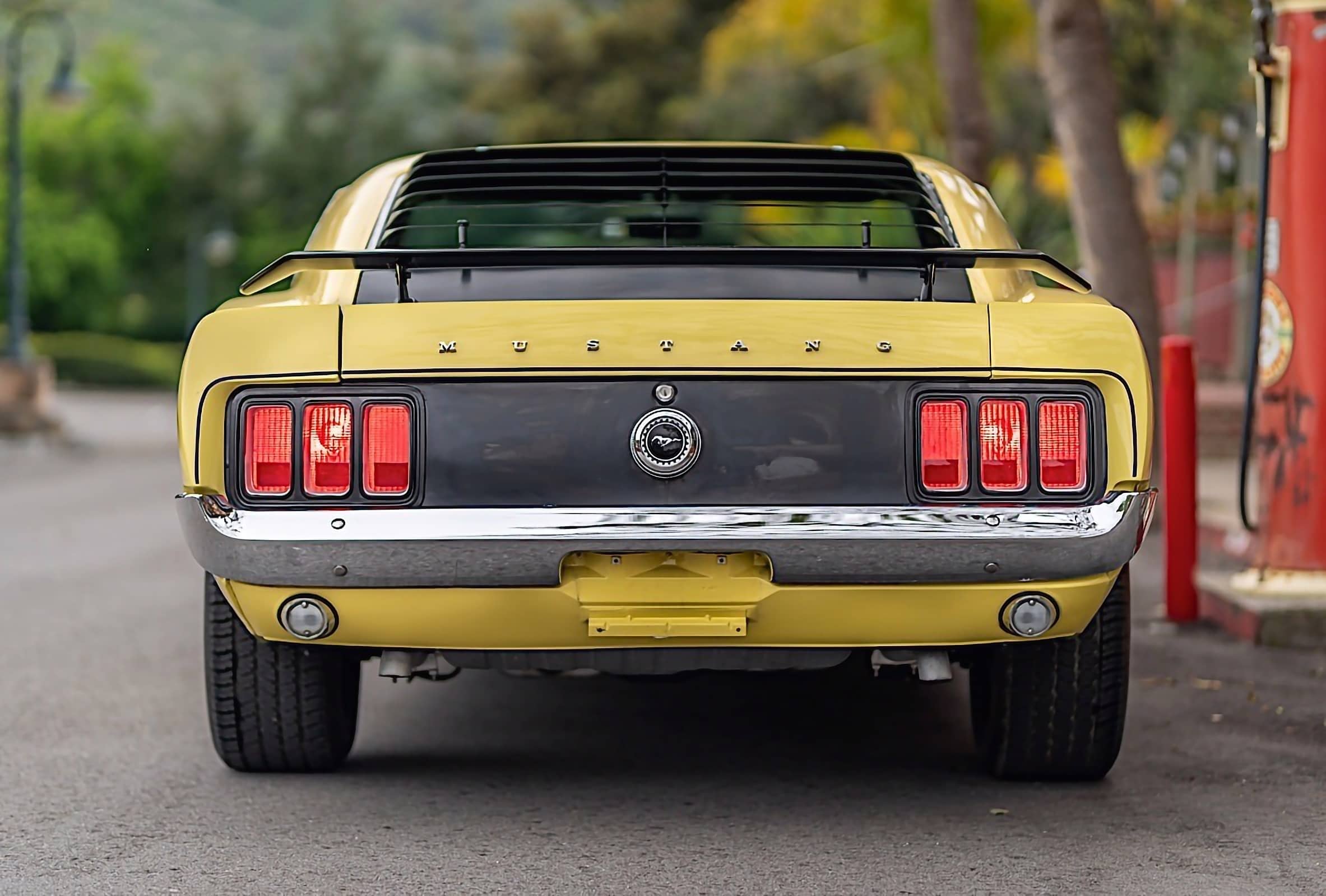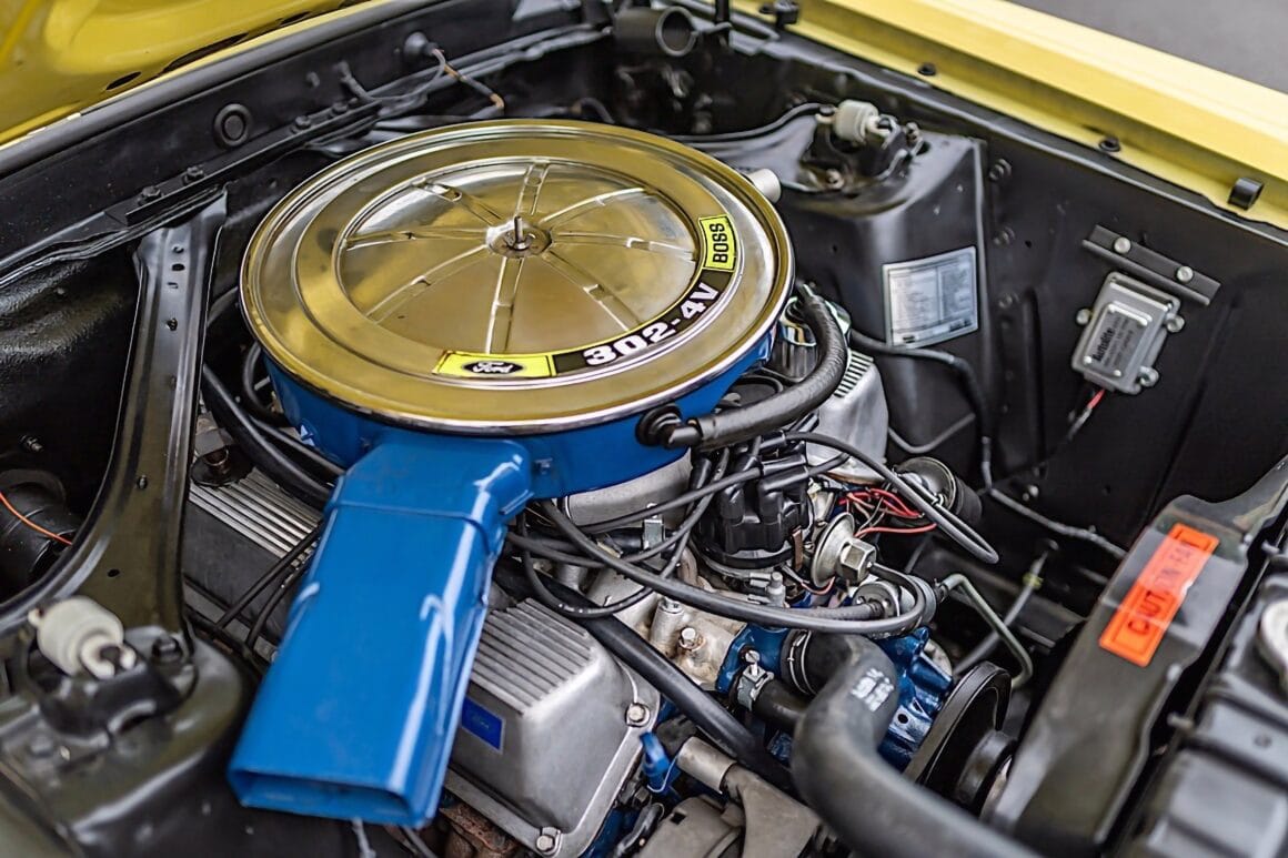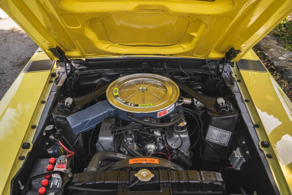 C’était clairement une Mustang mais distinctement unique en même temps. La peinture noire mate appliquée sur le capot, l’arrière et autour des feux, n’était que la partie standard de l’ensemble, tout comme les bandes «C» avec l’insert Boss 302 sur les côtés de la carrosserie. Étant donné que le spoiler en forme de pelle sous le pare-chocs avant fonctionnait sur les pistes de course, il s’agissait également d’un équipement standard, de même que l’aileron racing et la persienne façon Miura, car Ford voulait s’assurer que 1000 d’entre-elles seraient vendues avant la première course. Le style n’était qu’une fraction de l’histoire des Boss 302. Le moteur, puisqu’il était la base des courses Trans-Am, n’a pas été négligé. Chaque printemps, c’était l’heure du changement annuel des culasses dans le département performance de Ford. La configuration de course tunnel-port de l’année précédente a été remplacée par un tout nouveau design avec des soupapes inclinées comme le 429ci Ford et les 396/427ci de Chevrolet.