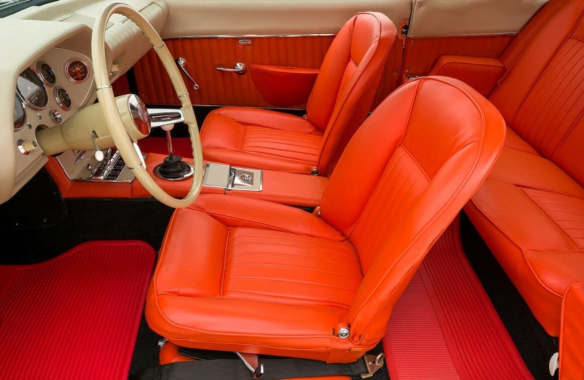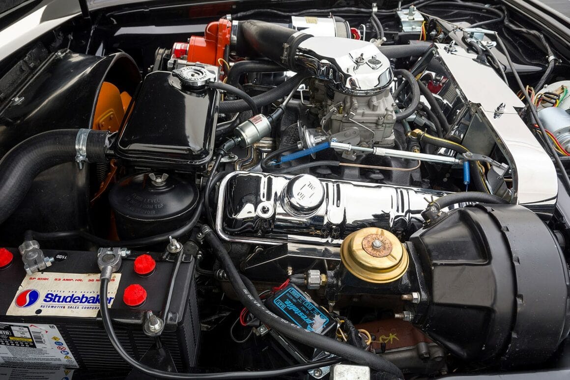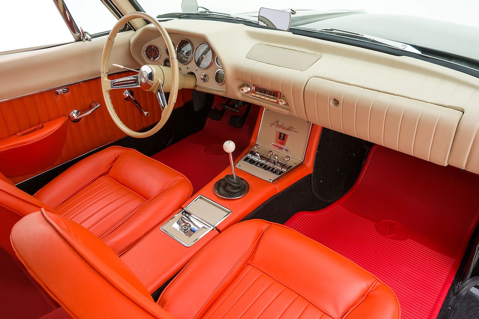La voiture dispose des jantes en acier peintes équipées de pneus radiaux à flancs blancs étroits et des enjoliveurs Avanti adéquats. Le point fort de l’Avanti a toujours été son habitacle confortable et sophistiqué à quatre places. Cette voiture est garnie d’une combinaison attrayante et authentique d’orange avec un tableau de bord et des dessus de porte de couleur appropriée. Les garnitures de portes plissées et les inserts de siège indiquent qu’il s’agit de la “Version Regal” (une option). Le moteur V8 289ci a été salué à son époque pour ses performances impressionnantes dans les spécifications R1 avec compresseur Paxton. Il s’agit de son moteur d’origine, qui a bénéficié d’une récente reconstruction totale par un spécialiste Studebaker. Le train de roulement est tout aussi bien fini, présentant des finitions de qualité sur la suspension et les composants du châssis.