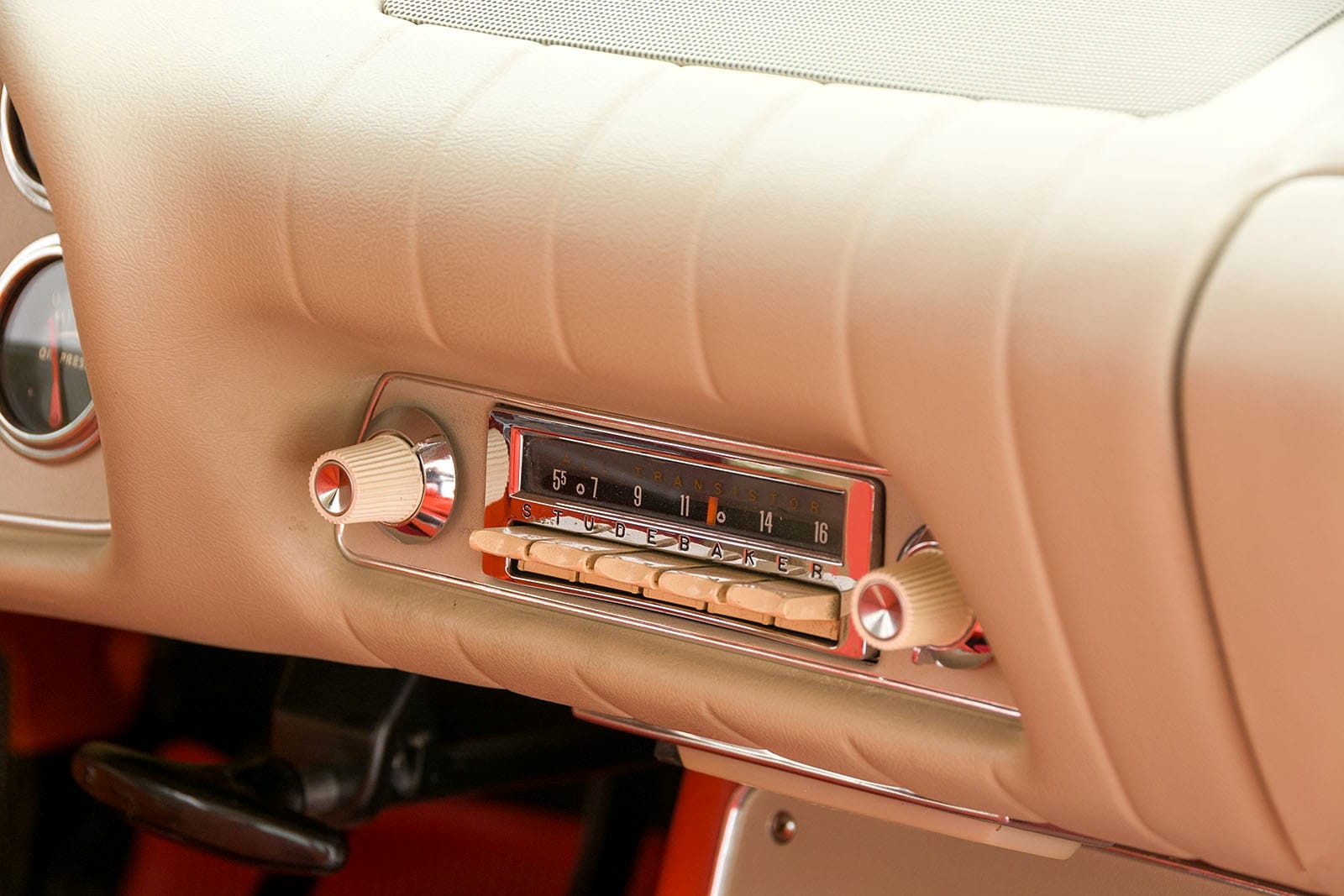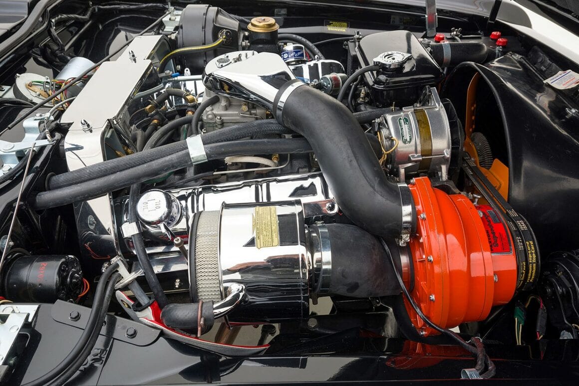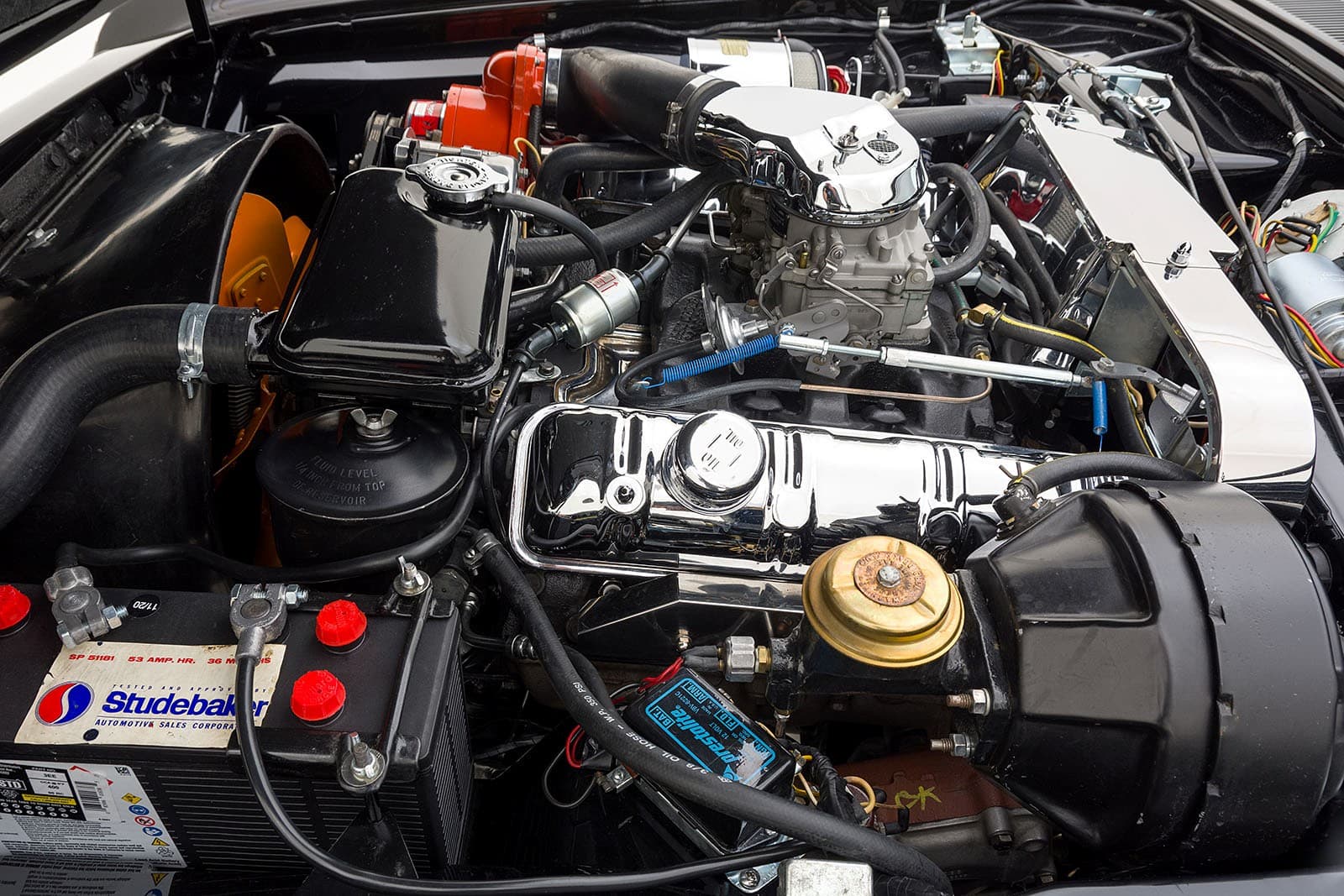 La voiture dispose des jantes en acier peintes équipées de pneus radiaux à flancs blancs étroits et des enjoliveurs Avanti adéquats. Le point fort de l’Avanti a toujours été son habitacle confortable et sophistiqué à quatre places. Cette voiture est garnie d’une combinaison attrayante et authentique d’orange avec un tableau de bord et des dessus de porte de couleur appropriée. Les garnitures de portes plissées et les inserts de siège indiquent qu’il s’agit de la “Version Regal” (une option). Le moteur V8 289ci a été salué à son époque pour ses performances impressionnantes dans les spécifications R1 avec compresseur Paxton. Il s’agit de son moteur d’origine, qui a bénéficié d’une récente reconstruction totale par un spécialiste Studebaker. Le train de roulement est tout aussi bien fini, présentant des finitions de qualité sur la suspension et les composants du châssis.