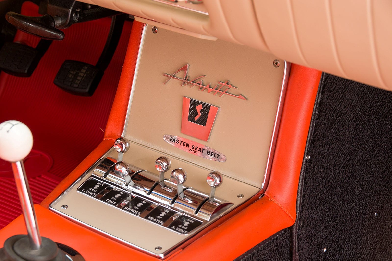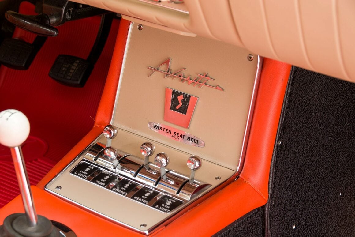Toutes les Avanti’s étaient équipées de freins à disque Dunlop à l’avant et de freins à tambour à l’arrière. Les autres options comprenaient une direction assistée, des vitres électriques, une radio AM ou AM / FM (les deux étaient des unités Delco rebaptisées), des vitres teintées, des rétroviseurs extérieurs gauche et droit “Stratovue” et une foule d’autres articles de commodité. Tous les intérieurs de 1963 étaient en vinyle bicolore, avec du fauve (un bronzage clair) sur le dessus et des couleurs telles que le noir, le turquoise, l’orange, le wapiti (brun plus foncé) ou le rouge en dessous. Les tapis étaient de style smoking “sel et poivre” (pas d’origine GM, mais similaires à ceux de la Corvette C1). En 1964, quelques fonctionnalités ont été ajoutées et l’extrémité avant a reçu des phares à lentilles carrées, remplaçant les lentilles rondes précédentes.
