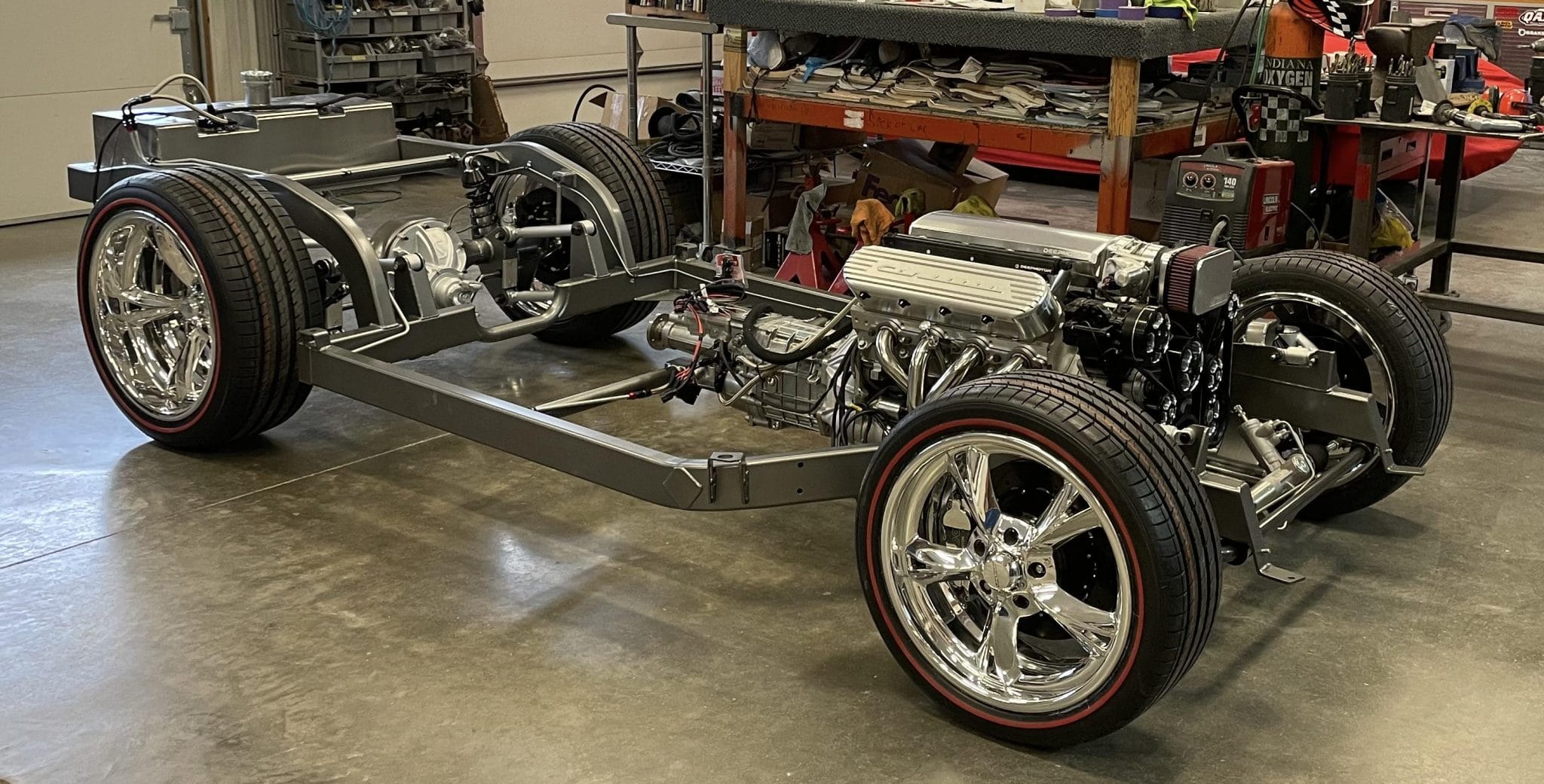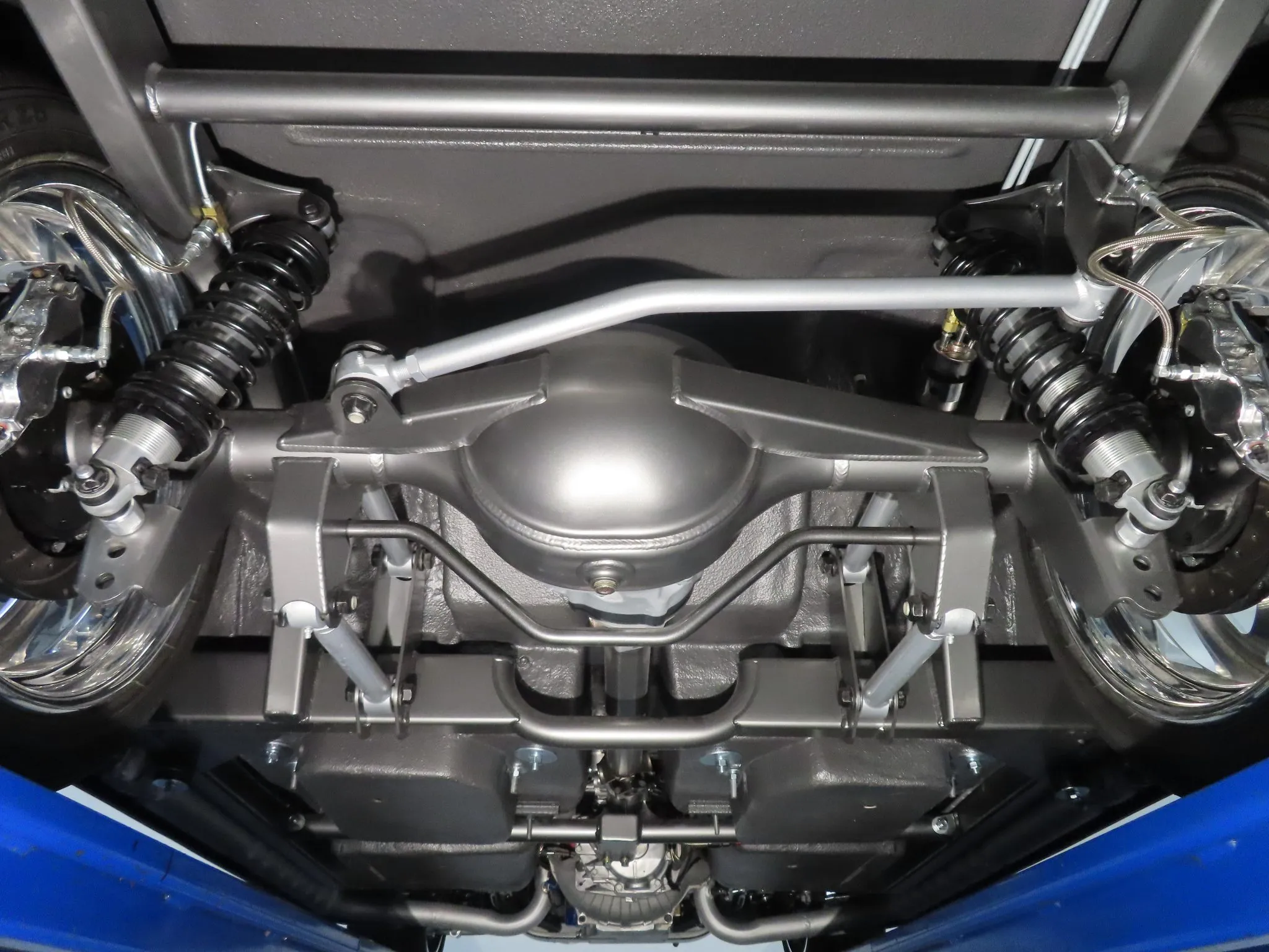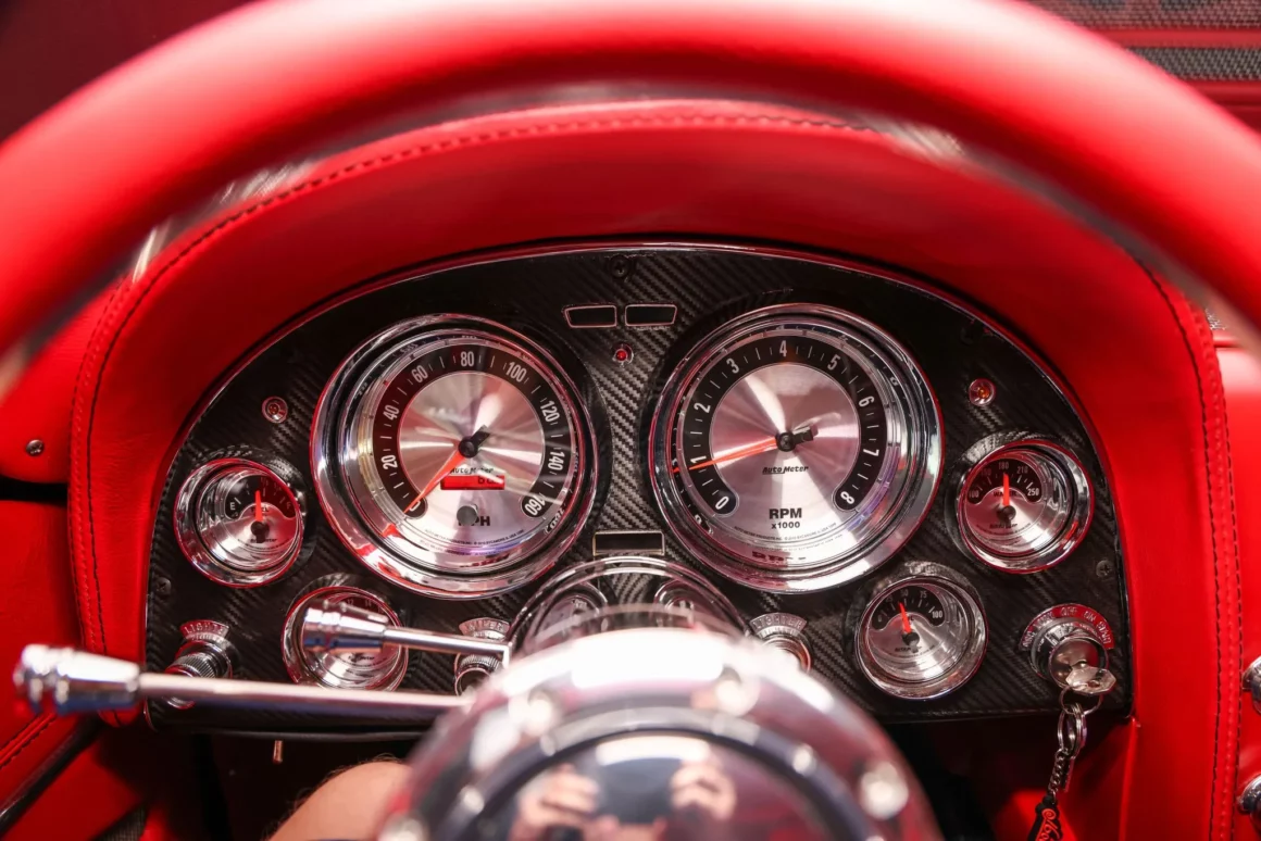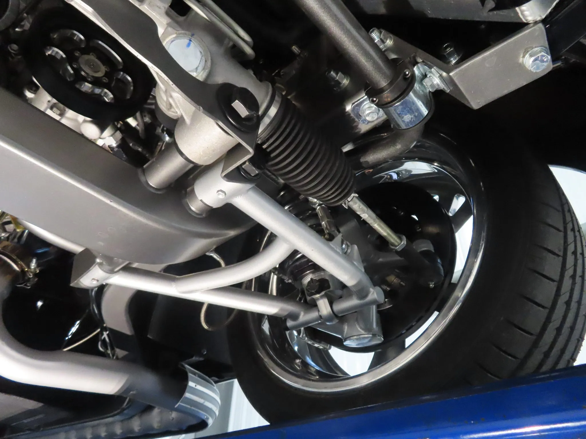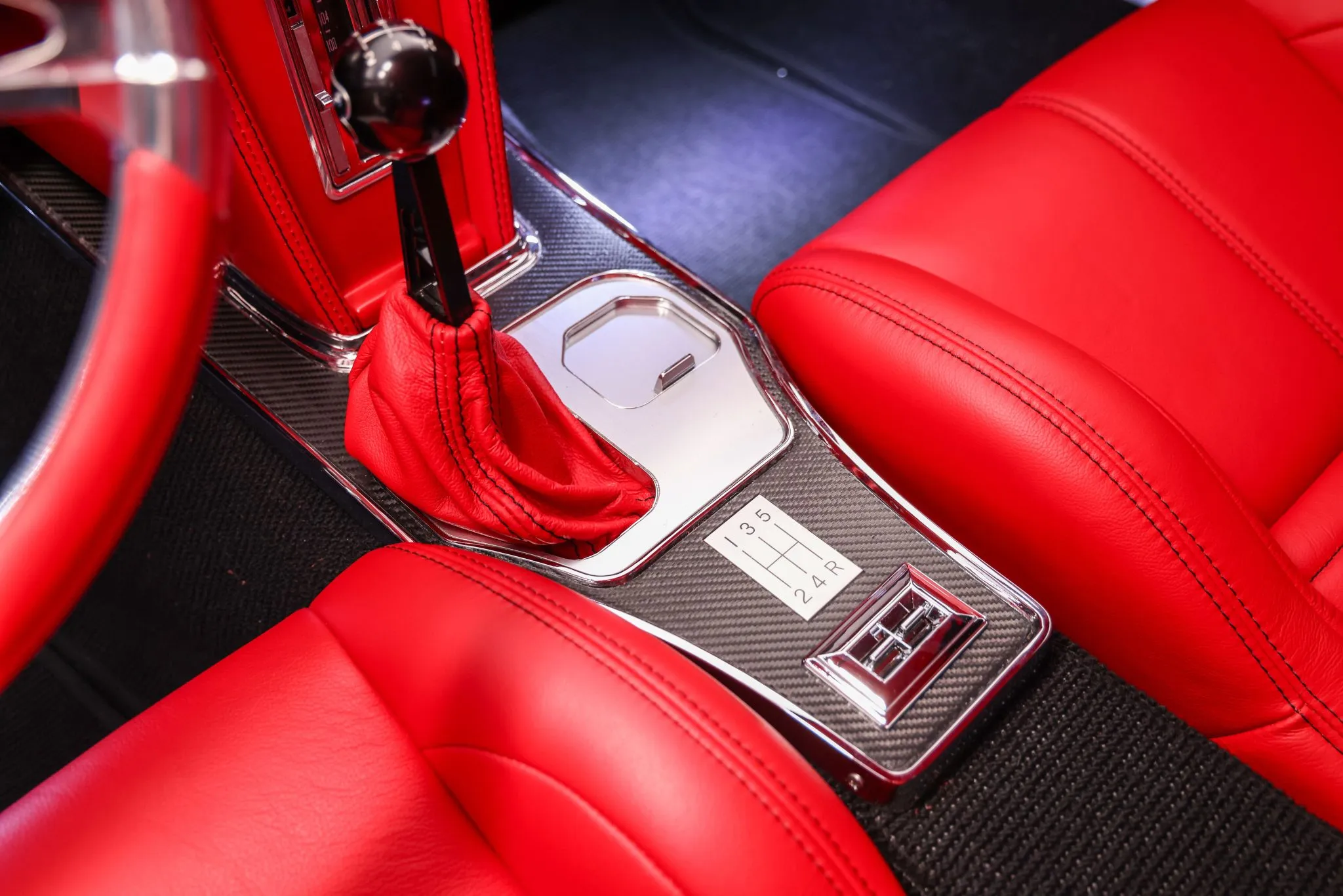 L’équipement supplémentaire comprend des sièges baquets personnalisés recouverts de cuir rouge, des compteurs AutoMeter, des caches-soupapes à ailettes de style vintage, des collecteurs d’échappement en acier inoxydable, des tuyaux d’échappement latéraux et des jantes Schott-Racing de 18po AV et 20po AR enveloppées de pneus Diamond Back redline 235/40 AV et 275/40 AR.