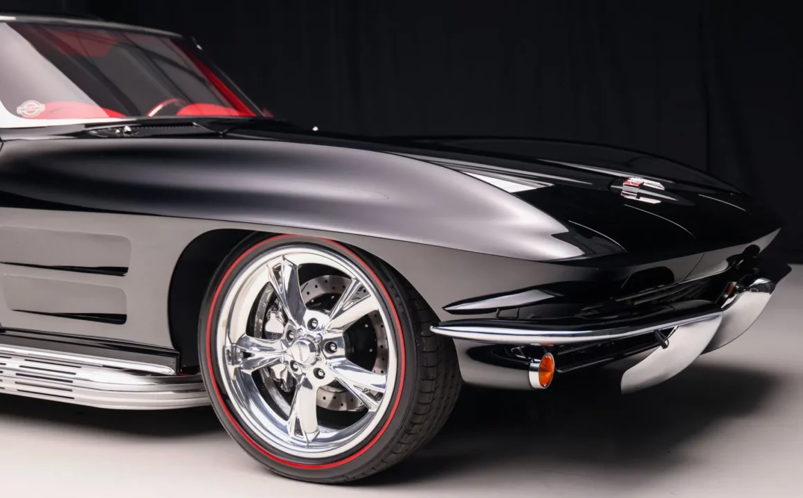 Voilà… C’est alors que votre symptôme pourra s’apaiser et que vous pourrez lire la suite de l’article et regarder la vidéo… Pour (enfin) en revenir à cette Corvette, sa carrosserie en fibre de verre a été refaite à la perfection, repeinte en noir et montée sur un châssis Art Morrison disposant de bras de suspension tubulaires à l’avant, d’une suspension arrière à quatre bras et d’amortisseurs réglables.