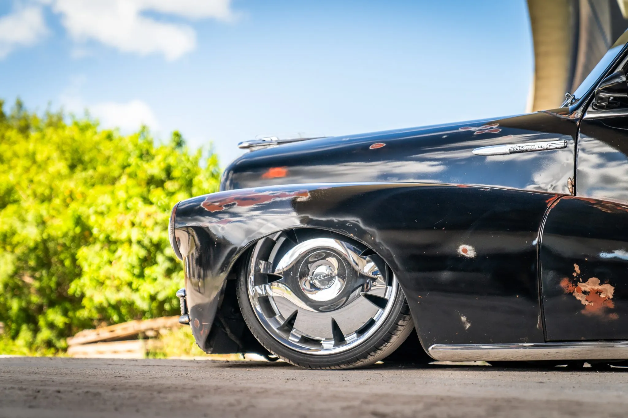 La voiture porte une finition “Destroy” imitation vieille patine et rouille de surface… L’intérieur/habitacle personnalisé comprend un revêtement en vinyle rouge, la climatisation, un siège conducteur à réglage électrique, un volant cerclé de bois, des vitres électriques et une unité “infodivertissement” compatible Bluetooth. L’équipement supplémentaire comprend des jantes Boss de 20 pouces montées avec des pneus Fullway HP108 245/30 à l’avant et 275/30 à l’arrière, des freins à disque avant et tambours arrière, une direction assistée et un système de suspension pneumatique réglable. Le numéro de châssis est partiellement illisible.