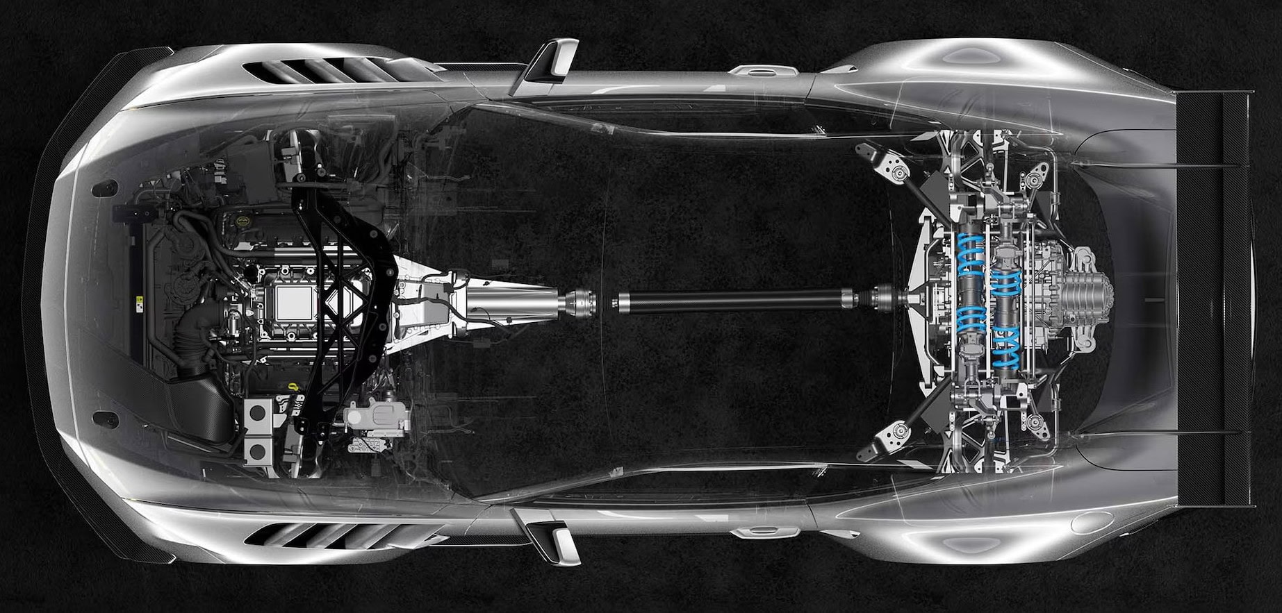 En plus de sa puissance supplémentaire, c’est un domaine où la voiture de route possède un avantage sur la Mustang GT3. L’équipe de développement de la voiture a également déplacé la transmission de l’arrière du moteur monté à l’avant vers l’arrière de la voiture pour un équilibre de poids 50/50 et une meilleure livraison du couple. Déplacer la boîte de vitesses vers l’arrière fut un problème difficile à résoudre.