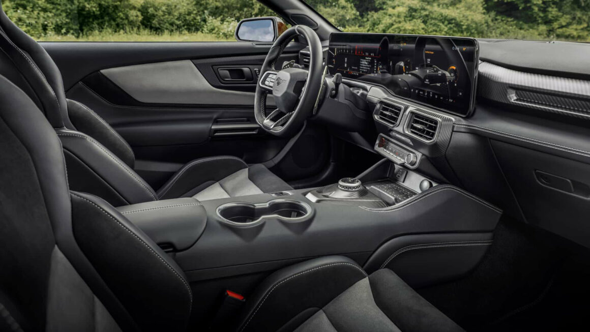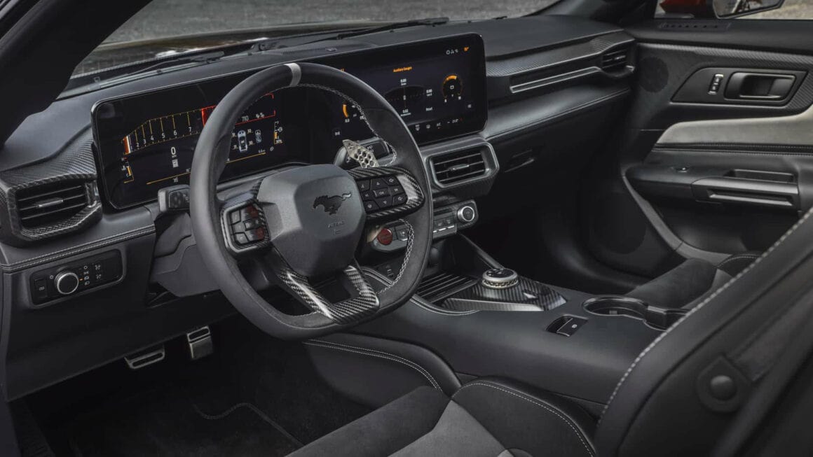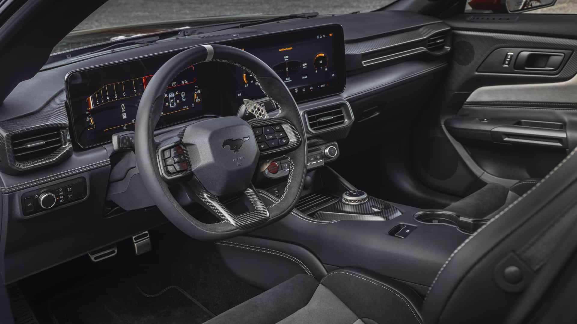 La Mustang GTD roule sur des jantes en magnésium de 20 pouces, avec des freins en carbone-céramique, un échappement en titane et des pneus Michelin R en 345 à l’avant et 375 à l’arrière. Toutes ces améliorateurs de performance devraient rendre la voiture relativement facile à conduire pour les amateurs compétents. L’intérieur de la Ford Mustang GTD 2025 n’est pas trop éloigné de la Mustang GT ou de la Dark Horse standard.