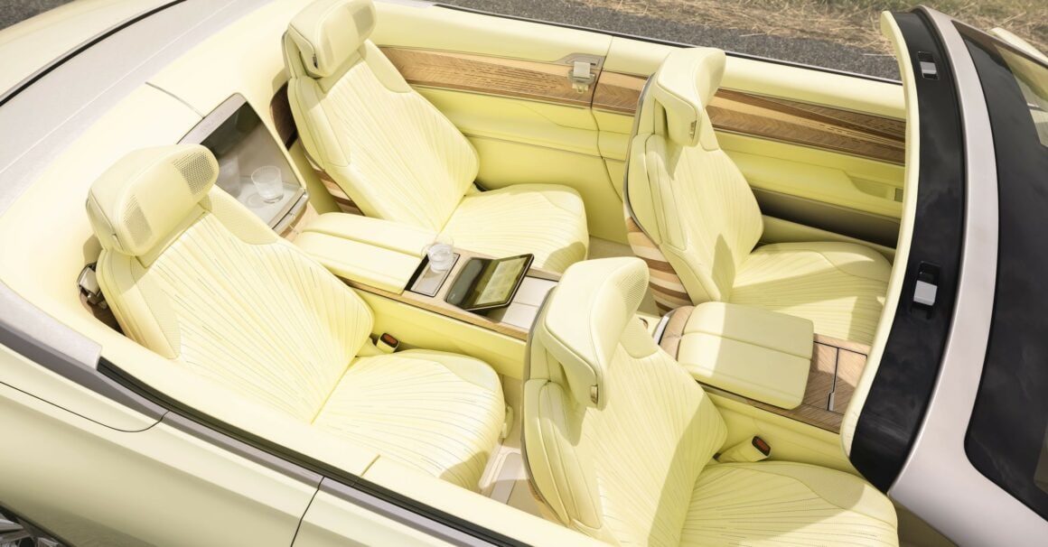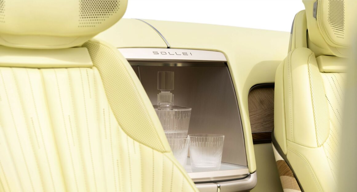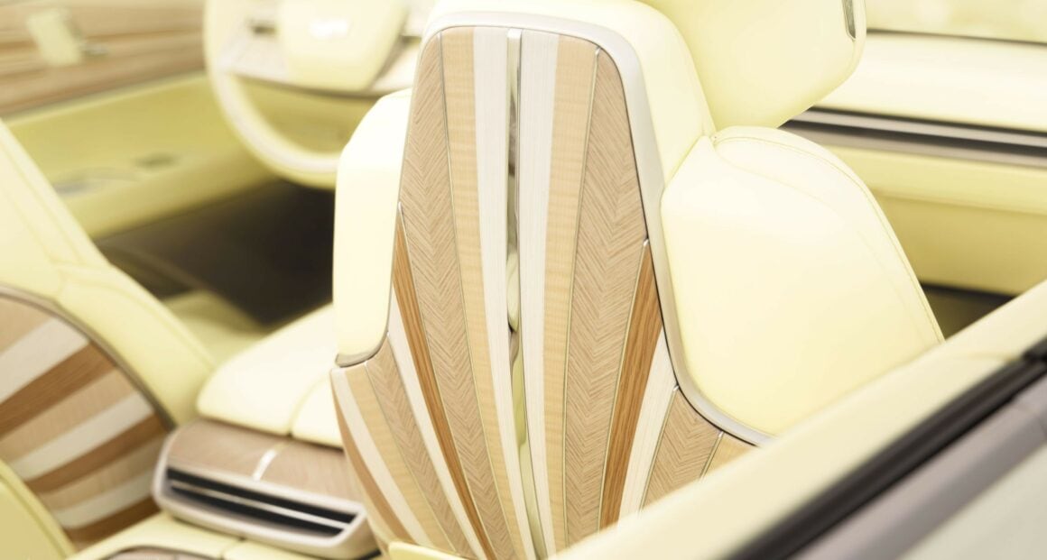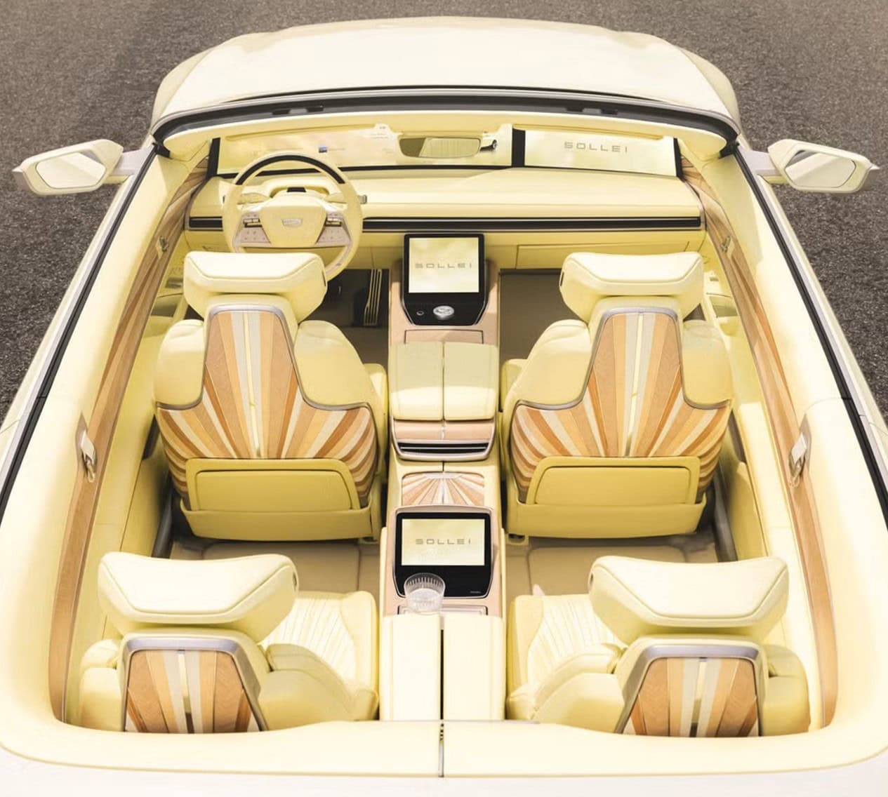 Il n’en va pas de même pour l’intérieur en cuir Nappa jaune, qui présente un pigment rose irisé dans la finition. Cela permet des teintes changeantes sous différents éclairages, rappelant les couleurs du coucher de soleil. Bien sûr, il peut être difficile de remarquer ce détail avec toutes les boiseries. La Sollei comporte cinq placages de bois différents découpés à la main sur les portes, les dossiers des sièges et les surfaces des consoles.