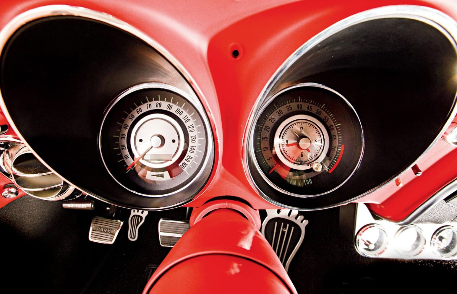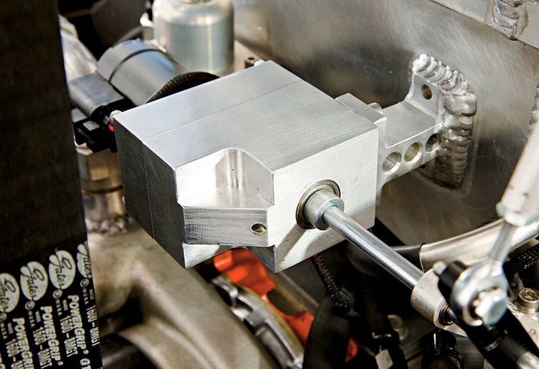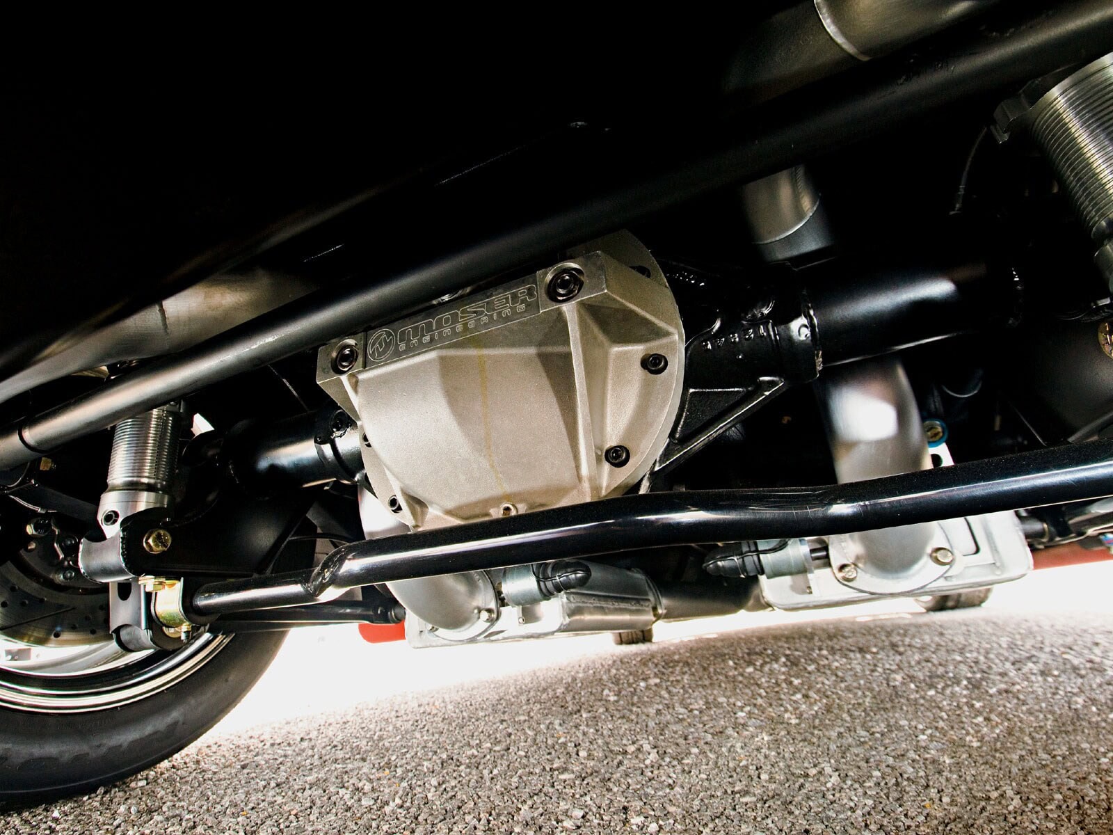 Ce que vous ne voyez pas, c’est le refroidisseur intermédiaire air-eau à la pointe de la technologie qui utilise un intermédiaire Afco et des échangeurs de chaleur de motos Hayabusa. Le tour de force technologique de Mast utilise même un arrangement d’accélérateur exclusif fly-by-wire – il est envoûtant de regarder les lames d’accélérateur du chasse-insectes Hillborn réduire automatiquement le flux d’air pour maintenir le ralenti stable. Réglé à la perfection, le Mast 427 s’allume sur commande dès le premier essai, à chaque fois. Ce groupe motopropulseur incroyablement moderne est soutenu par un triumvirat d’un matériel de transmission sévère sous la forme d’une transmission à six vitesses Tremec Magnum préparée par American Powertrain, d’un embrayage à double disque en céramique Atomic Twin et d’un arbre de transmission en acier DOM de 3 1/2 pouces. Peu d’entreprises auraient pu fournir le beefcake requis pour une LSX Blower tout en maintenant un tel degré de maniabilité, et Paul dit que c’est pourquoi American Powertrain a obtenu le feu vert. Transférer plus de 800 lb-pi de couple juste au ralenti à n’importe quel arrière et suspension serait normalement de la folie… et c’est pourquoi YearOne s’est tourné vers une Moser à 12 boulons (avec 3,73 vitesses) et une suspension arrière DSE Quadra Link. Chaque centimètre de transmission, du volant d’inertie à l’essieu, est conçu pour encaisser les coups. Peut-être plus que toute autre zone de la voiture, l’avant est ce qui sépare cet”Man” des “Boys”. Pour voir ce que nous voulons dire, imaginez simplement la même voiture avec un gros bloc tout en fer, une suspension de style stock, des freins d’origine et des skinnies 15×3. Très honnêtement, imaginer cela n’est pas trop difficile !