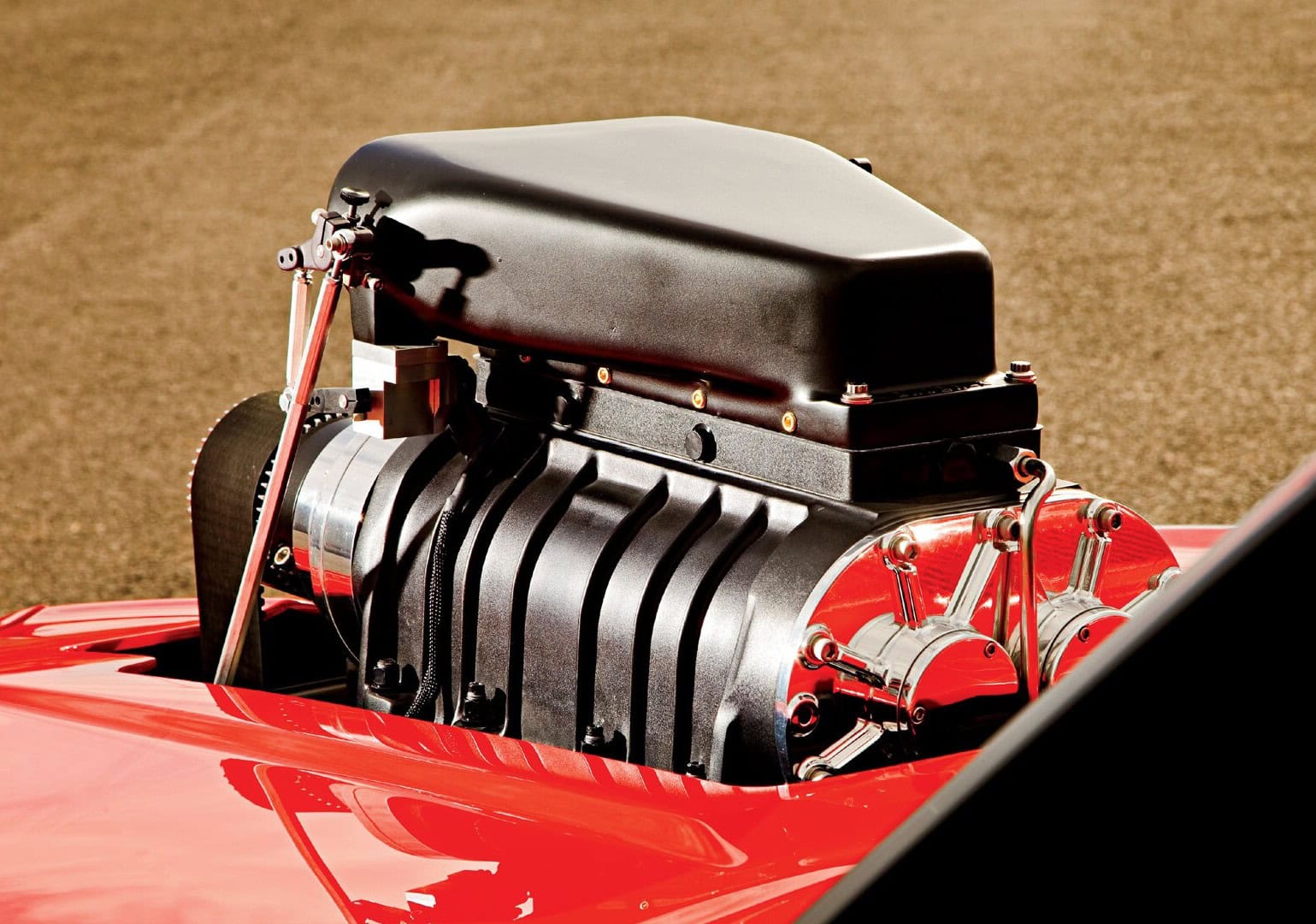 Le noyau de l’idée a rapidement grandi. Non seulement ils étaient convaincus par l’idée de reprendre tous les repères visuels du milieu des années ’70 (Blower à travers le capot, tuyaux latéraux, levier de vitesses Hurst, pédale d’accélérateur suspendue), mais ils voulaient quelque chose de contemporain du point de vue de la maniabilité et de la fiabilité… Connaître cette information donne une tournure intéressante à la comparaison Pro Street contre Pro Touring. En fait, aucun des deux styles de construction ne s’était concrétisé en 1974. Le design mixte a tour à tour suscité les éloges et le mépris des spectateurs qui l’ont vu pour la première fois au salon SEMA, où il a fait ses débuts l’automne dernier. Nous tombons dans le camp de l’amour parce que la Camaro Cherry Bomb fait à peu près tout ce que nous pourrions demander à un Hot Rod de faire : elle brûle ses pneus, elle tourne sur place, elle s’arrête pile et elle pousse l’adrénaline au max de nos boutons de nostalgie. De plus, la Cherry Bomb Camaro jette à la ferraille les plus grandes violations de style des années ’70. Pas de passages de roue arrondis, pas de pneus dépassant des passages de roue, pas de traitements graphiques insignifiants et pas d’abus de chrome. Par-dessus tout, c’est le moteur qui fait la plus grande déclaration d’amour, et pour cela, YearOne s’est tourné vers Mast Motorsports. Au lieu d’un gros bloc à carburateurs, YearOne et Mast ont opté pour un Blower LSX… La 427 à injection électronique développe 830cv à indice d’octane 93 à 10 psi de suralimentation, et ressemble à une Oro-Street, grâce à un Blower Shop 8-71.