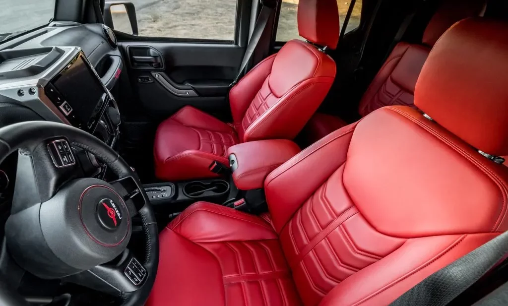 Ce qui est peut-être une légère déception lorsque l’affichage numérique du tableau de bord à l’ancienne indique toujours “Jeep” lorsque vous démarrez le moteur. D’un autre côté, cela signifie que vous pouvez entretenir votre “Tank-Rezvani” chez n’importe quel concessionnaire Jeep. Ce Tank est comme un jouet Tonka géant, de la meilleure des façons. Le blindage des portes signifie qu’elles pèsent 140 kg chacune, de sorte que vous risquez de tirer votre bras hors de sa douille corporelle en les ouvrant, et aussi de vous briser un genou, le moindre mal étant de vous coincez douloureusement la jambe lorsque la porte se referme automatiquement d’elle-même… Toutes les portes sont ainsi équipées… Une fois que vous aurez franchi ces “difficultés” (ou ignoré la douleur), vous vous rendrez compte que l’intérieur est 30% plus petit qu’une Jeep Wrangler.