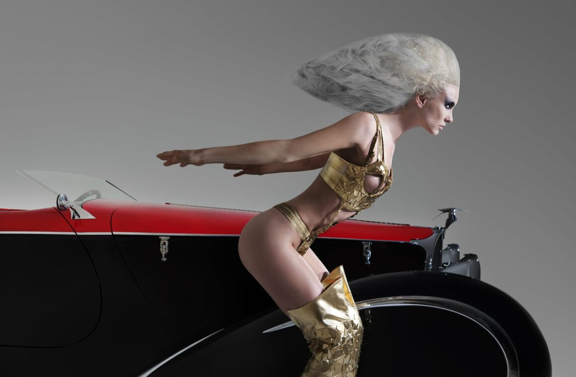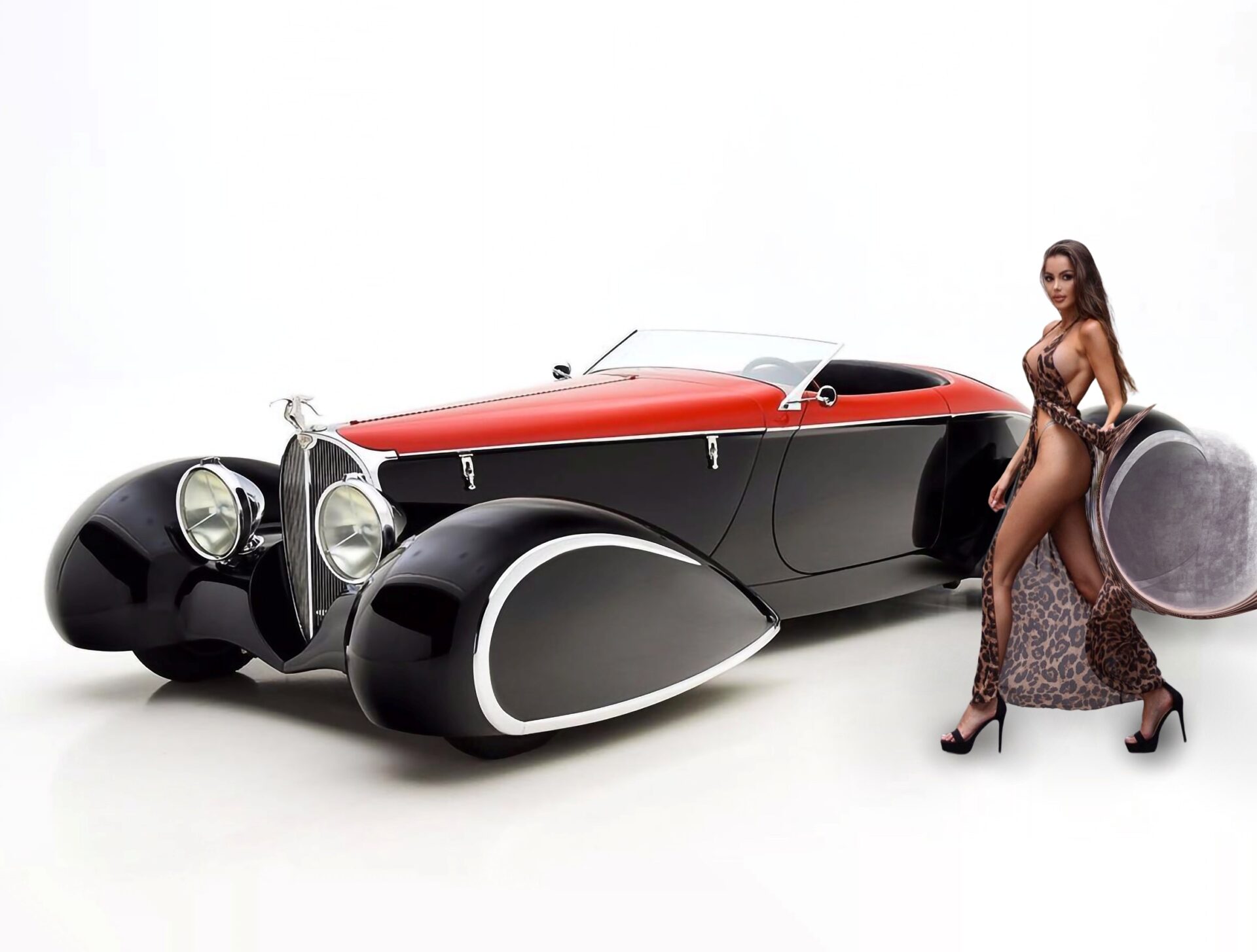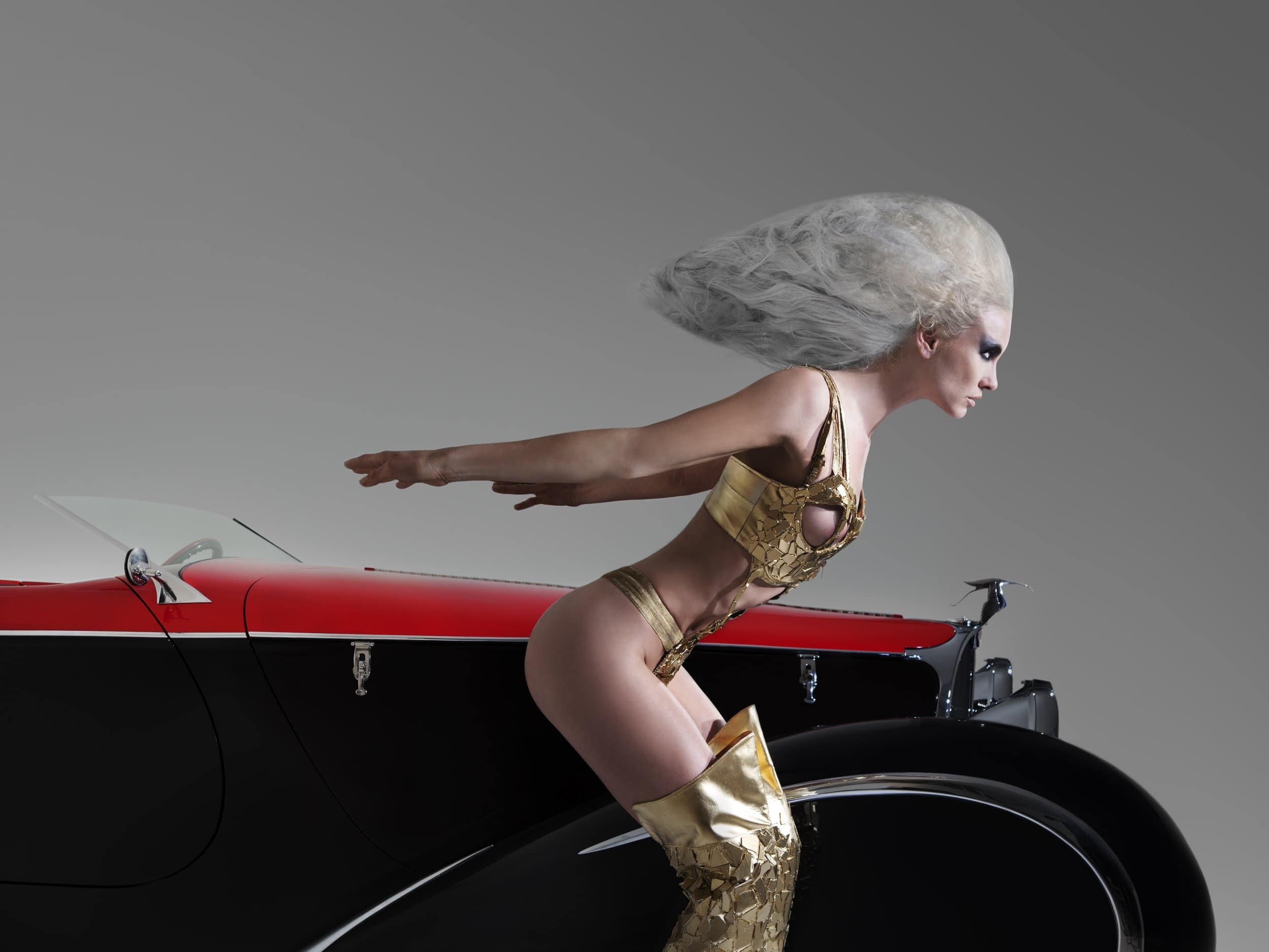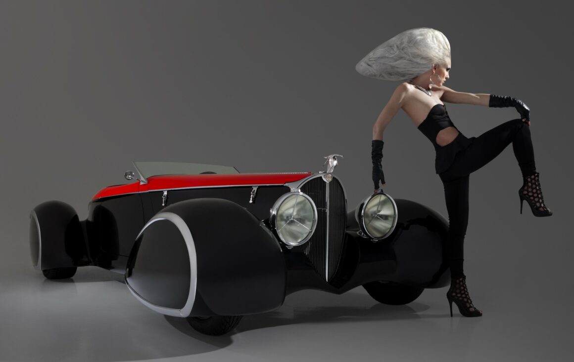 Inspirée par la combinaison du style classique Auburn, Delahaye et Bugatti, la Bugnaughty (ici présentée) intègre les designs et caractéristiques intemporelles des plus belles voitures du monde sur une seule plate-forme. Les conceptions originales de la carrosserie Auburn Boat-tail Speedster de 1929-’36 provenaient d’Alan Leamy et de Gordon Buehrig, Vince Gardner…. Chip Foose s’en est inspiré pour la carrosserie en fibre de verre pour Deco Rides 1999. Les ailes ponton entièrement fermées ont été inspirées de celles apparaissant à l’origine sur une Type 1935 Figoni & Falaschi Delahaye de 135.