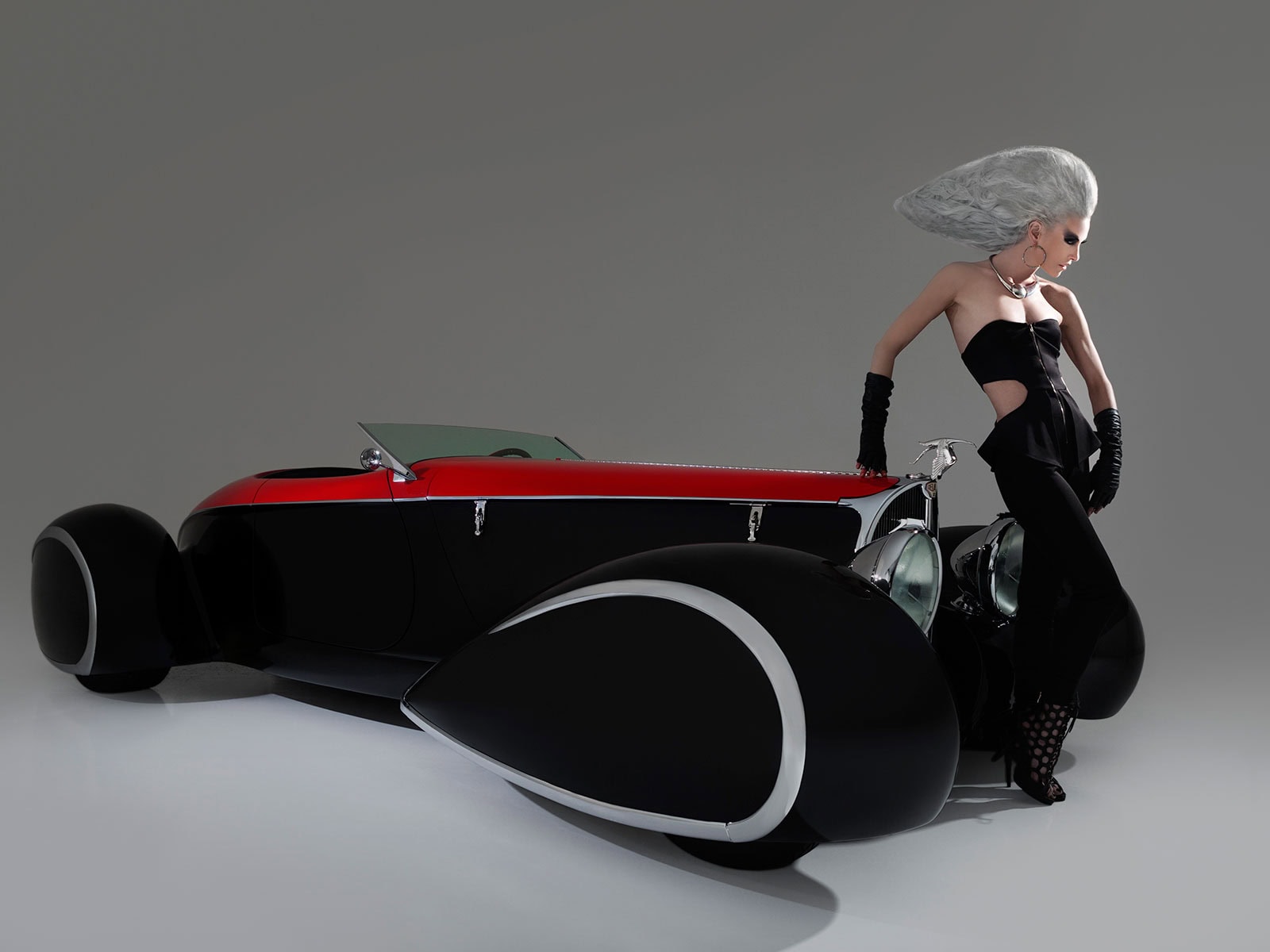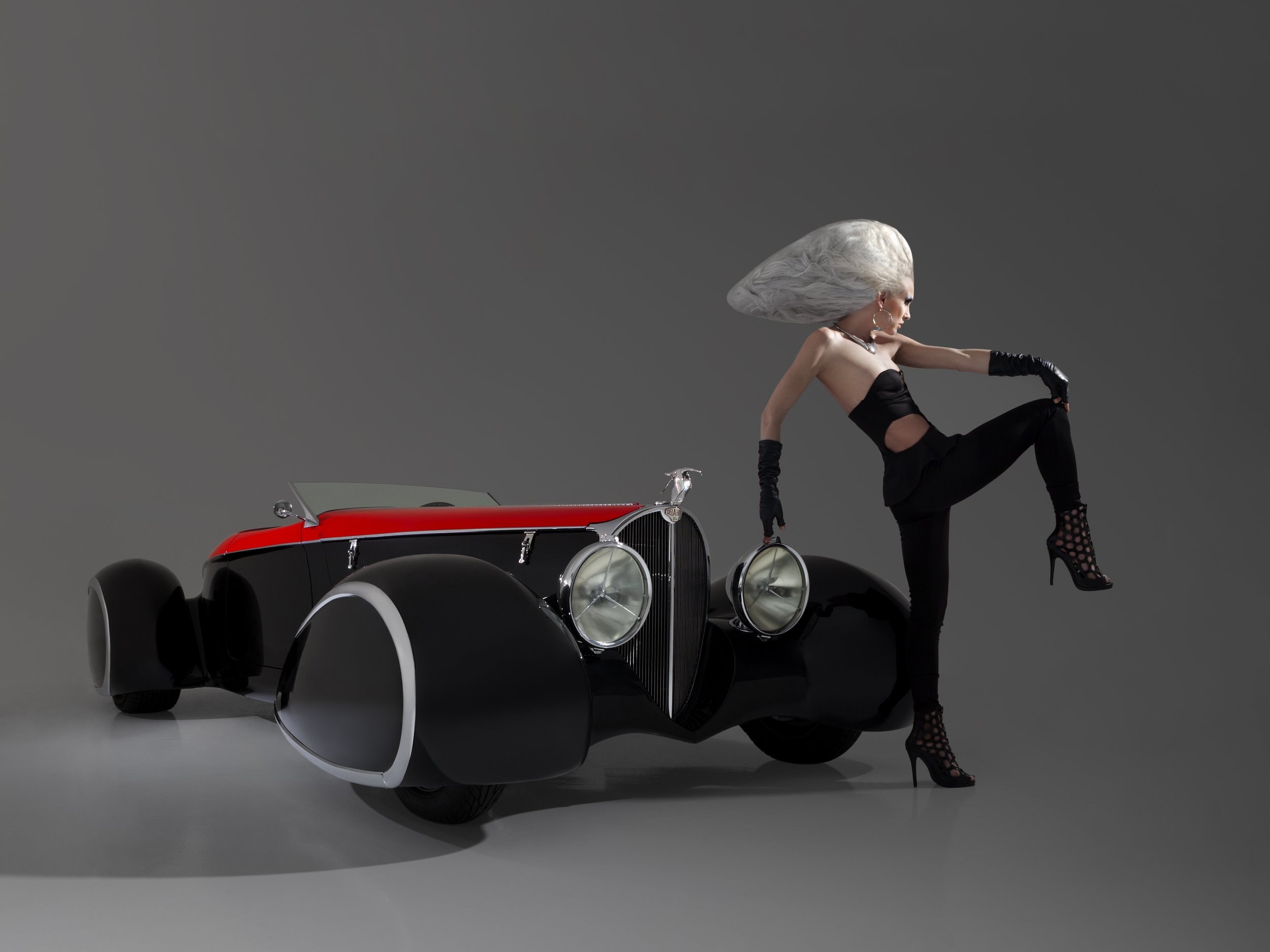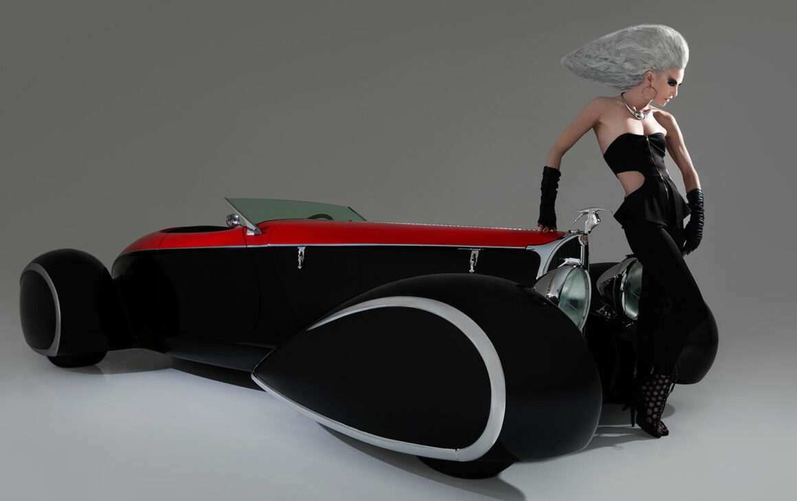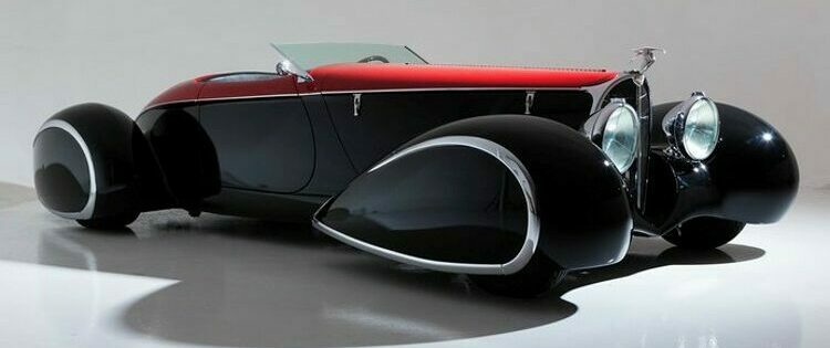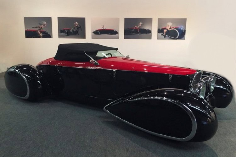Mais refusant de réaliser des Rat Rods qui sont de l’anti-Kulture, à commencé à construire selon l’influence européenne. Par exemple, l’extraordinaire Bugatti Type 1939 “Shah of Persia’57” avec une carrosserie du carrossier Achille Vanvooren. Les autos personnalisées américaines abaissées étaient déjà classiques en 1995. Cette voiture se distinguait par quatre ailes de style “ponton” qui étaient entièrement fermées (on ne voit pas les roues). D’autres belles voitures profilées de cette époque qui comportaient des ailes de roue fermées étaient des coupés Talbot Lago Teardrop de Figoni & Falaschi…
