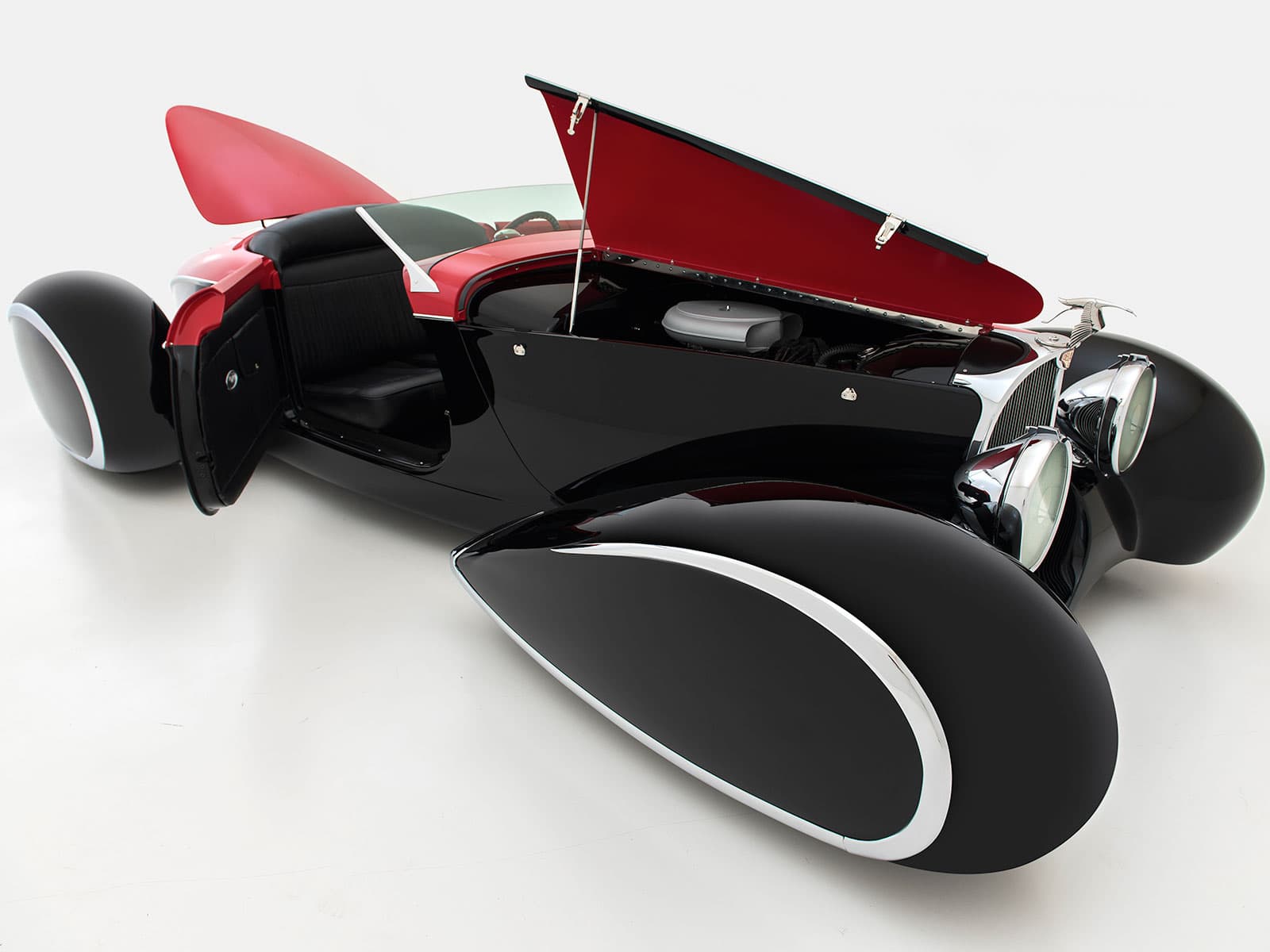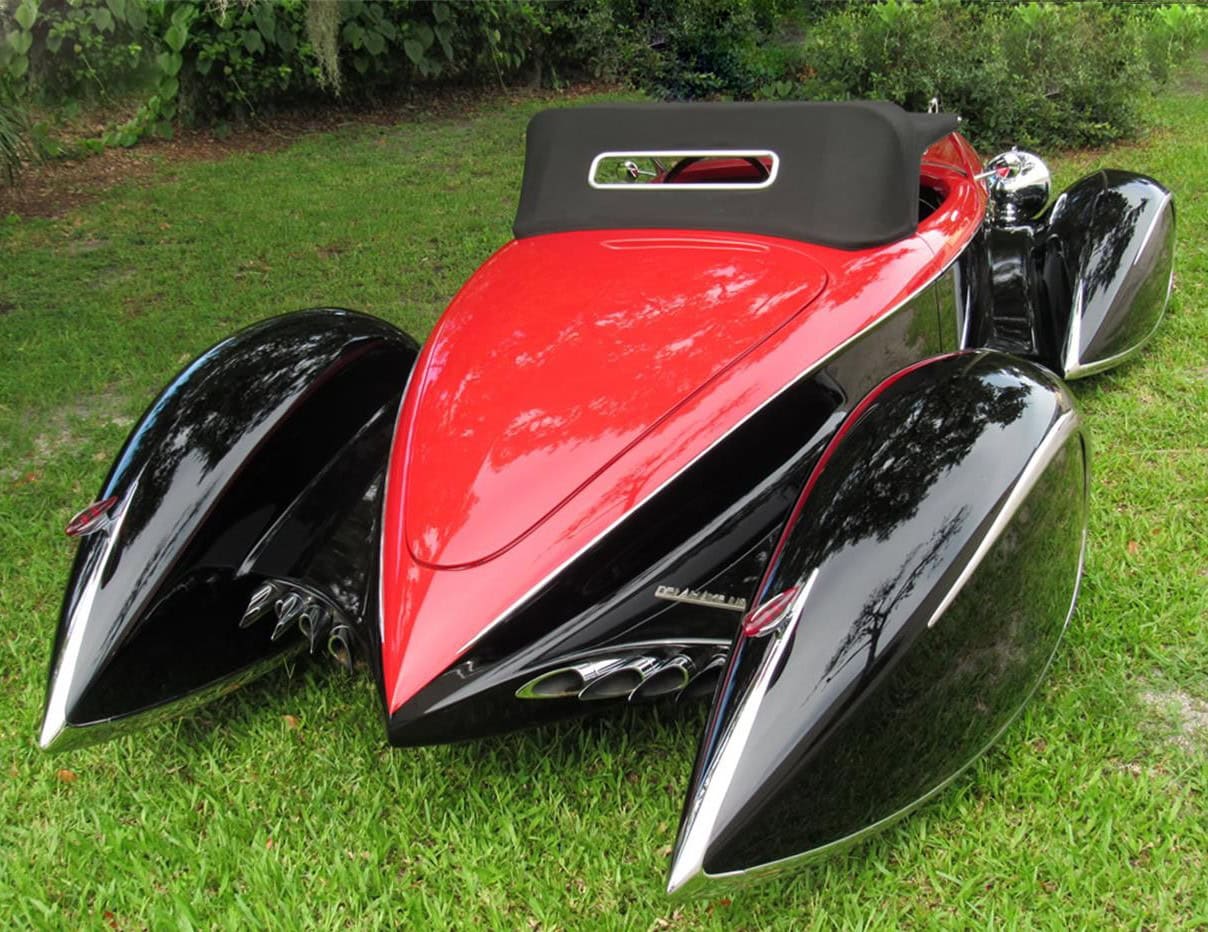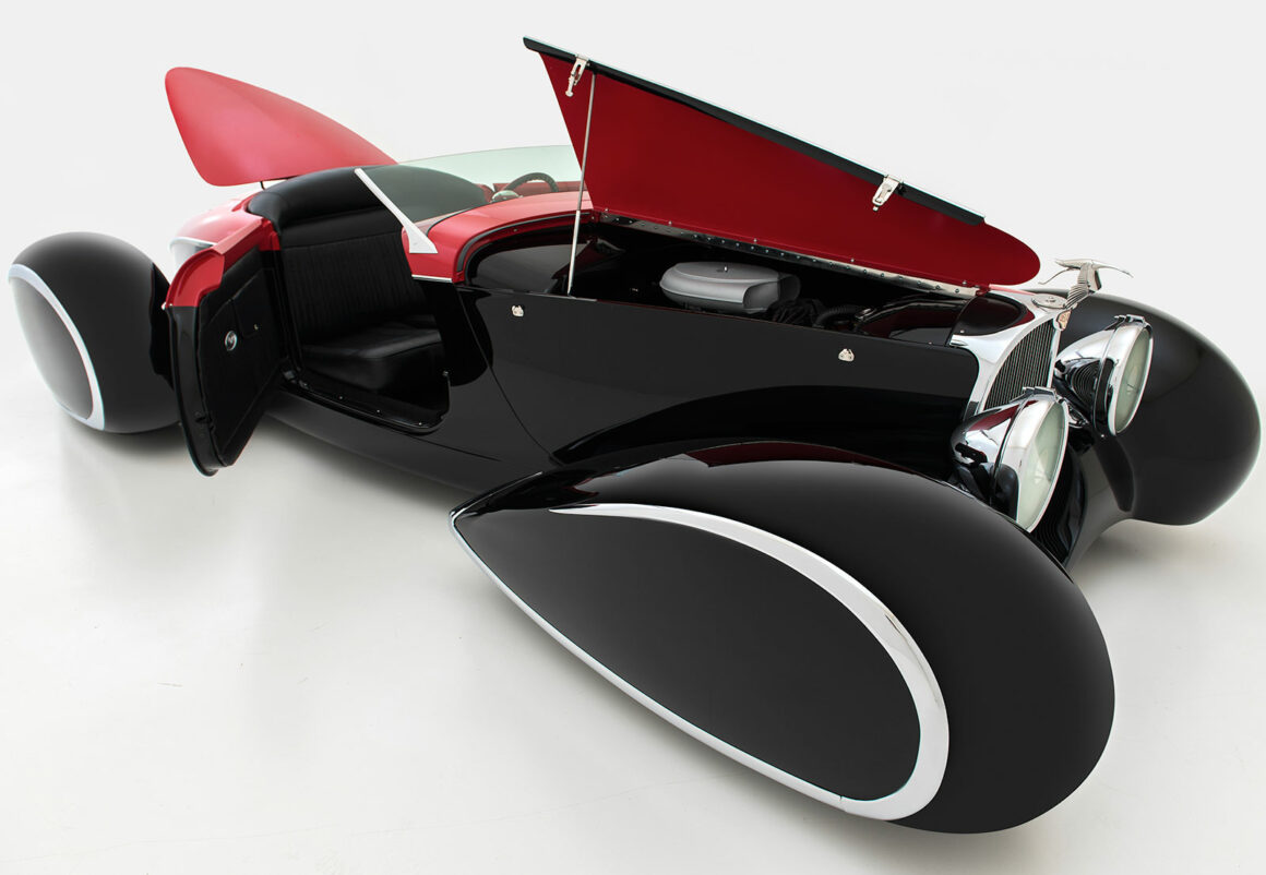 C’est l’un des nombreux détails qui donnent de l’éclat à cette automobile unique en son genre. La bête est à vendre 250.000 $… (Peinture par House of Kolor, Blueblood Red et S2BC25 jet black. Construit et peint par Brown’s Metal Mods, Port Leyden, NY. Placage chromé par Mark Silich de The Finishing Touch, Chicago, IL Intérieur en cuir par Murad de Dixie Auto Upholstery, Dayton OH. Châssis par Fat Man Fabrications, Mint Hill, Caroline du Nord. Tableau de bord par Don « The Egyptian » Boeke, Dayton, OH. Ornement de cigogne Hispano Suiza et feux arrière Hudson par American Arrow of Clawson, MI).