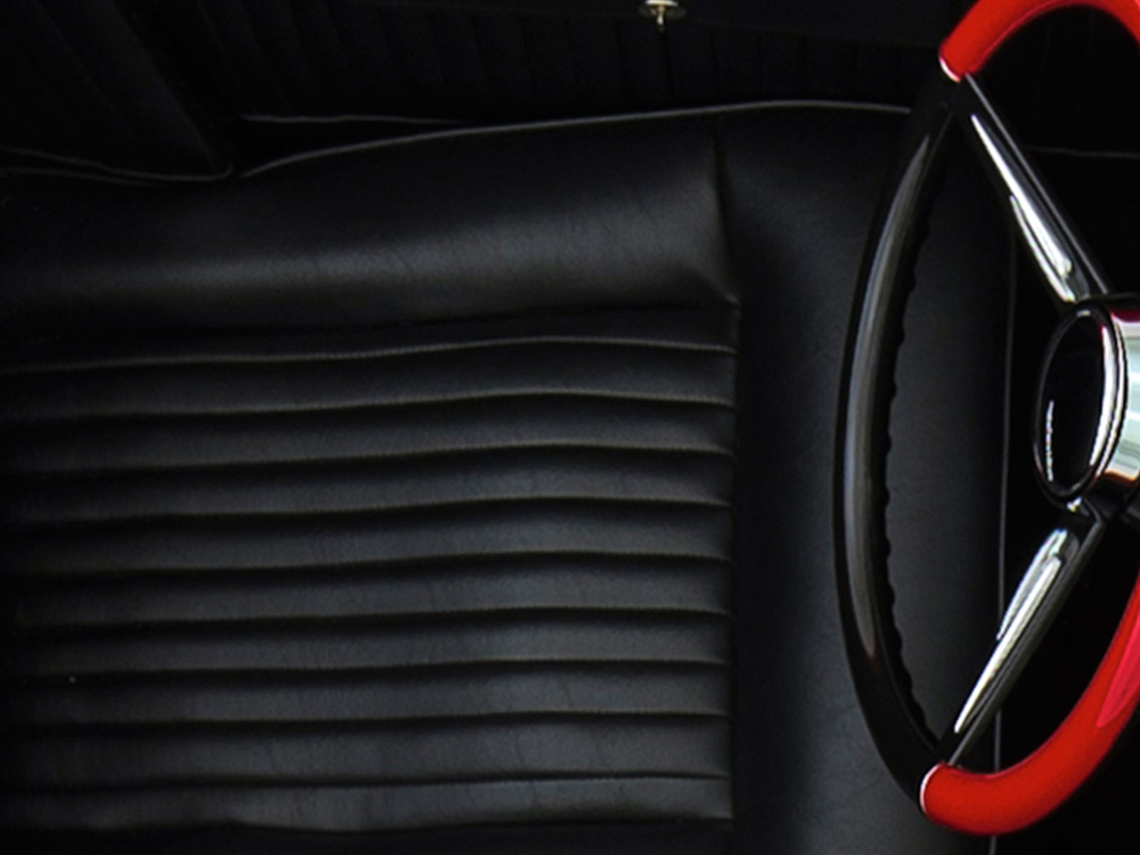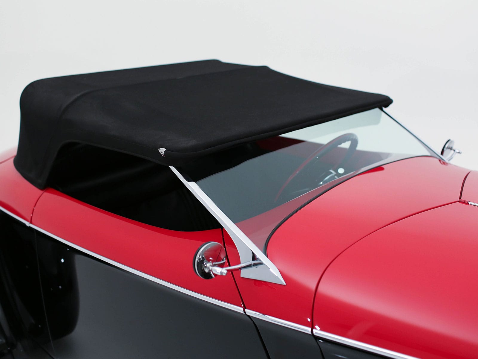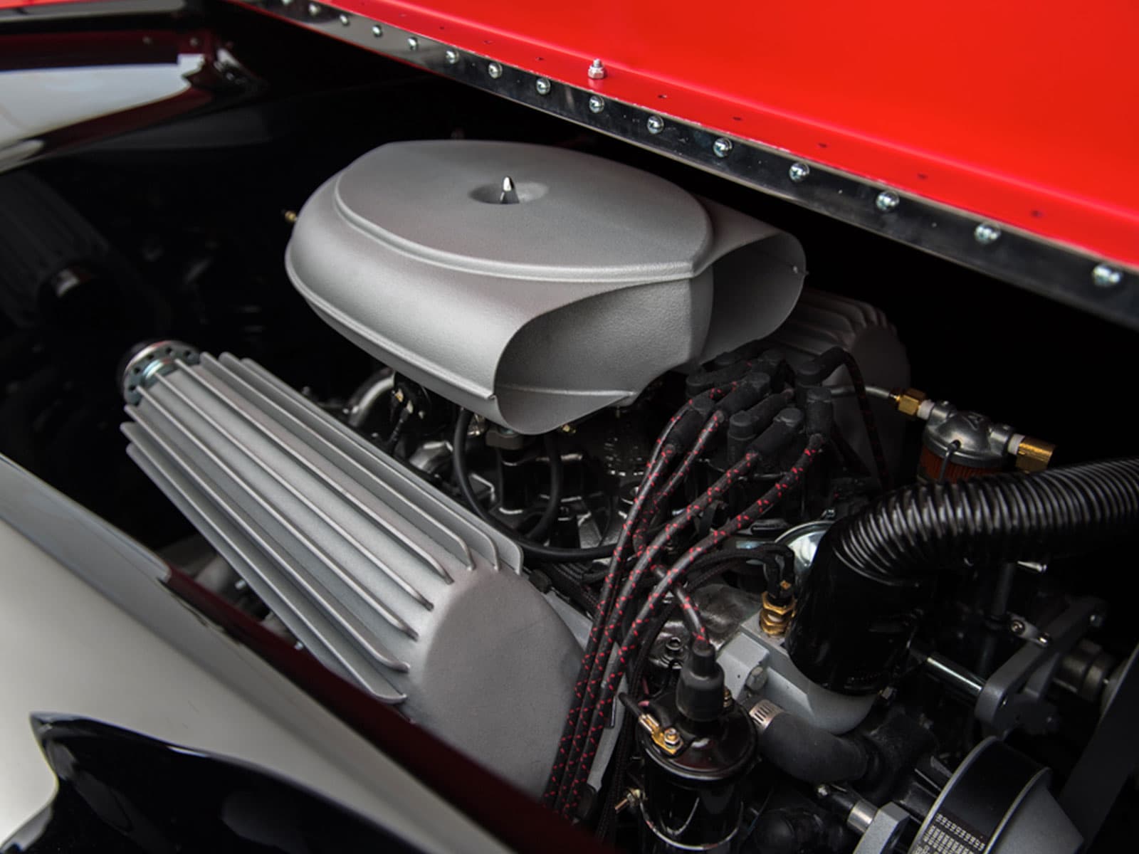 C’est l’un des nombreux détails qui donnent de l’éclat à cette automobile unique en son genre. La bête est à vendre 250.000 $… (Peinture par House of Kolor, Blueblood Red et S2BC25 jet black. Construit et peint par Brown’s Metal Mods, Port Leyden, NY. Placage chromé par Mark Silich de The Finishing Touch, Chicago, IL Intérieur en cuir par Murad de Dixie Auto Upholstery, Dayton OH. Châssis par Fat Man Fabrications, Mint Hill, Caroline du Nord. Tableau de bord par Don « The Egyptian » Boeke, Dayton, OH. Ornement de cigogne Hispano Suiza et feux arrière Hudson par American Arrow of Clawson, MI).