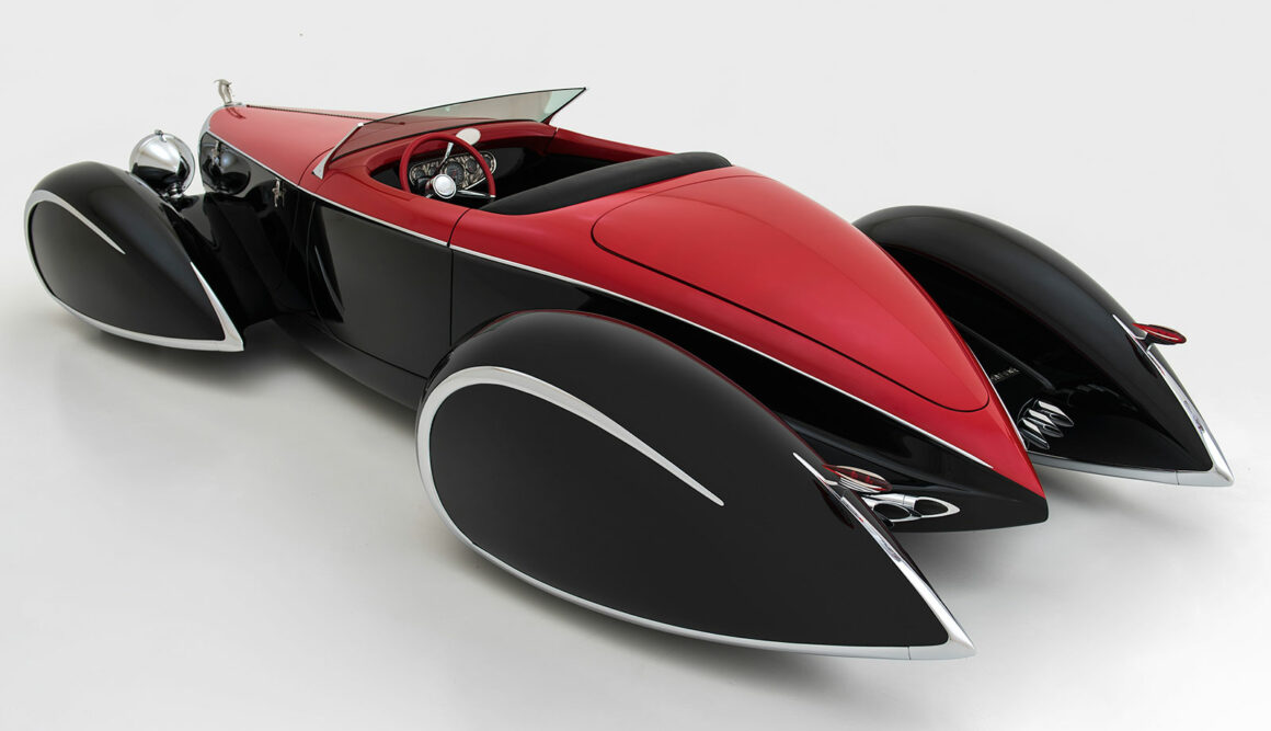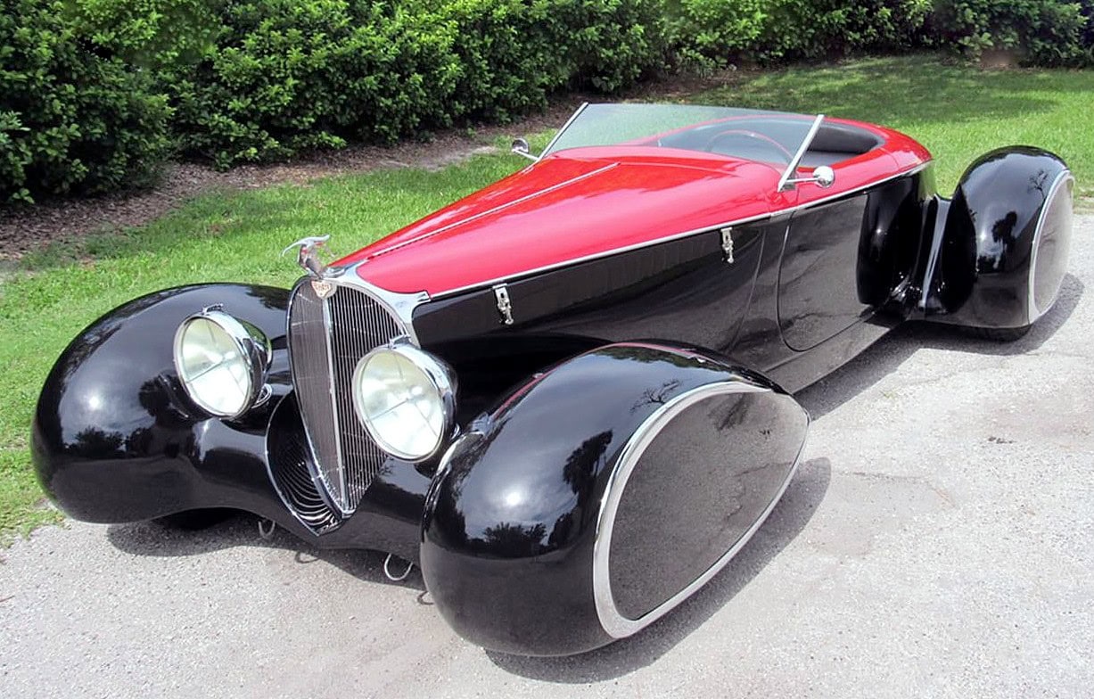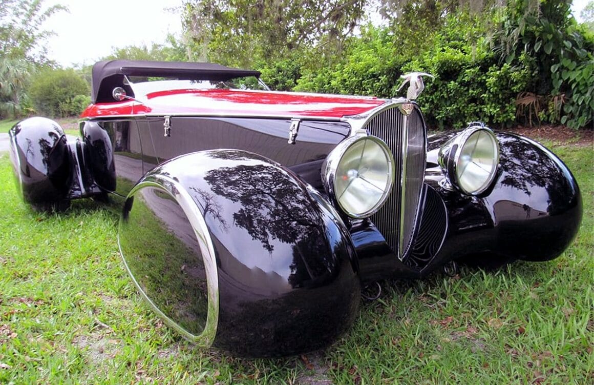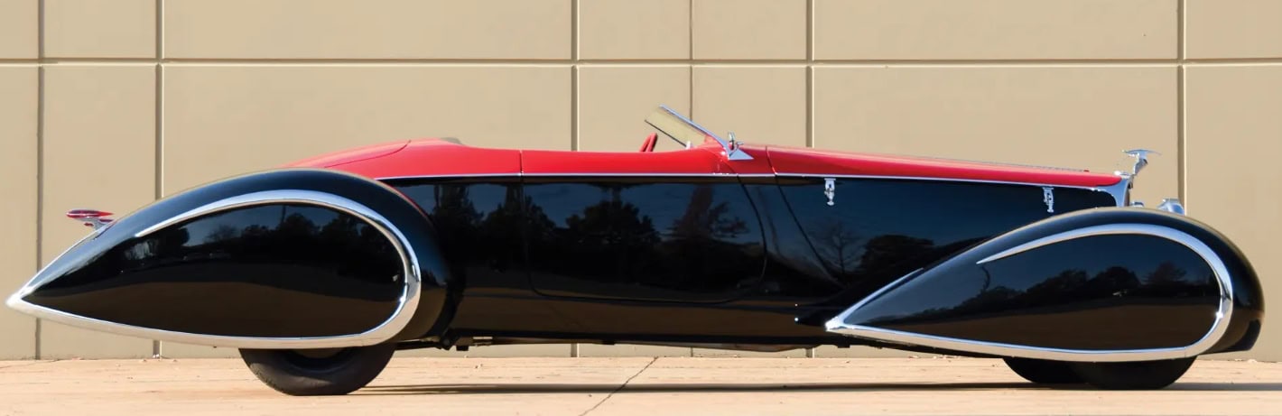 Egalement des Delahayes F & F 135M et deux Delahayes Type 165 1939 de Figoni. Peut-être la première voiture à ailes ponton fermée était la Mercedes 1935 500K profilée Erdman & Rossi. Les Allemands essayaient de rationaliser pour améliorer l’aérodynamique afin d’améliorer l’économie de carburant. Beaucoup sont totalement et désespérément accrochés et fascinés par les ailes pontons en tant que style. Par conséquent, pour Delahaye USA, les pontons joueraient un grand rôle. Alors que le Speedster original Generation One Deco Rides Boattail avait des passages de roue ouverts.