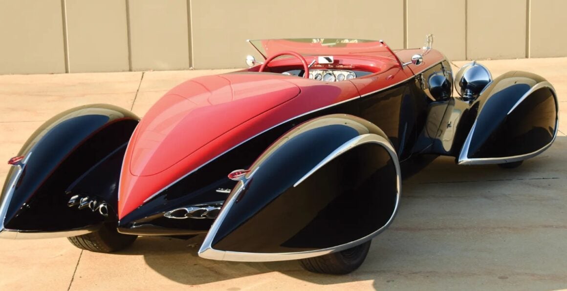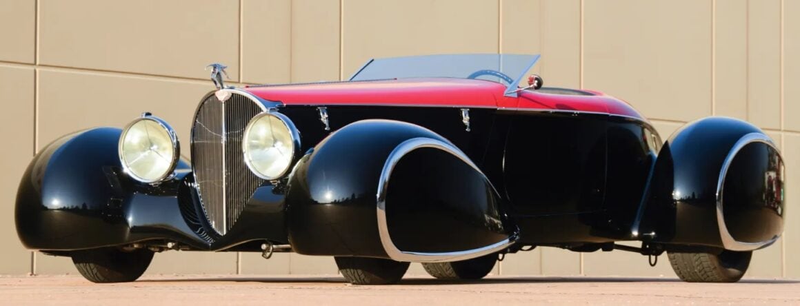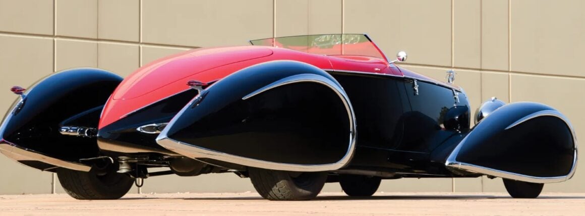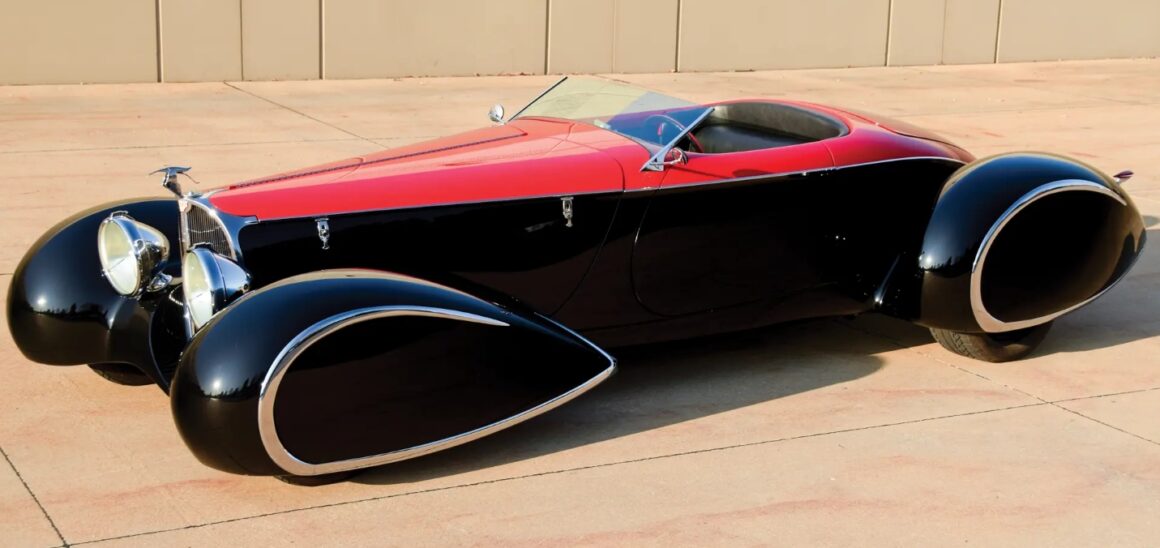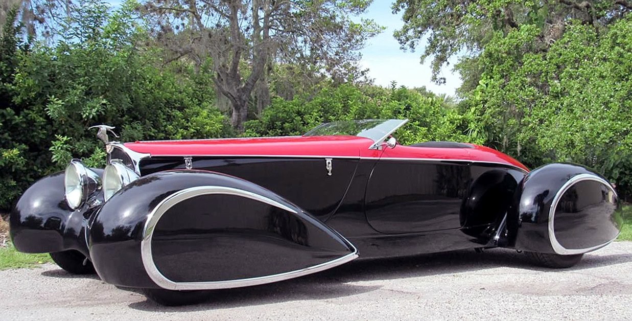 Egalement des Delahayes F & F 135M et deux Delahayes Type 165 1939 de Figoni. Peut-être la première voiture à ailes ponton fermée était la Mercedes 1935 500K profilée Erdman & Rossi. Les Allemands essayaient de rationaliser pour améliorer l’aérodynamique afin d’améliorer l’économie de carburant. Beaucoup sont totalement et désespérément accrochés et fascinés par les ailes pontons en tant que style. Par conséquent, pour Delahaye USA, les pontons joueraient un grand rôle. Alors que le Speedster original Generation One Deco Rides Boattail avait des passages de roue ouverts.