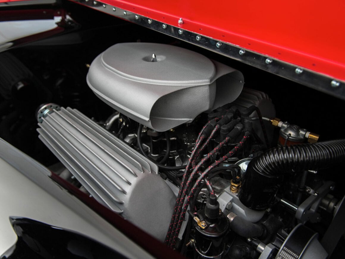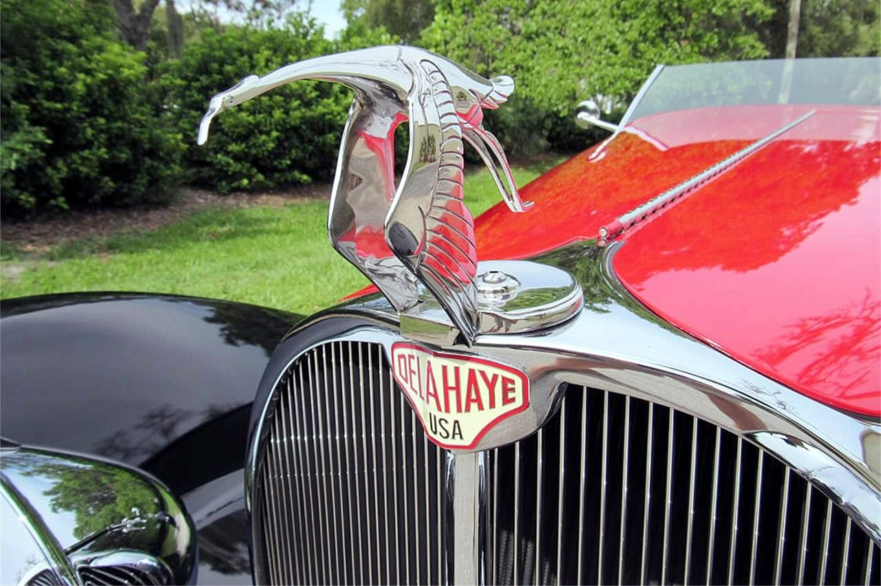Il comportait des pontons individuels qui couvraient les pneus mais étaient “flottants” et non connectés à la carrosserie de la voiture. Les phares pivotaient et tournaient avec les minces roues avant. Une astuce utilisée sur cette voiture a été de monter un ensemble de vraies cache soupapes Ferrari V-12 recouvertes en camouflage d’un moteur Ford small bloc. Juste pour s’amuser avec les voitures… Vous avez peut-être remarqué que les créations de Delahaye USA se distinguaient par un surnom humoristique ? C’est parce que leur point de vue est que toutes les vieilles voitures sont amusantes…