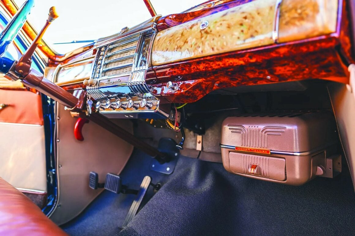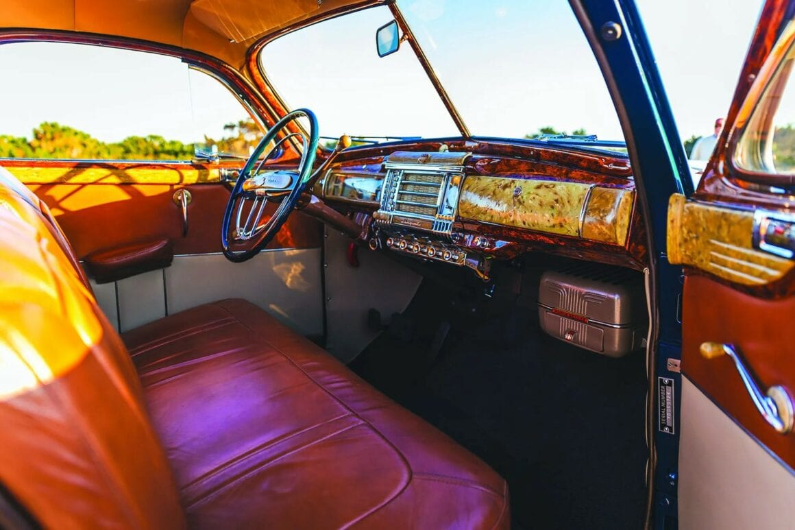 Pourtant, comme il s’agit d’une Chrysler, celle-ci est un bureau roulant joliment garni pour un homme d’affaires qui aurait autrement fini par conduire une Plymouth dépouillée pour des voyages de vente, cette Royal a même des jupes d’aile en option. “Le fait qu’il s’agisse d’un modèle de 1942 rend la voiture beaucoup plus intéressante et plus rare. Peu de temps après la construction de cette voiture, la production s’est arrêtée. Le modèle de 1942 est exactement ce que je voulais obtenir en raison de sa rareté”... Peu de temps après, le niveau d’équipement automobile disponible a commencé à diminuer rapidement une fois que l’industrie a commencé à passer à la production de guerre. Les garnitures chromées ont discrètement cessé d’être produites. Sous le long capot de cette Chrysler se découvre un 250ci six cylindres en ligne à tête en L qui affichait une puissance nominale d’usine de 120cv et un couple de 200 lb-pi.