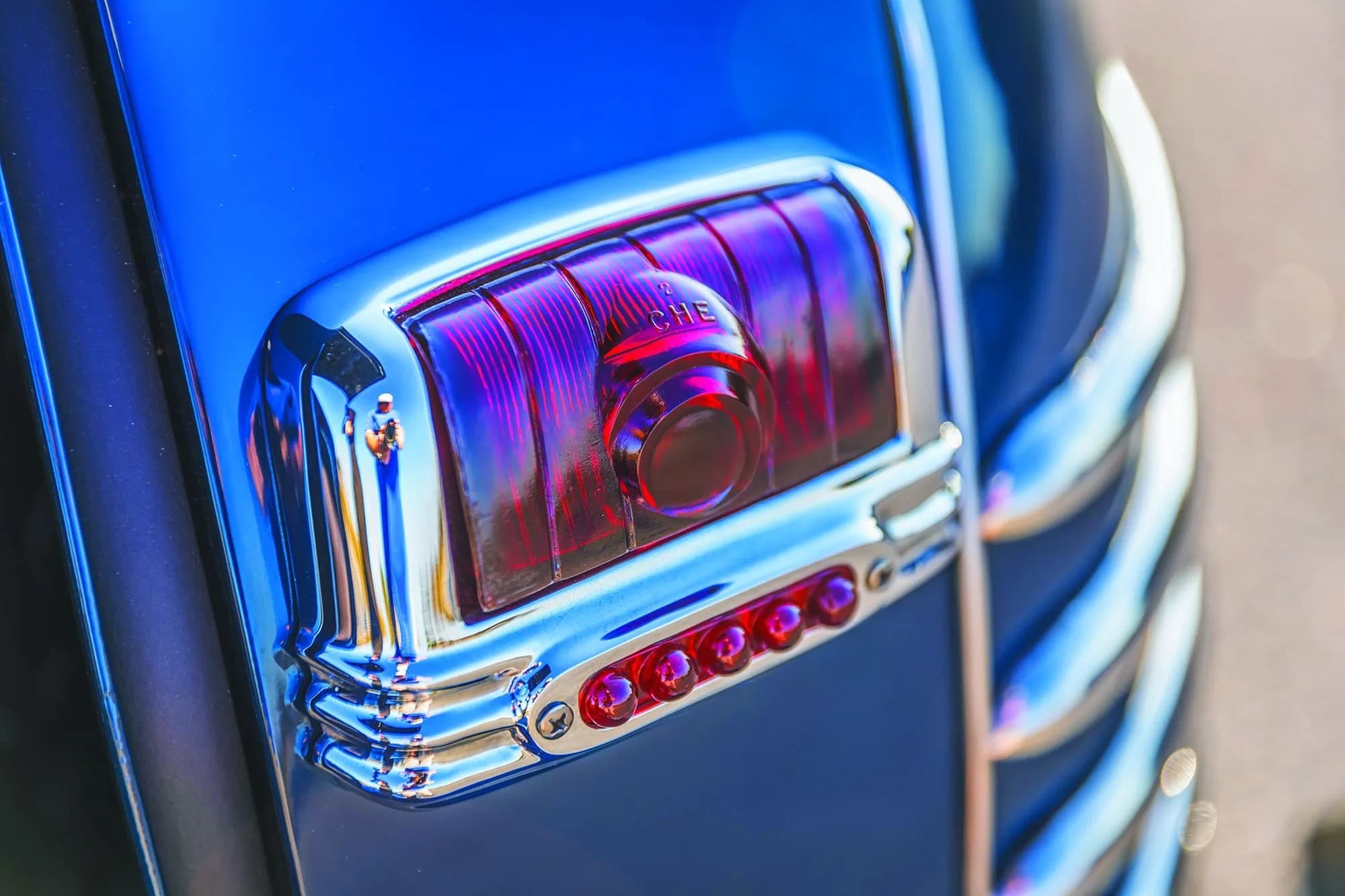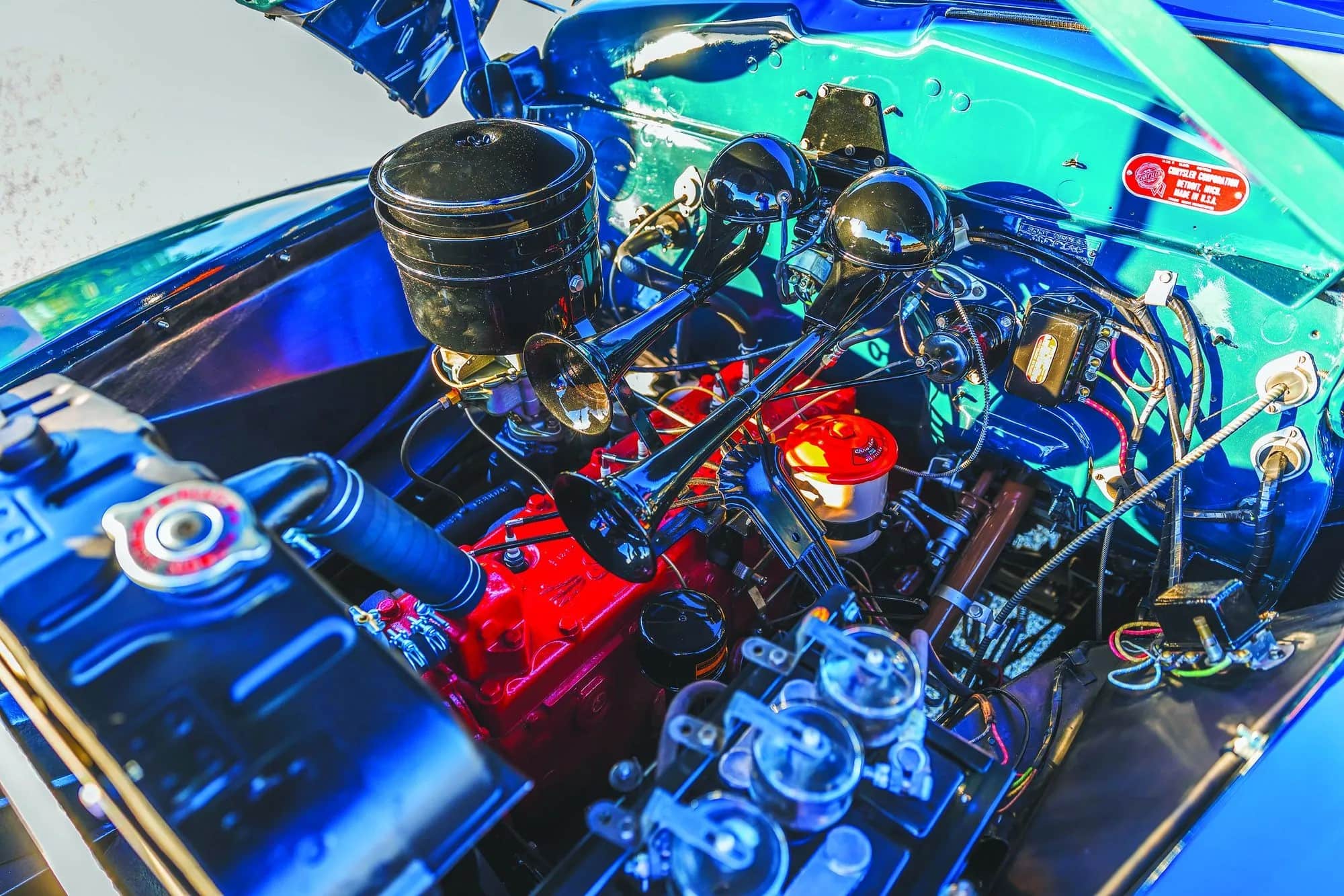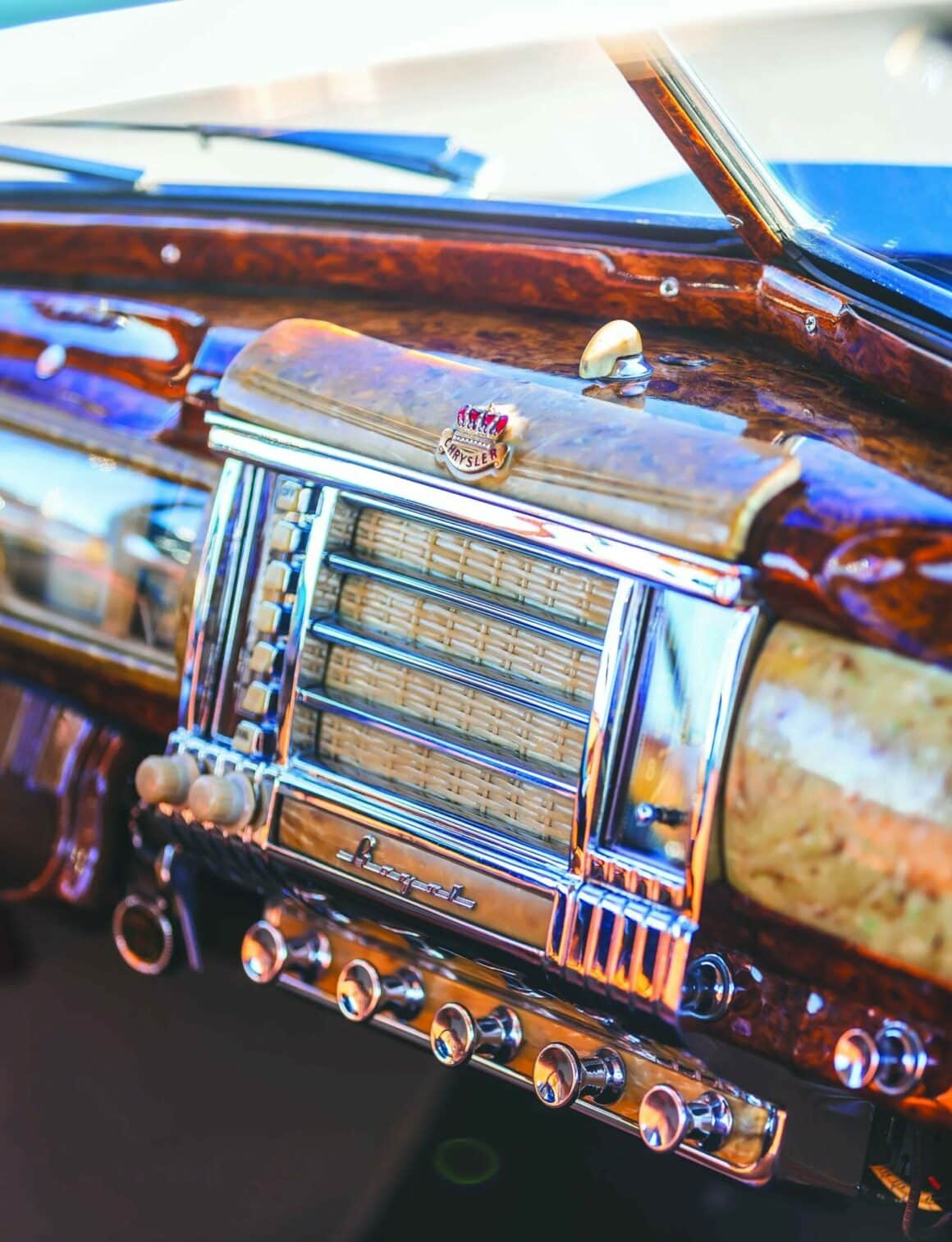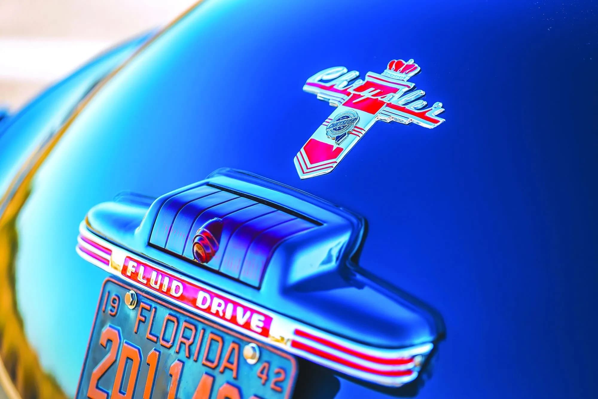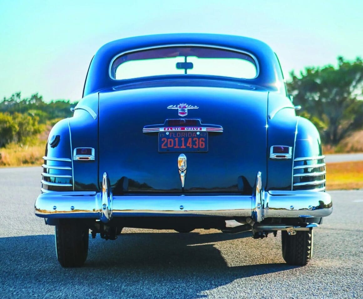 En fait, ce sont les raisons raison pour lesquelles David Helmer a acheté cette voiture, qui est de surcroit un exemple de niveau concours. “Ce qui compte, c’est l’apparence de la voiture”, m’explique David. “J’étais concessionnaire Pontiac, et je ne pense pas que Pontiac ait jamais fabriqué une voiture aussi belle que cette Chrysler. J’aime tout simplement le profil allongé du coupé avec cette tourelle de cuirassé en plein centre de la voiture. La berline à deux portes typique me semble toutefois maladroite. Ce coupé est très aérodynamique avec cette grosse partie arrière plongeante. J’adore les coupés. Celui-ci a été construit dans la gamme Royal de Chrysler en 1942. C’est le produit d’une année automobile qui a été interrompue dans les mois qui ont immédiatement suivi Pearl Harbor, ce qui explique son faible total de construction à trois chiffres’...
