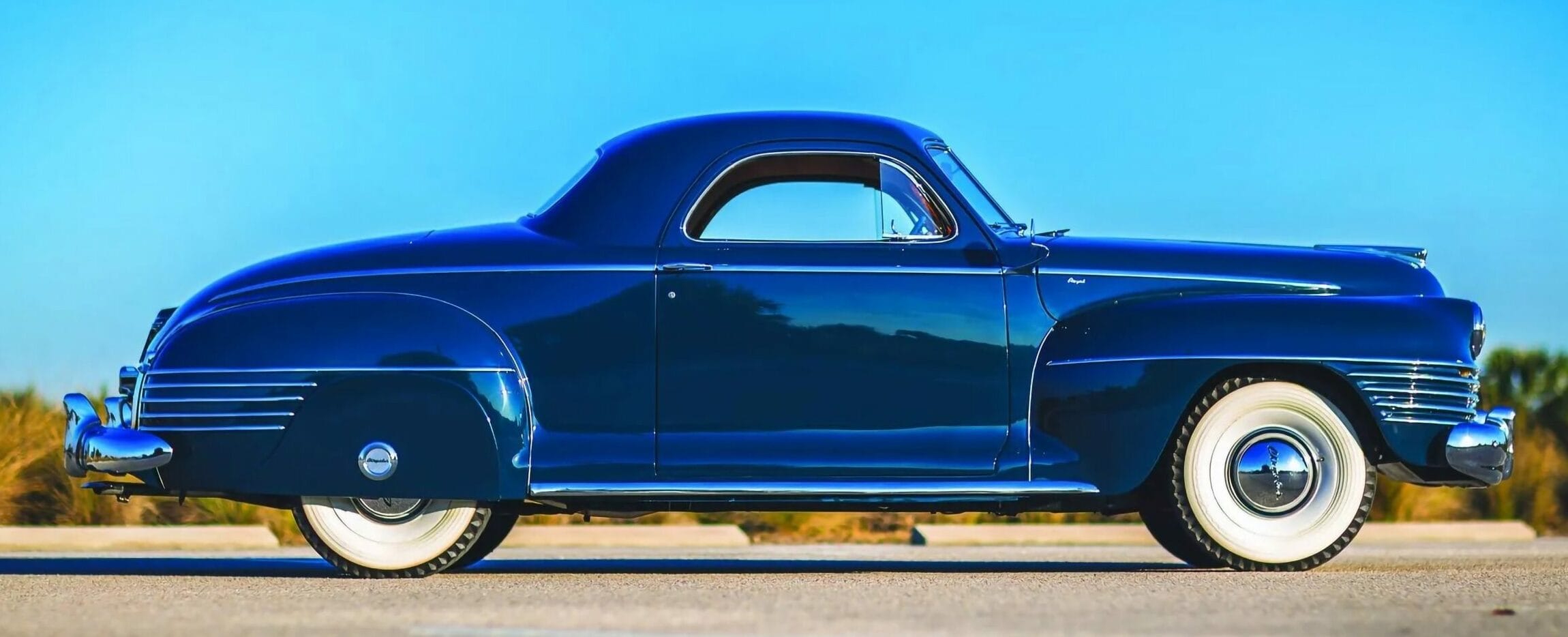 La seconde guerre mondiale en est à la suprématie Nazie et Nippone et voilà qu’en pleine guerre mondiale cette Chrysler Royal Business émerge silencieusement du brouillard, élégante et bouillonnant d’une menace silencieuse. Cette Chrysler est comme le Cuirassé Iowa, regorge d’obus, de torpilles et d’un niveau qui lui permet de poursuivre sa mission, alors qu’il parcourt les mers…Alors, qu’est-ce que cela a à voir avec le Coupé d’affaires réalisé à faible production destiné aux voyageurs de commerce, construit en début du second conflit mondial au cours d’une année de production qui a été écourtée par l’explosion de la guerre ? Pour le propriétaire de cette Chrysler Royal 1942 coupé d’affaires à trois passagers, sa voiture est l’une des 479 produites et cela signifie tout, d’autant plus que 1942 est l’année de sa naissance…