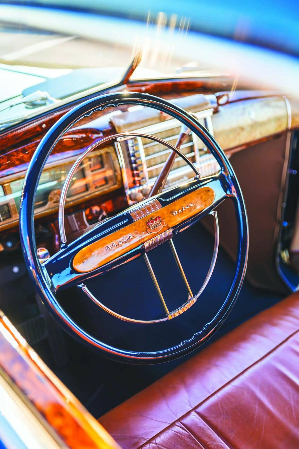 Selon David, la vitesse la plus élevée que la Chrysler atteint généralement lorsqu’il s’entraîne est de 40 mph. “Où que aille, les gens s’extasient devant ma Chrysler” m’a-t-il déclaré. C’est quelque chose que l’on voit rarement, car la Royal a été construite comme une voiture de travail et n’était évidemment pas si populaire lorsqu’elle a été construite à l’origine. Elle attire beaucoup d’attention, et il n’y a rien à faire de plus. La voiture est absolument parfaite : “J’ai deux autres Chrysler avec Fluid Drive, et j’en ai possédé d’autres, et je trouve que Fluid Drive rend la conduite de la voiture extrêmement facile. Je possède également un cabriolet Lincoln Cosmopolitan de 1951, l’un des 15 survivants sur 587 construits ; une Buick Electra décapotable de 1960, une Chrysler Town & Country cabriolet de 1949, une Packard Custom cabriolet de 1948, une berline Town & Country de 1947 et une très intéressante Chevrolet Fleetline Aerosedan de 1948 avec des côtés en bois et toutes les options disponibles, y compris la lunette arrière. Elle a été acceptée au concours Amelia par Bill Warner’.
