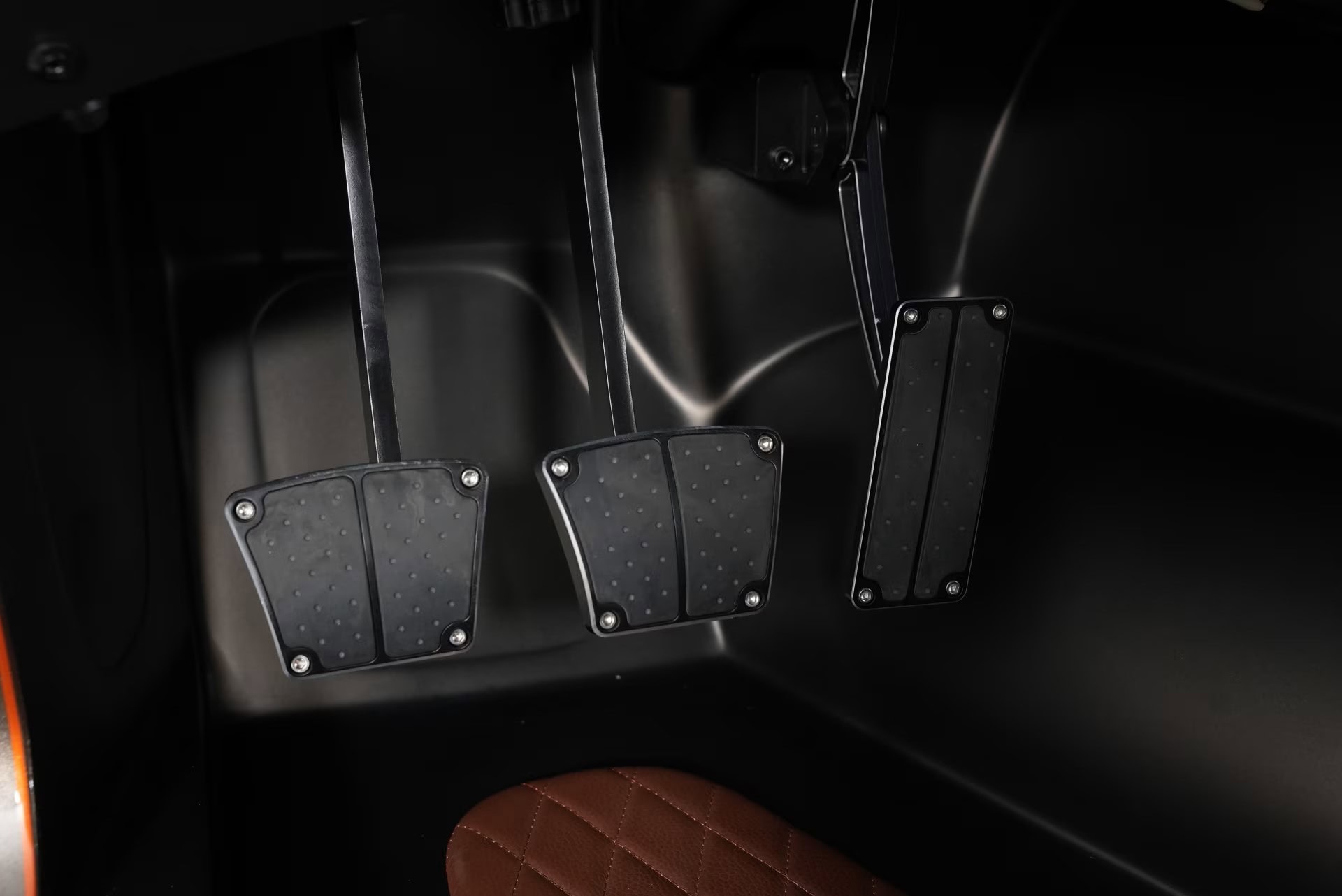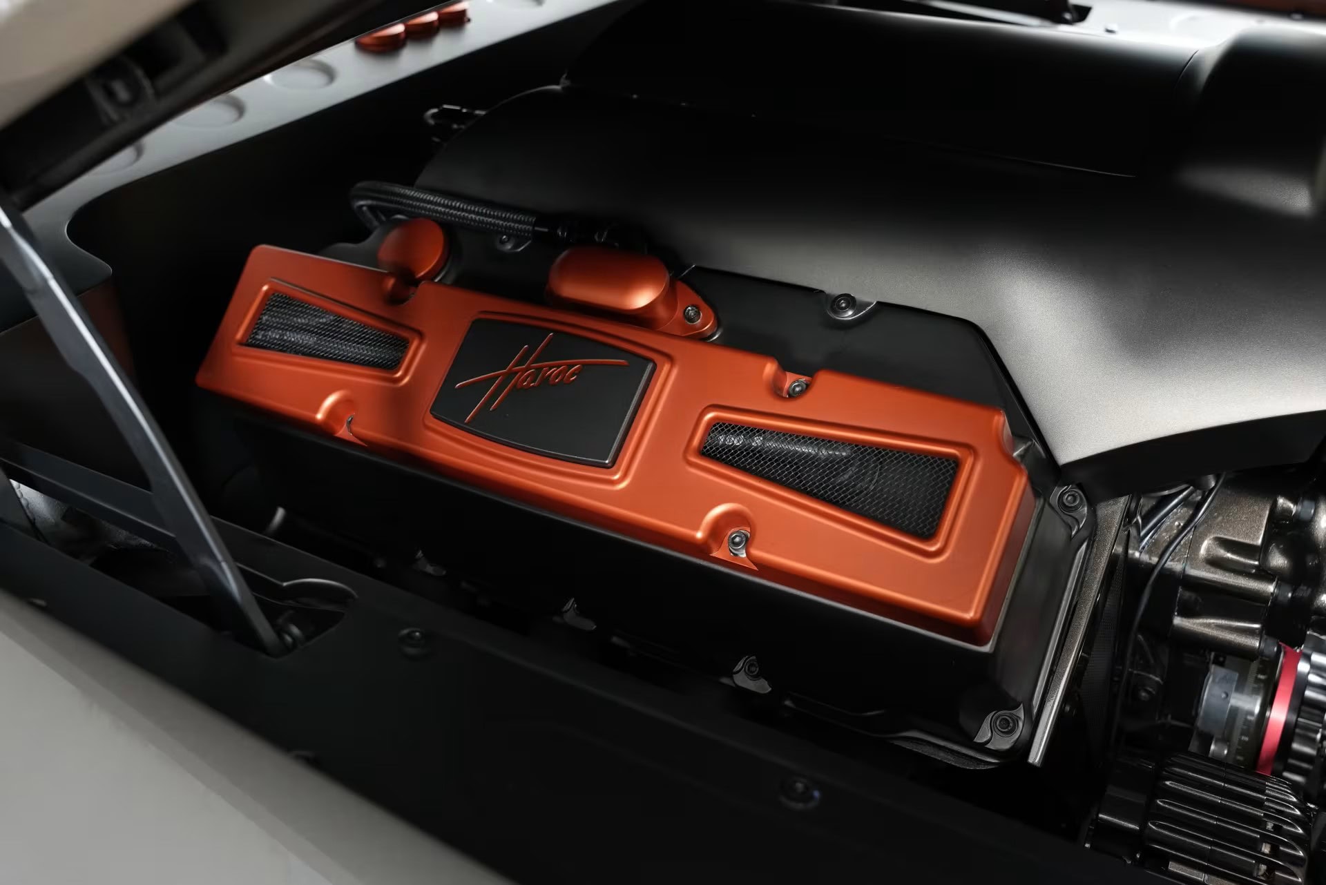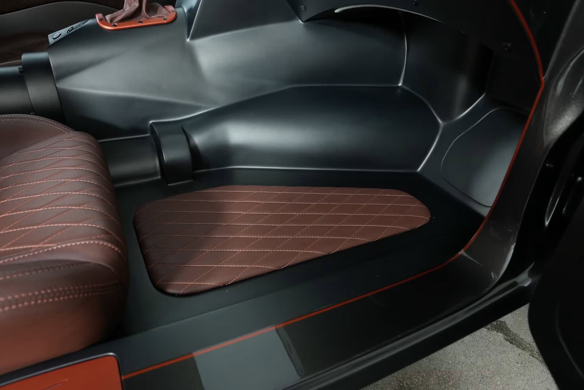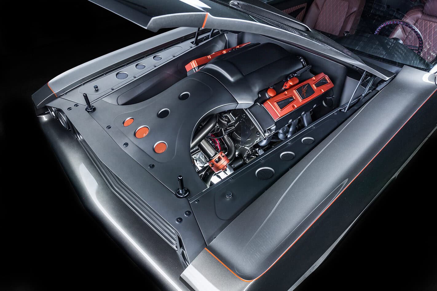Le levier de vitesses “squelette” est une invention de “Ring Brothers”. Les paillassons et les accents sont tous recouverts de cuir brun cousu au diamant pour compléter les surfaces peintes en acier. L’emblème “Havoc” orne le véhicule, à l’intérieur comme à l’extérieur, d’une manière à la fois accrocheuse et sophistiquée. Pour créer l’ambiance avec accentuation LED personnalisée, de l’intérieur du cockpit au compartiment moteur lui-même,