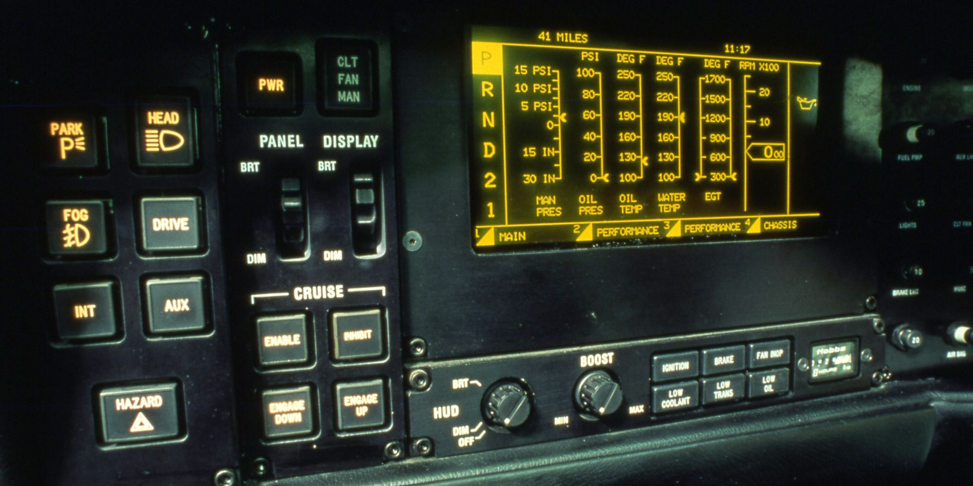 Quel que soit l’écran, l’indicateur de sélection de vitesse restait incorporé sur son côté gauche. Les instruments, allant d’un tachymètre à deux pyromètres de température d’échappement, étaient dotés d’un affichage à bande mobile qui passait verticalement devant une aiguille fixe, ainsi que d’un affichage numérique dans la fenêtre de l’aiguille. Jerry m’a expliqué comment la partie sur bande mobile fournissait des informations sur le taux de variation qu’un affichage uniquement numérique ne peut pas fournir. J’ai gromellé “OK” et appuyé sur l’accélérateur et j’ai vu ce qu’il voulait dire, en regardant la bande passer devant l’aiguille à environ 3000 tr/min, puis revenir au ralenti. Attrapant la poignée rembourrée du levier de vitesses, enfoncée profondément dans le seuil à ma gauche, j’ai engagé la marche arrière et suis retourné timidement dans la rue.