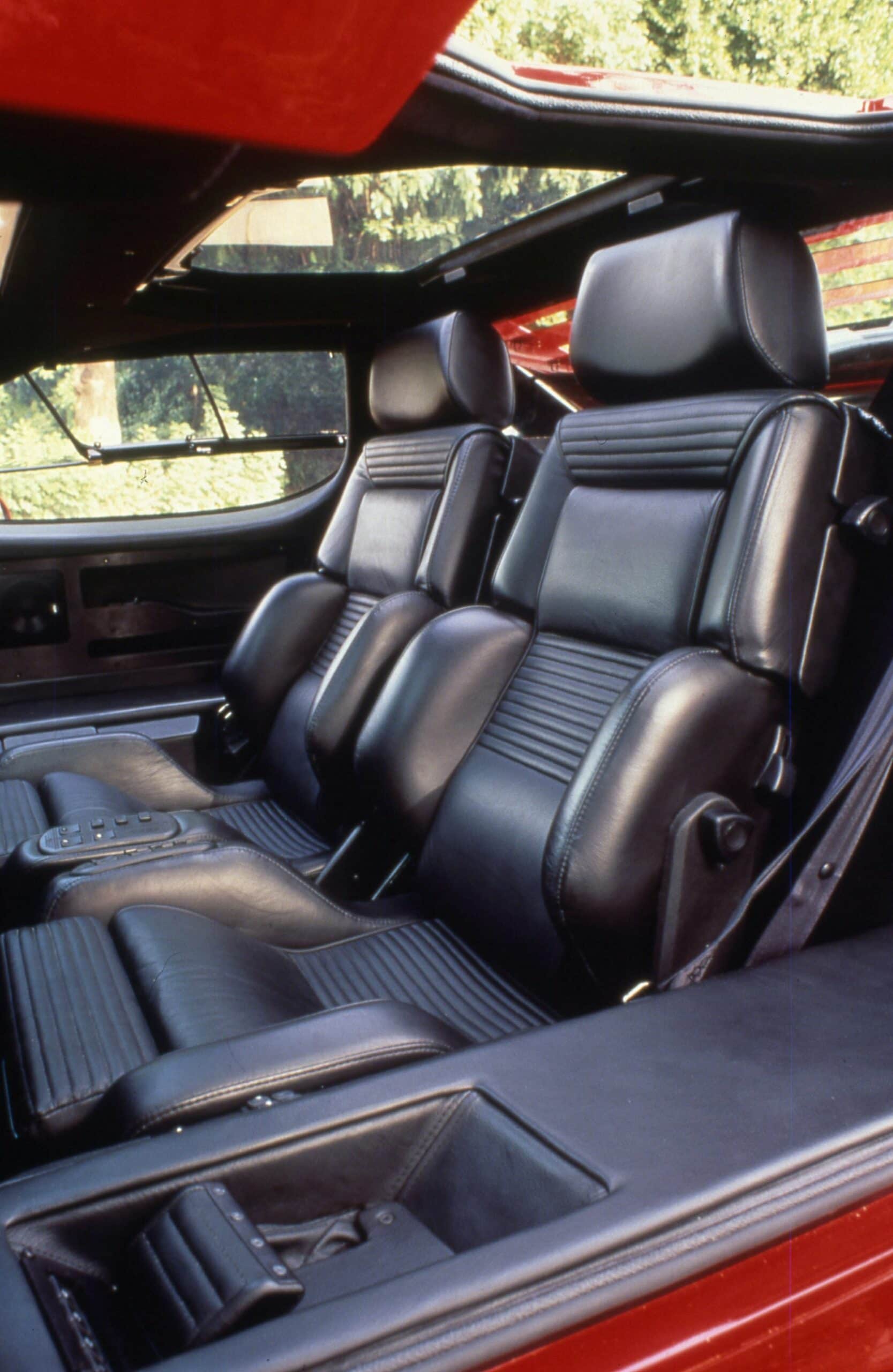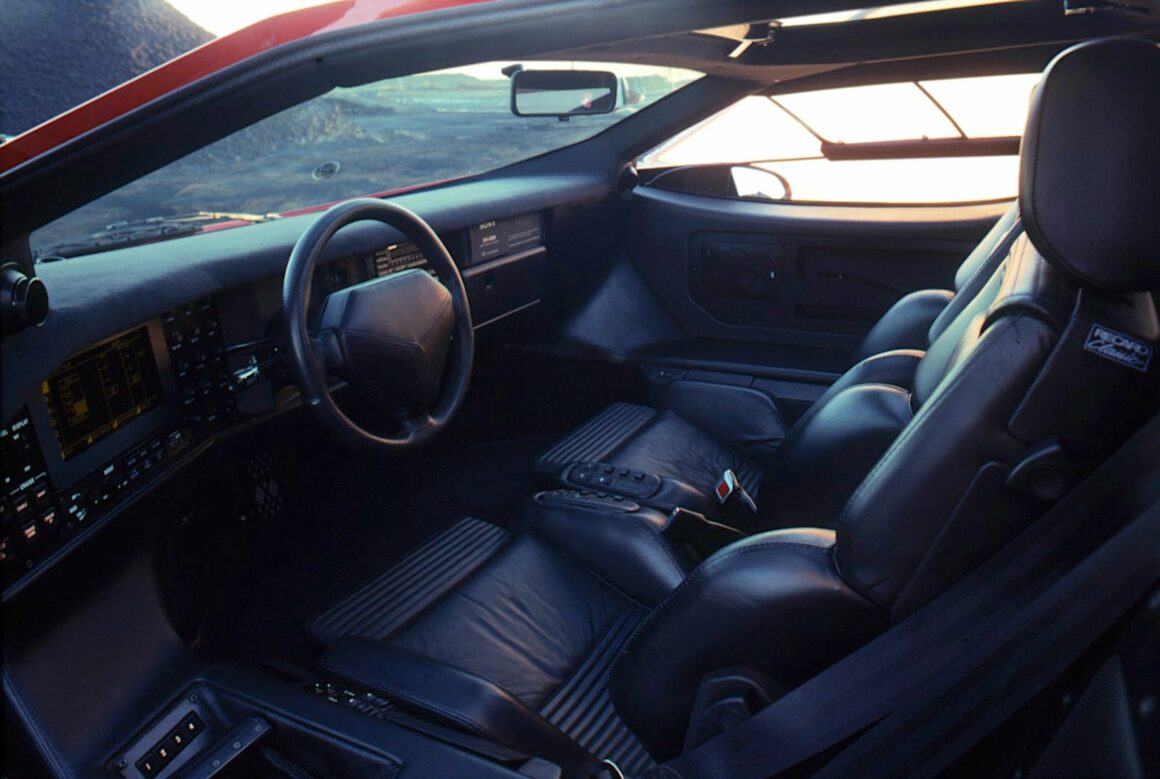 Le tout connecté à deux turbos Garrett refroidis à l’eau, avec carters spécifiques “aviation”… Explosé… Foutu… Rien d’autre à dire… Lamentable… Le carter de transmission était par contre toujours une GM Turbo Hydra-matic du type utilisé dans les années soixante-dix par les Olds Toronado et Cadillac Eldorado à traction avant à moteur V-8. Tout était de la récupération… Arnaque… Le samedi arrivé, la seconde voiture de développement gris ardoise attendait avec une porte battante impossible à fermer… L’entrée est un peu une tâche pour les non-initiés, avec un seuil modérément large et un espace assez petit entre les sièges et l’avant du montant de la porte. Avec l’avantage de la mémoire musculaire, je me suis glissé sur le seuil puis sur le siège avec la grâce d’un gymnaste, je dansais dans les limbes sur le siège du conducteur avec le vacillement d’un cerf nouveau-né. L’odeur du cuir flottant dans l’air…