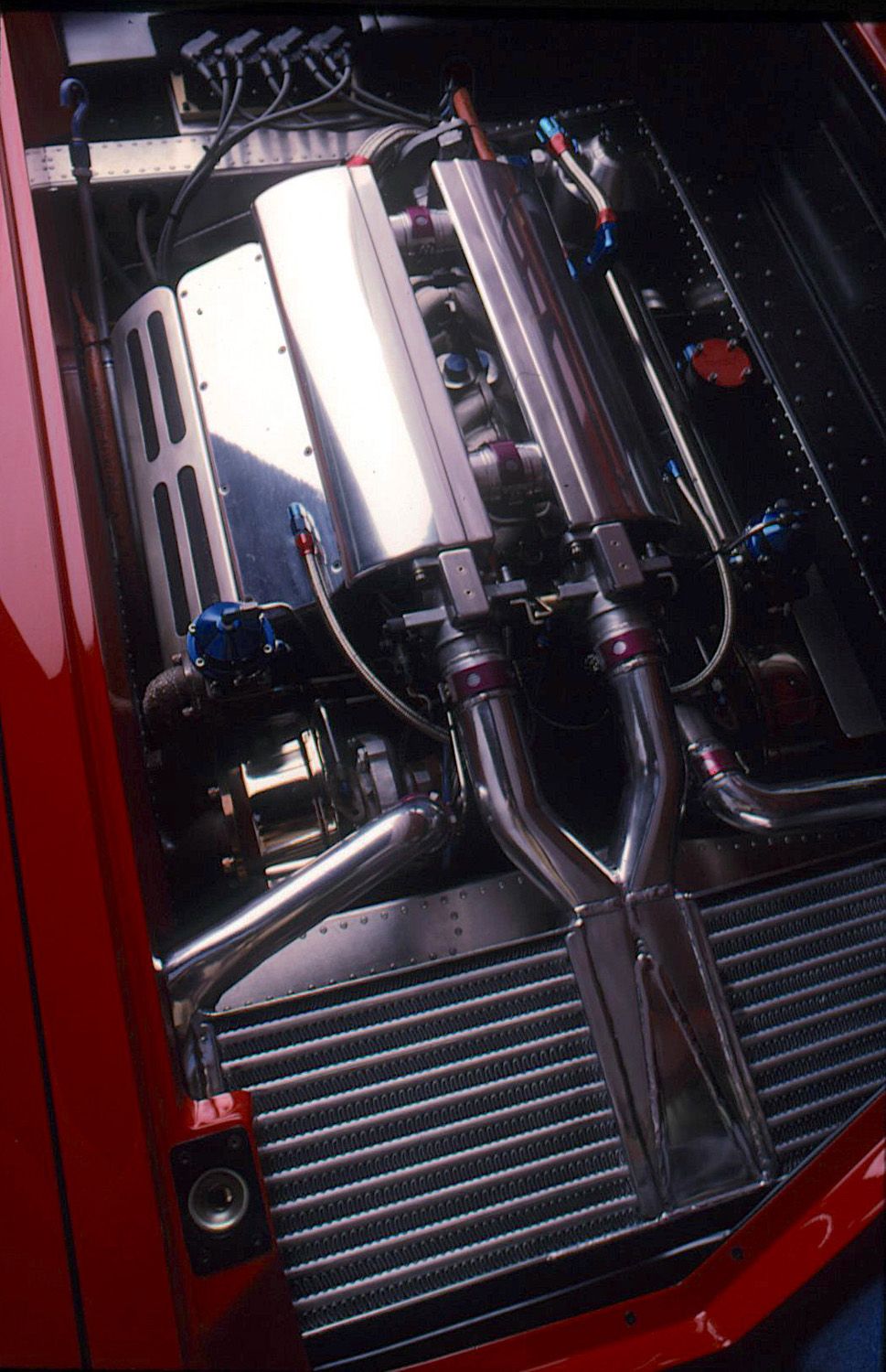 Il m’a dit : “Patrice, voici 200 dollars, vous n’avez rien vu. Il a explosé mais on va le refaire”... C’était quoi donc ? Un V8 Six litres en aluminium, fabriqué par Rodeck, avec culasses à 2 soupapes par Air Flow Research. Assemblé et testé au banc d’essai par Shaver Specialties de Torrance, en Californie. Aucune dépense n’avait été épargnée ; la liste de pièces de moteur se lisait comme la liste de Noël d’un coureur sur piste circulaire : pistons forgés TRW, bielles en acier inoxydable Carrillo, soupapes en acier inoxydable, culbuteurs à rouleaux, vilebrequin forgé, système de lubrification à carter sec avec trois filtres séparés. Des faisceaux de tuyaux en acier inoxydable tressés, avec des raccords anodisés rouges et bleus utilisés pour acheminer les fluides partout. Le couronnement du moteur était son ensemble intercooler exposé, fabriqué en aluminium et poli jusqu’à un éclat aveuglant…