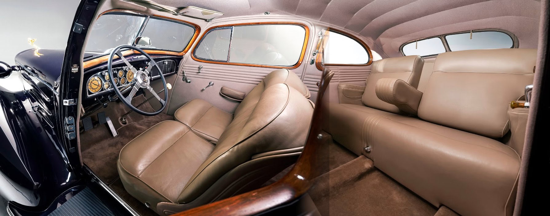 S’inspirant de l’Eldorado, la Celestiq présentée ici est équipée de plus de 73.000 $ d’options, incluant toutes les finitions intérieures et les améliorations esthétiques. Ces gadgets et autres équipements sont de série. Les Américains aiment afficher leur richesse, ils possèdent plus de jets privés que tous les autres habitants de la planète réunis et apprécient tout simplement les grands écrans : un écran haute définition de 55 pouces occupe toute la largeur du tableau de bord. Chaque siège arrière dispose également de son propre écran tactile. Pour que le passager avant n’ait pas à se pencher pour utiliser le sien, un code QR s’affiche au démarrage, permettant de connecter un téléphone et de l’utiliser comme télécommande, le luxe absolu, de série… La télévision commerciale n’en était qu’à ses balbutiements lors de la construction de ce coupé aérodynamique V-16, mais il arbore tout de même une petite technologie d’époque à l’arrière : une charmante horloge encastrée dans le panneau latéral de l’habitacle. Aussi futuriste qu’elle puisse paraître, la Celestiq est un hommage aux voitures carrossées sur mesure d’antan.