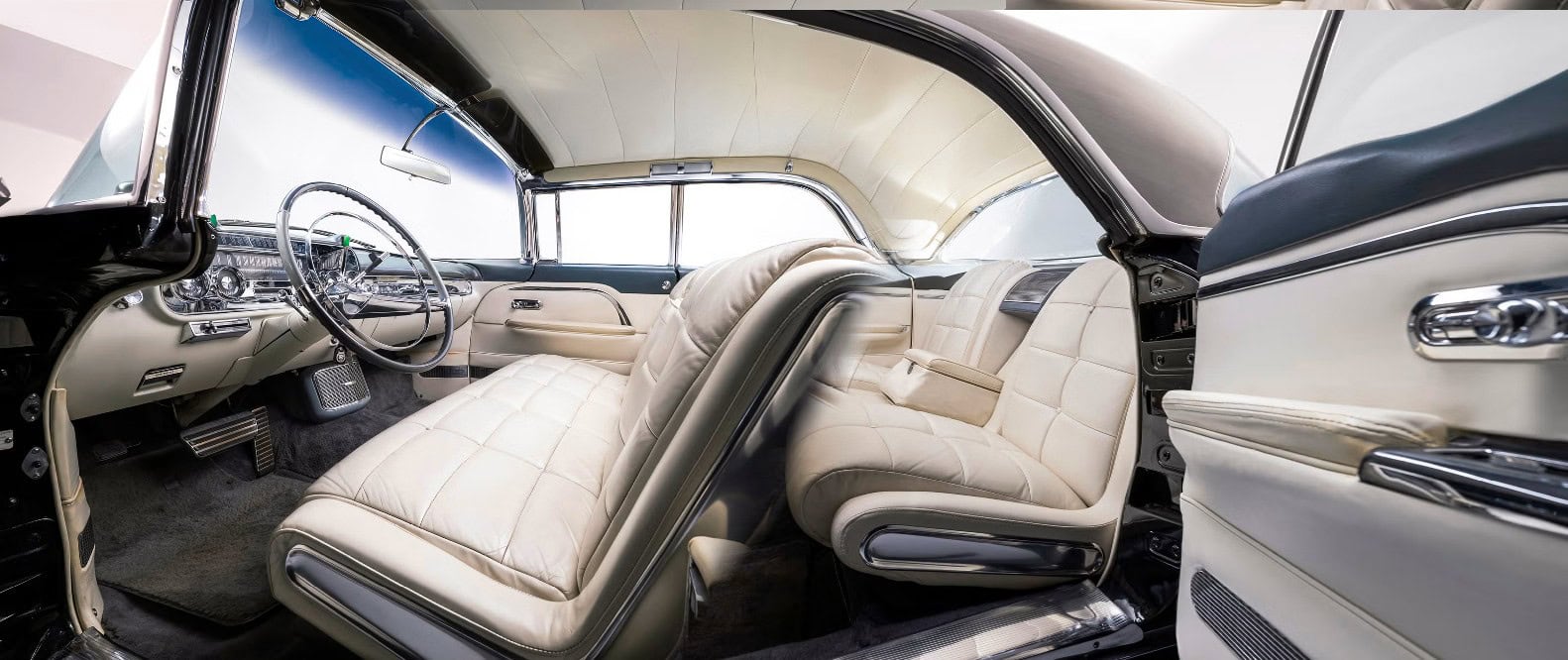 Des capteurs radar empêchent l’ouverture intempestive des portes en cas de collision avec un obstacle ou une personne… Cadillac ne m’a pas autorisé à conduire les véhicules de sa collection Heritage, l’Aero Coupé vaut environ un million de dollars, mais, sous l’œil attentif d’un responsable, j’ai pu m’y installer. Malgré ses deux portes seulement, l’Aero Coupé offre une banquette arrière encore plus spacieuse que celle de la Celestiq. Chaque moitié de la lunette arrière divisée est équipée d’un store, ce qui en faisait l’équivalent, pour l’époque, d’un toit ouvrant panoramique électrochrome multizone. Cadillac l’a peut-être oublié pendant une décennie ou quatre, mais la marque a toujours su choyer ses passagers. La banquette, d’un moelleux incomparable, est antérieure au chauffage, à la ventilation et aux massages des sièges, même s’il ne fait aucun doute qu’elle aurait proposé ces luxes s’ils avaient existé. Prenons l’exemple de la Brougham, elle aussi dotée d’un équipement de série luxueux. Elle comprenait toutes les extravagances que Cadillac pouvait imaginer en 1957, comme un siège arrière à mémoire, un hayon électrique et des phares automatiques.