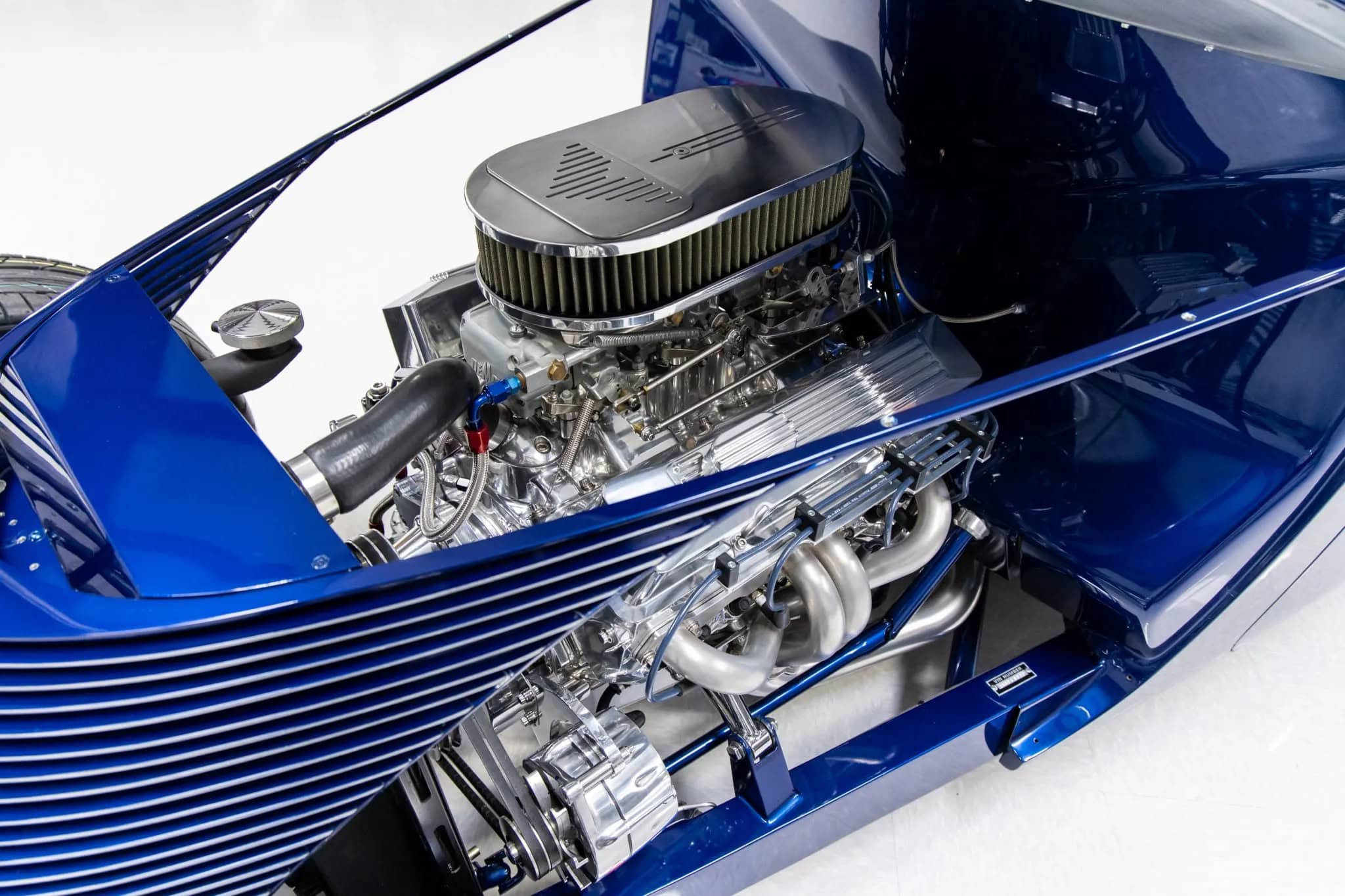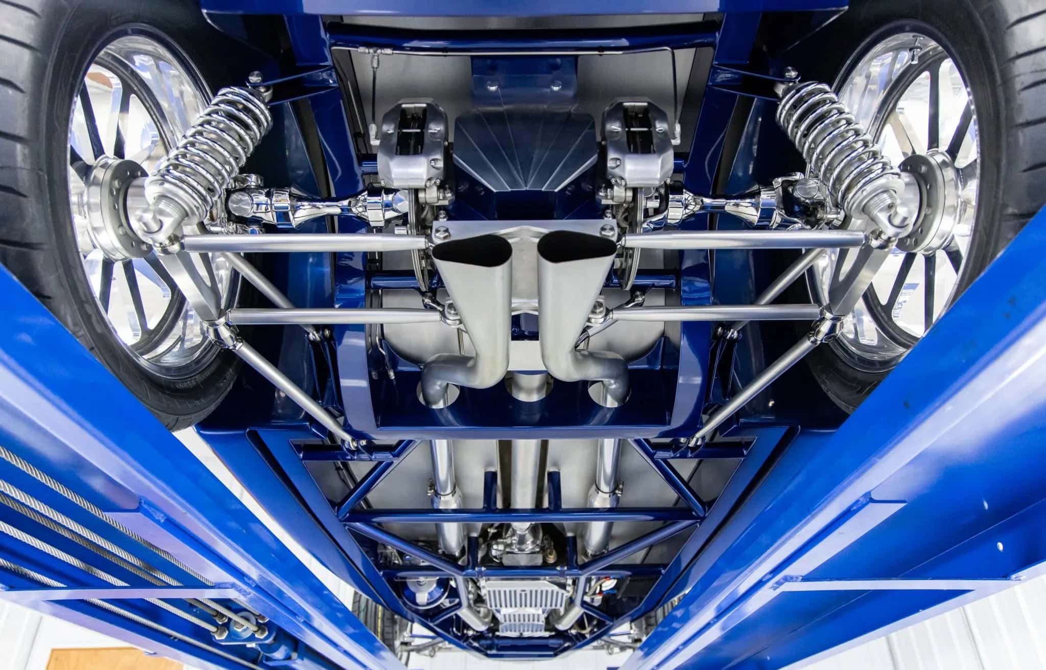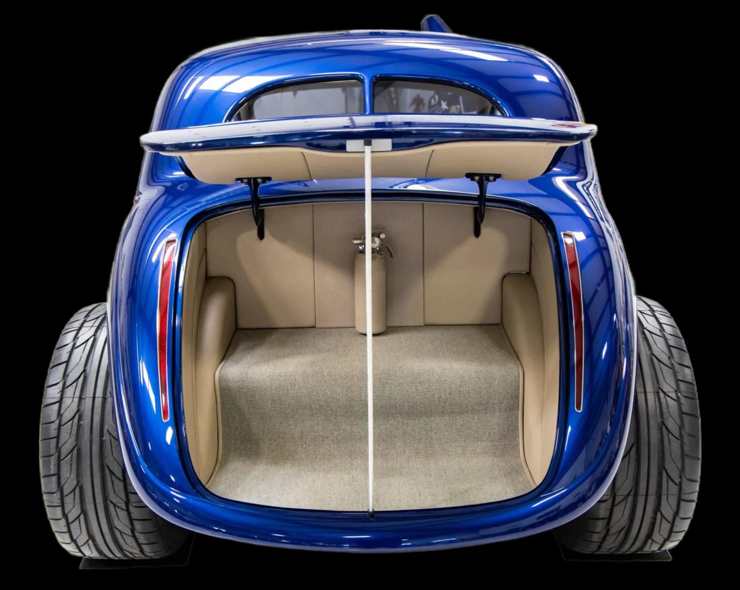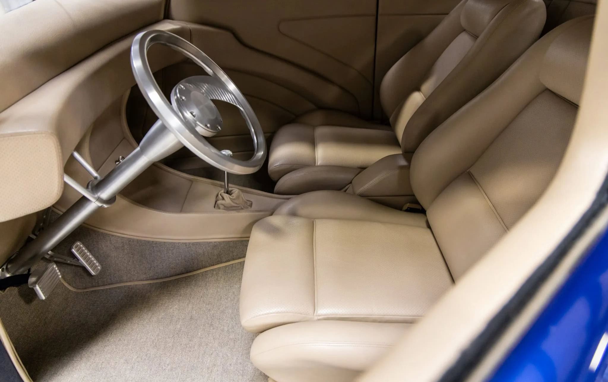 Des vitres “teintées sur mesure” ont été installées partouuuuuuut… La carrosserie et le châssis, fabriqués chez “Hot Rods by Boyd”, sont peints en bleu électrique. La voiture est équipée d’une suspension indépendante, d’un empattement de 120po, d’une direction à crémaillère, de bras de suspension avant tubulaires, d’un essieu arrière multibras de type Jaguar V12, de montants de porte en aluminium usiné et d’amortisseurs réglables sur les quatre roues.