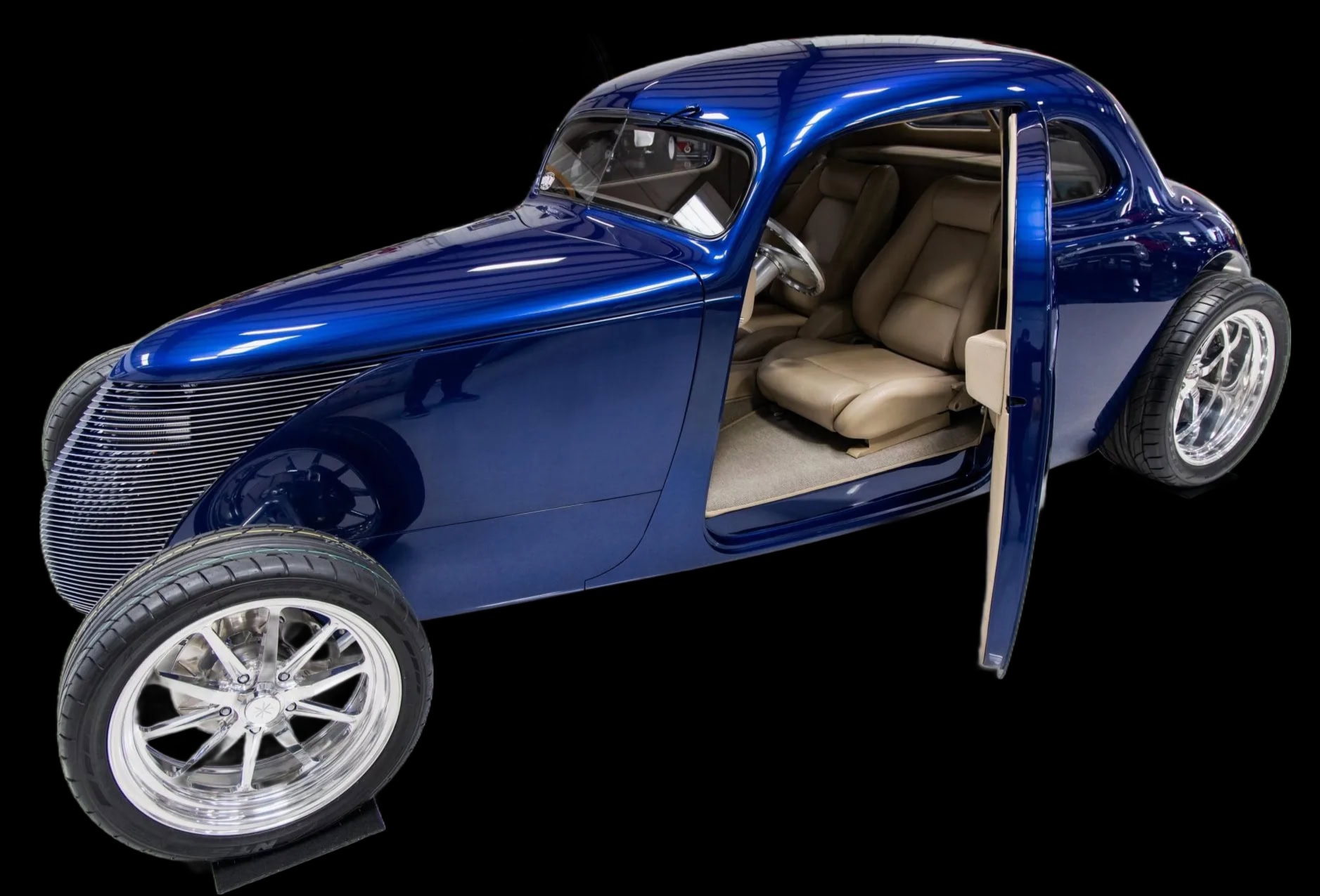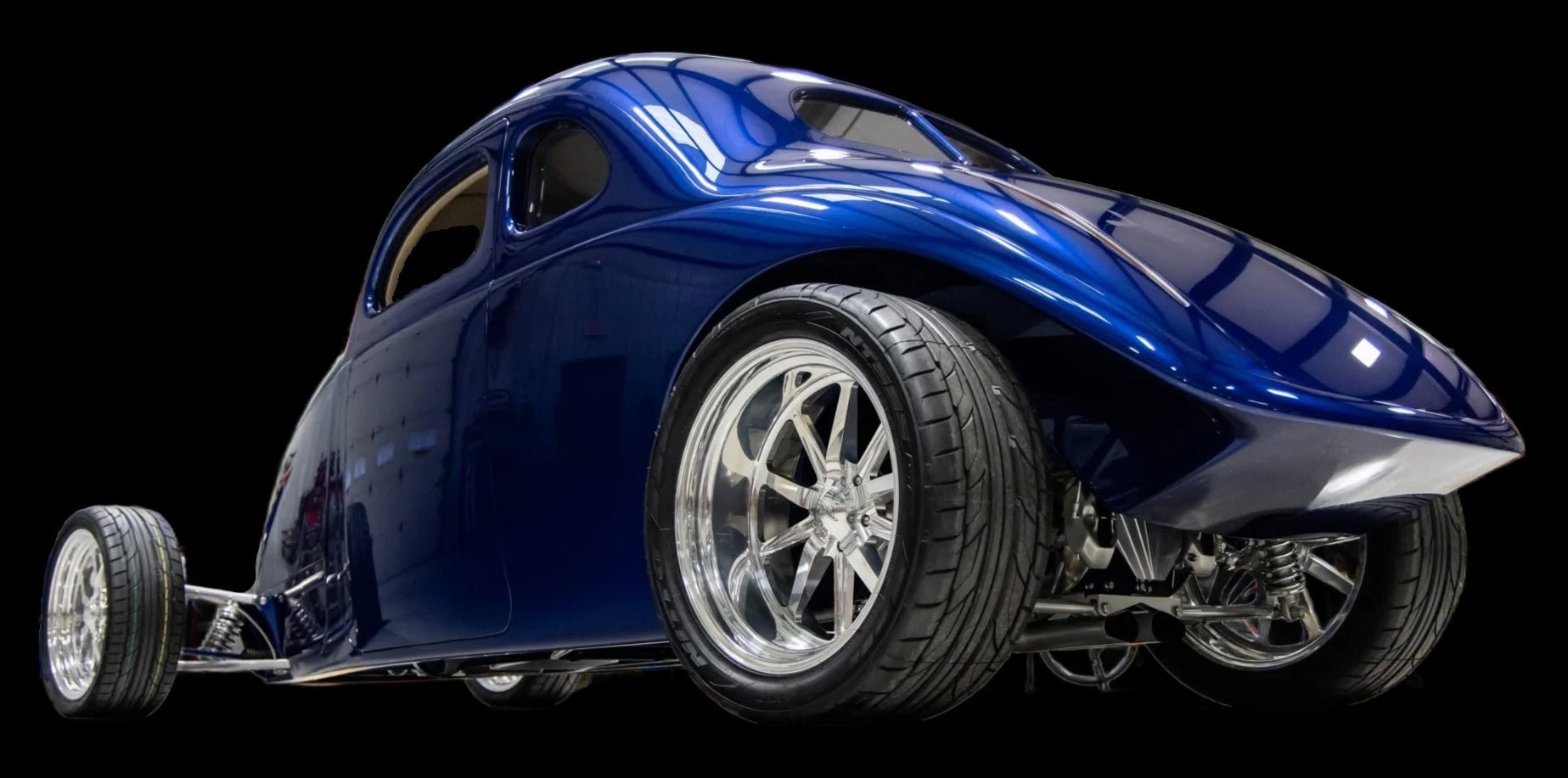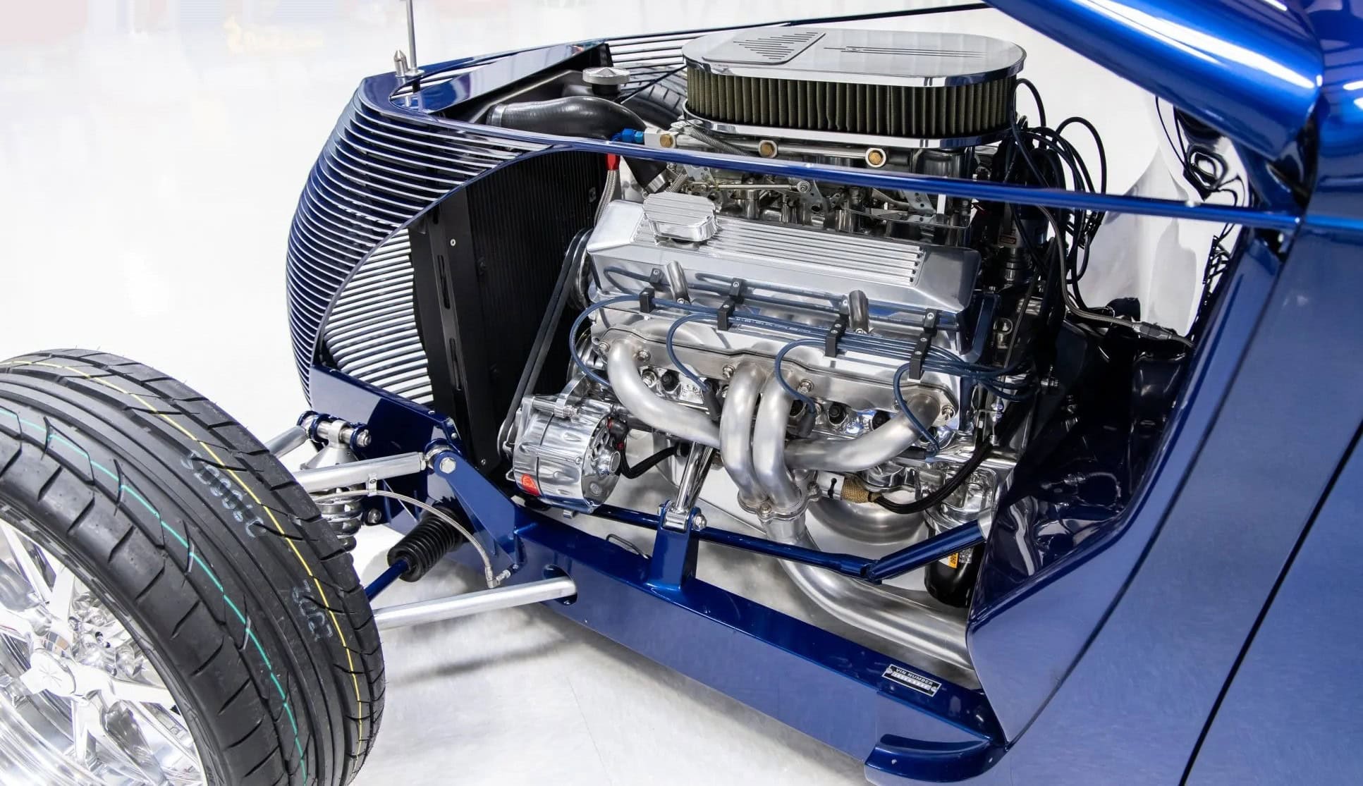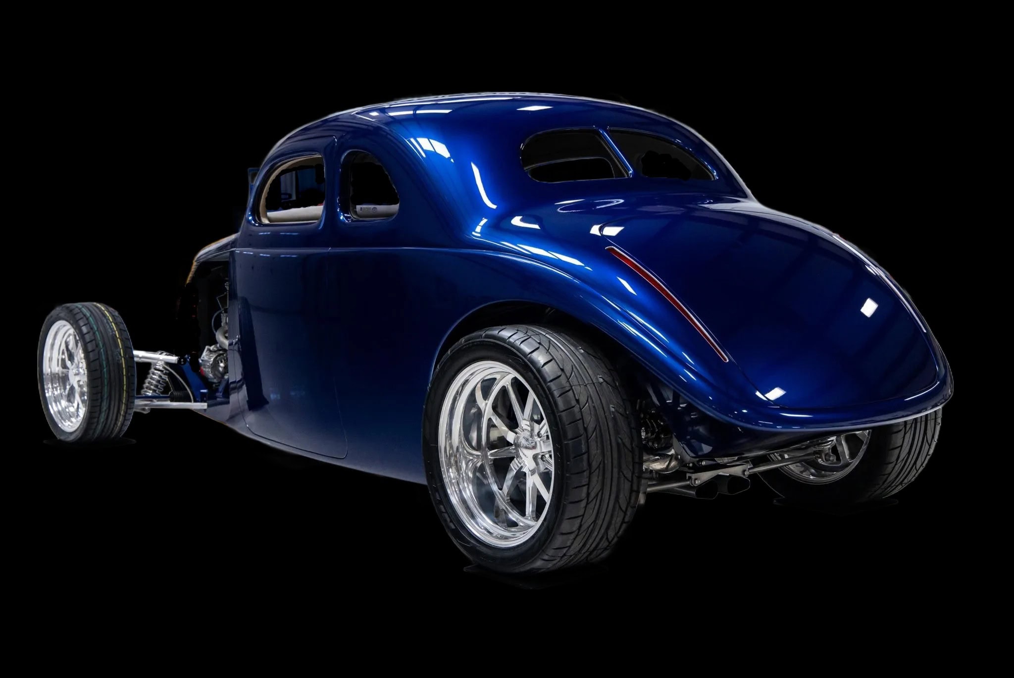 Des vitres “teintées sur mesure” ont été installées partouuuuuuut… La carrosserie et le châssis, fabriqués chez “Hot Rods by Boyd”, sont peints en bleu électrique. La voiture est équipée d’une suspension indépendante, d’un empattement de 120po, d’une direction à crémaillère, de bras de suspension avant tubulaires, d’un essieu arrière multibras de type Jaguar V12, de montants de porte en aluminium usiné et d’amortisseurs réglables sur les quatre roues.