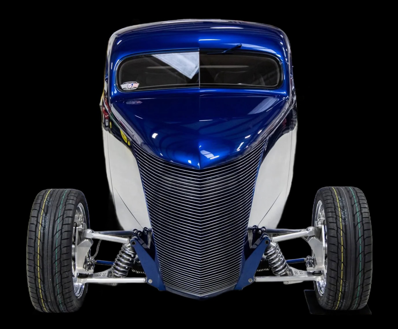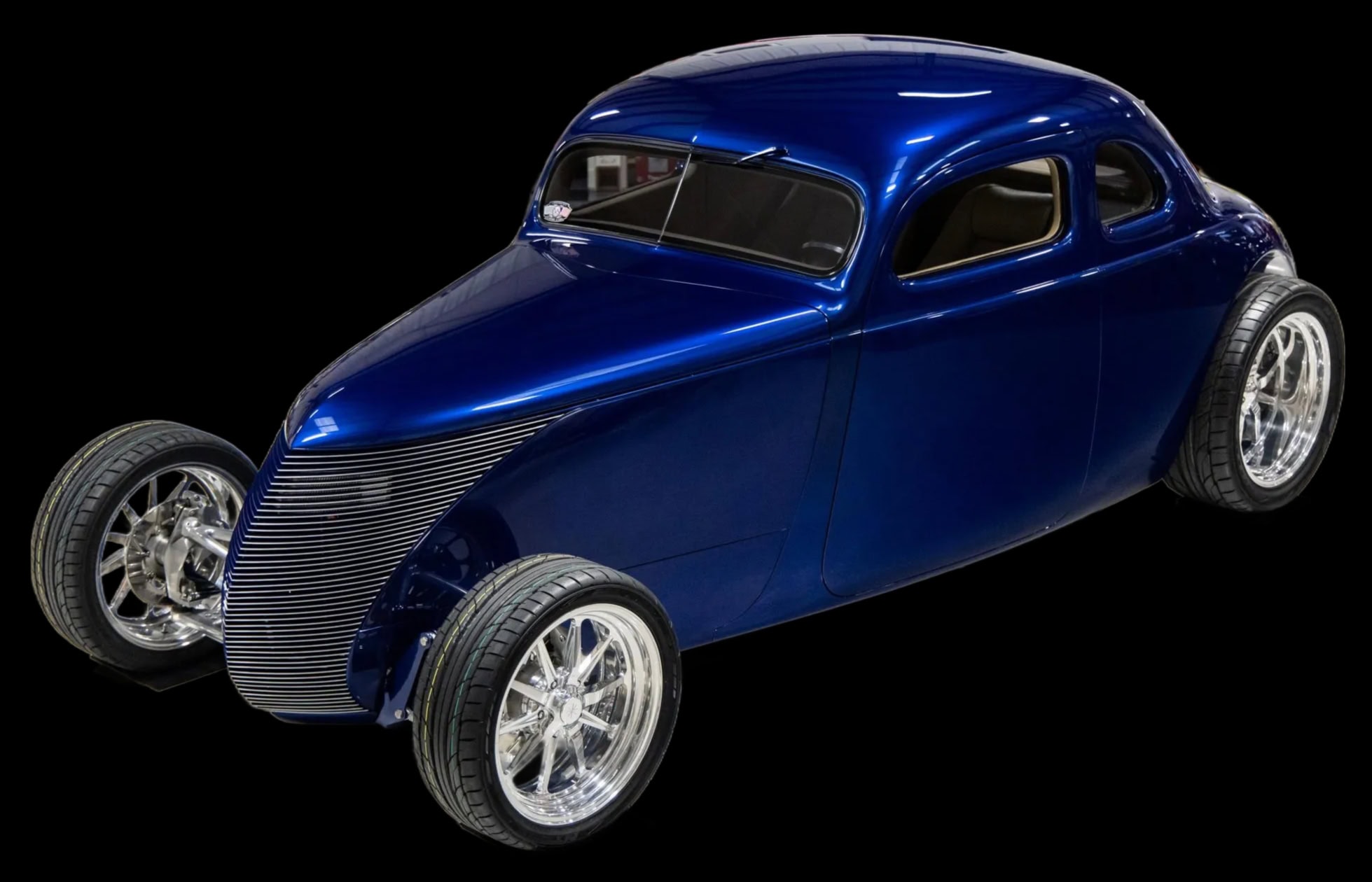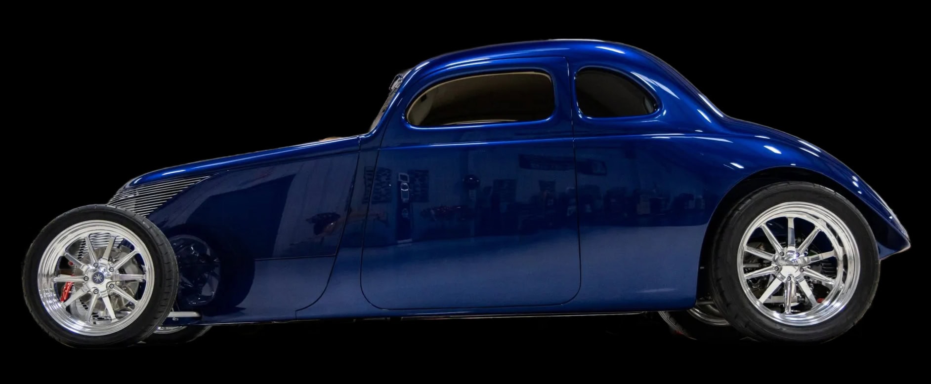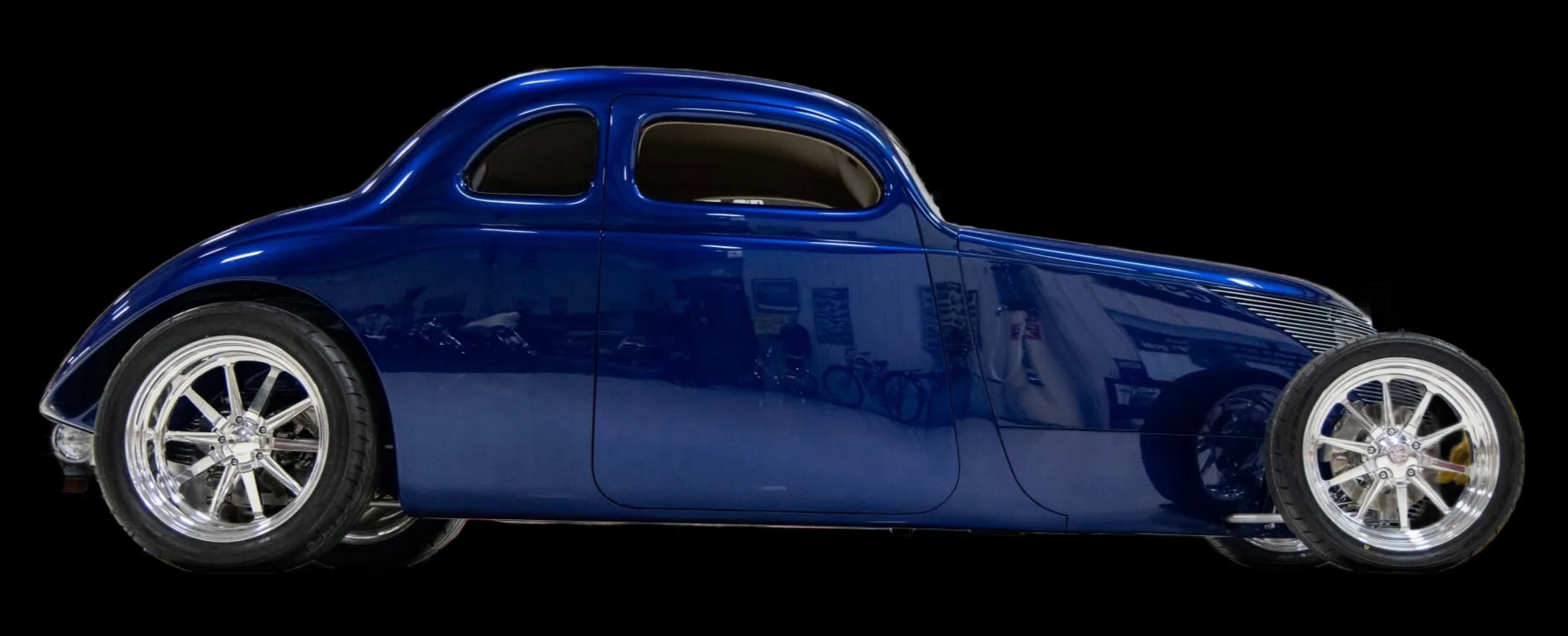 Des vitres “teintées sur mesure” ont été installées partouuuuuuut… La carrosserie et le châssis, fabriqués chez “Hot Rods by Boyd”, sont peints en bleu électrique. La voiture est équipée d’une suspension indépendante, d’un empattement de 120po, d’une direction à crémaillère, de bras de suspension avant tubulaires, d’un essieu arrière multibras de type Jaguar V12, de montants de porte en aluminium usiné et d’amortisseurs réglables sur les quatre roues.