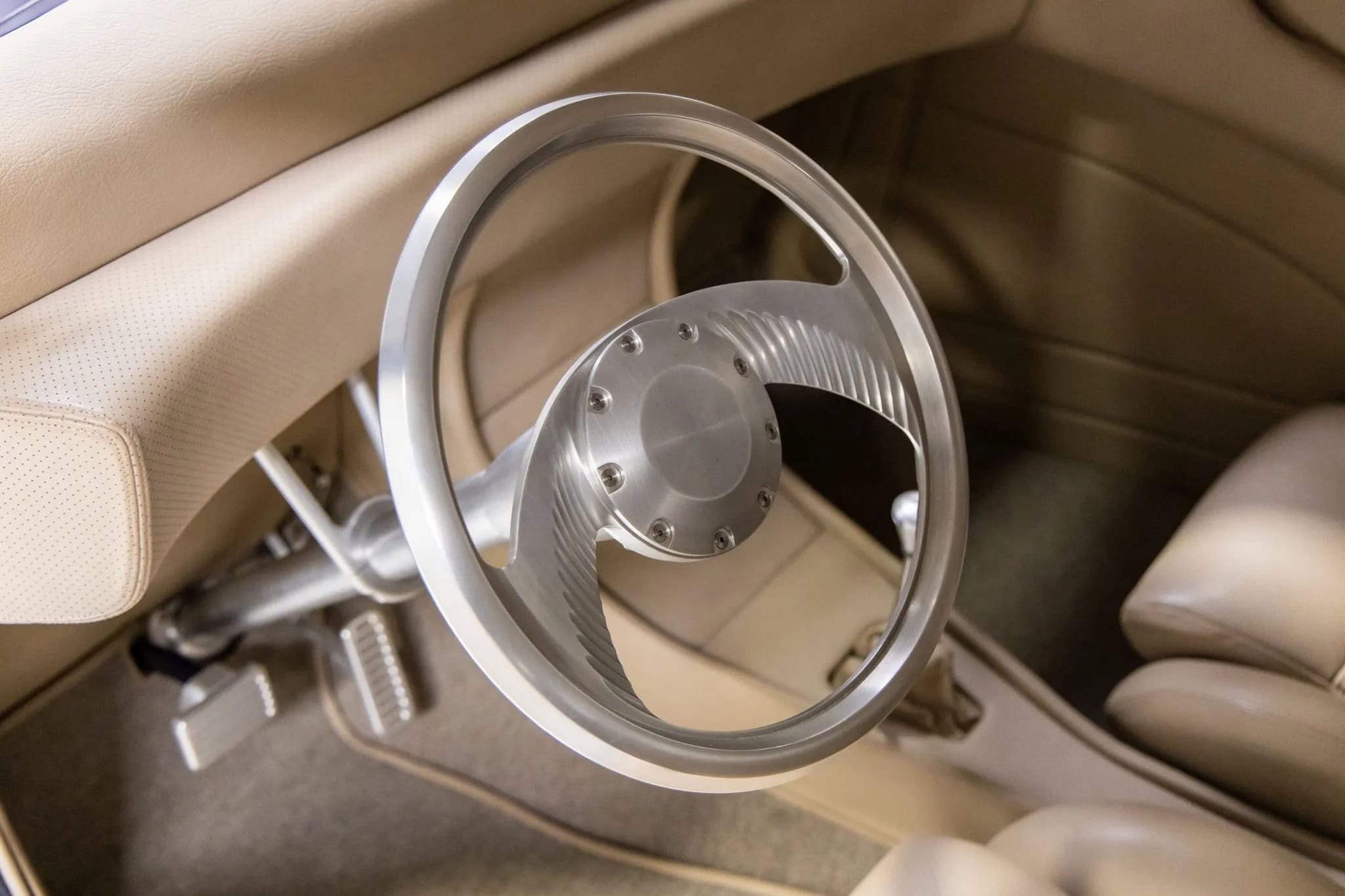 Le freinage est assuré par quatre disques dont le servofrein est relié à un maître-cylindre situé sous le plancher. L’habitacle est garni de cuir beige et le plancher est recouvert de moquette à tissage carré. Les sièges baquets, réglables et inclinables, sont dotés d’inserts perforés. Le volant en aluminium usiné est assorti à la colonne de direction, aux ferrures et aux pédales.