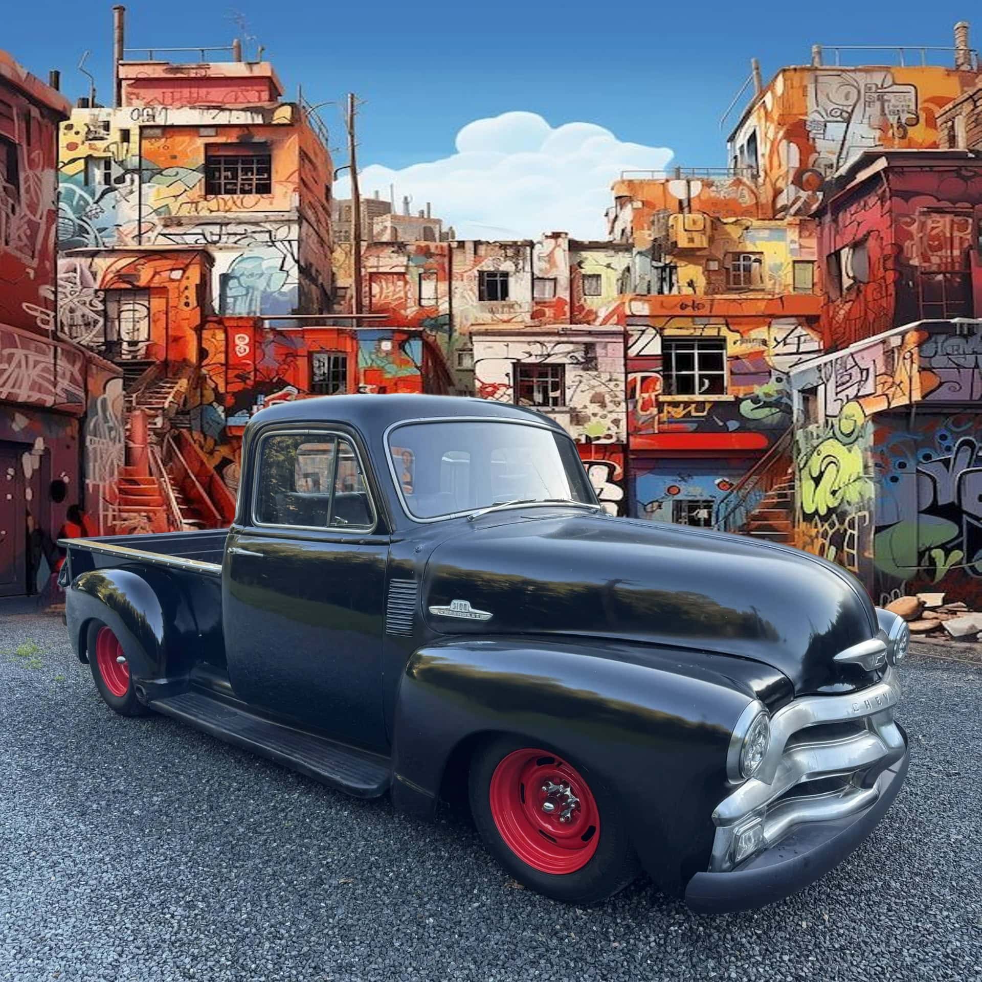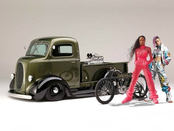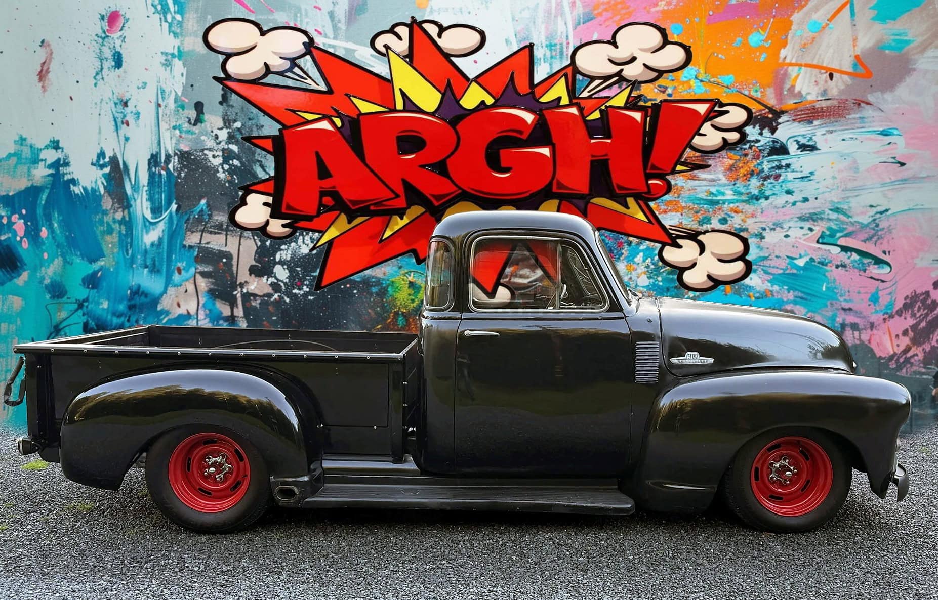Ce Pick-up à cinq fenêtres qui a été restauré et largement modifié par un vieux de la vieille, un Kustomeux, qui possède le camion depuis l’époque des concentres concentrationnaires, est propulsé par un 383ci. V8 “Stroker” associé à une boîte manuelle Tremec à cinq rapports. L’engin dispose d’une suspension avant indépendante, de freins à disques assistés aux quatre roues et d’un intérieur en cuir. Son proprio assure que son 3100 est en bon état de marche et ajoute qu’il attire les regards…