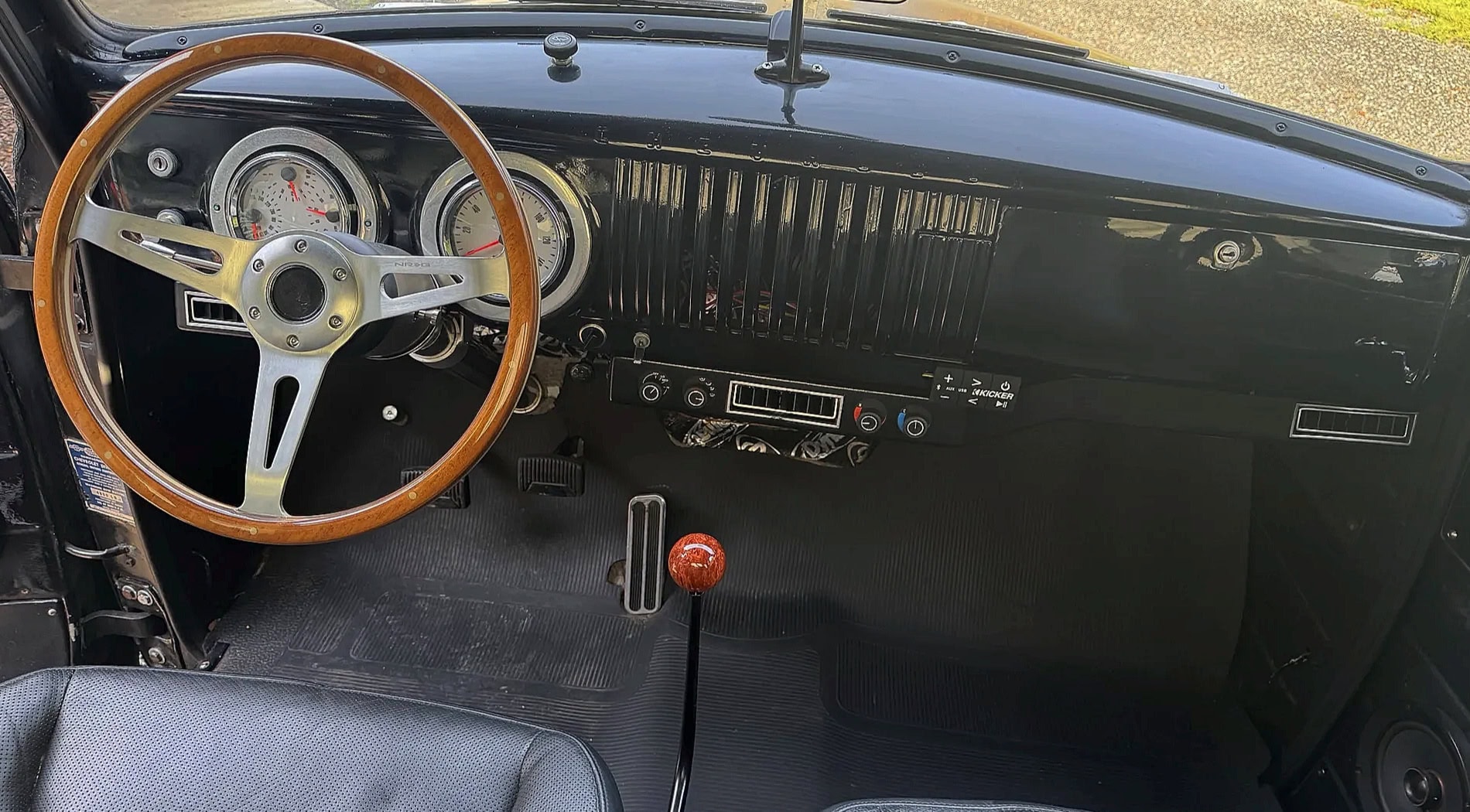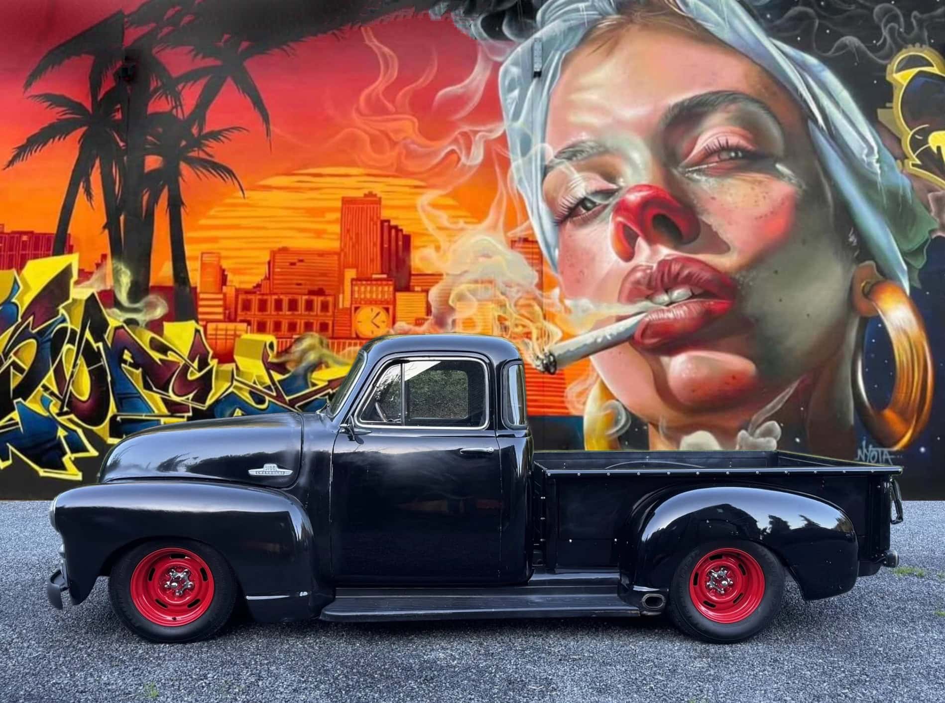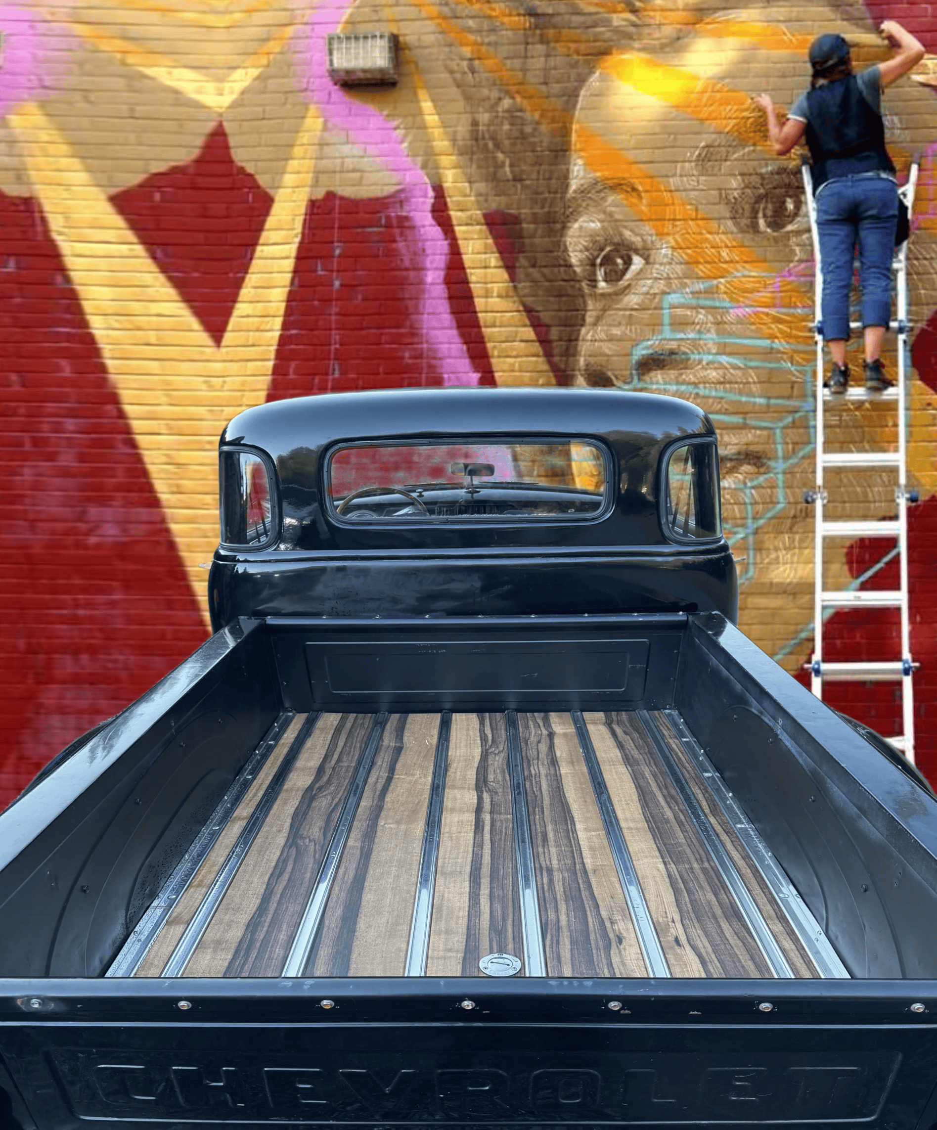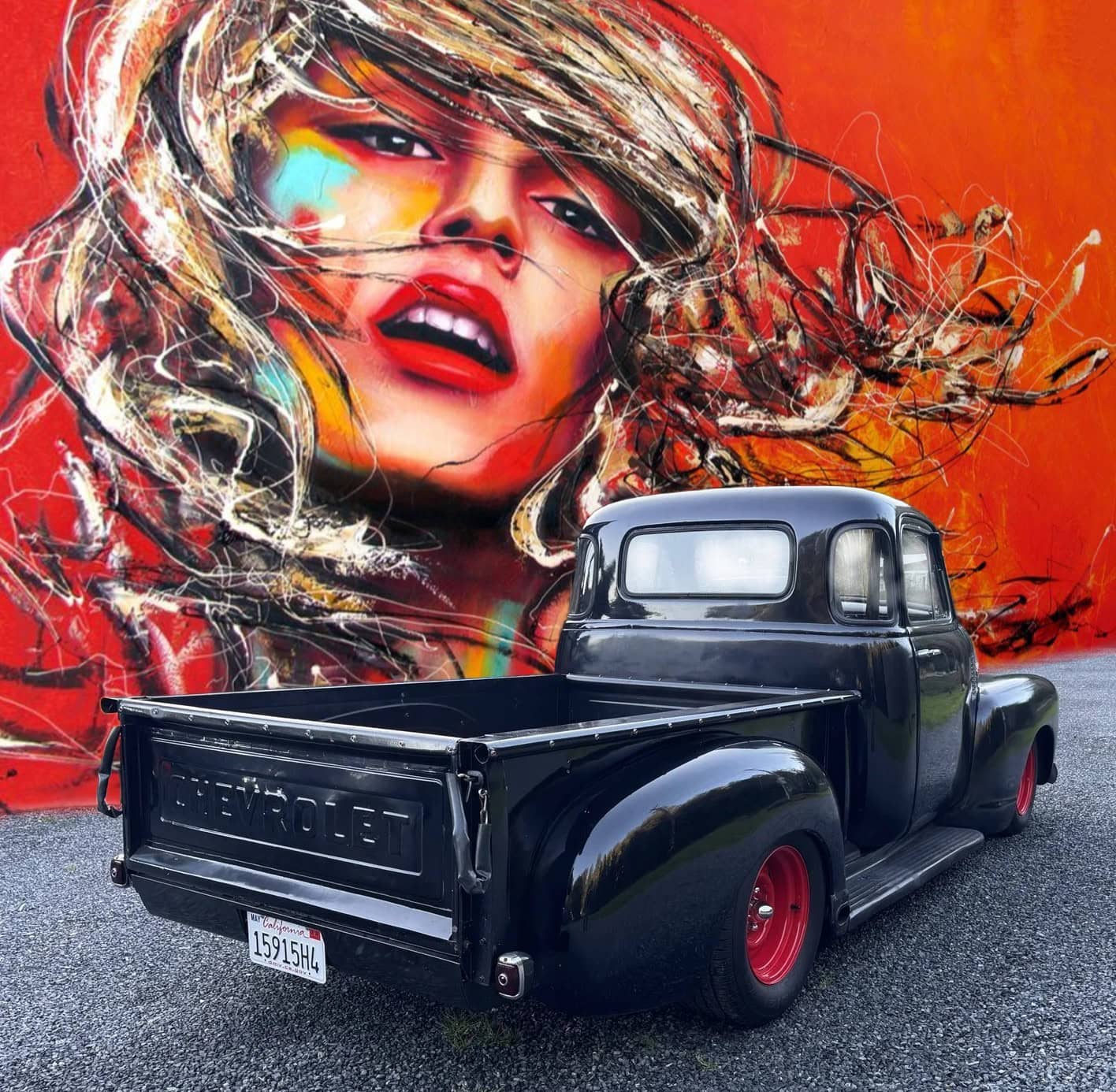 The front bumper is black and the grille is brushed aluminum, per the seller… Headlights are HID units… A custom rolled rear pan was installed… The wood bed has stainless-steel rub strips…. Power-adjustable bucket seats are upholstered in black leather… Climate control is managed by Vintage Air… The Mustang II-style independent front suspension has power steering… Power four-wheel disc brakes provide strong stopping capabilities… A four-link setup controls the rear suspension along with coilover shocks…Chevy rally wheels have been painted bright red with chrome lugs… Tires BFGoodrich Radial T/As… For you, only 80.000$...