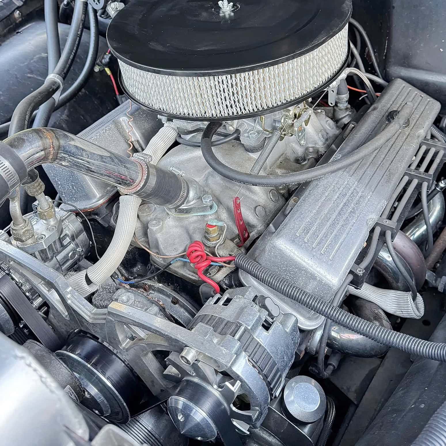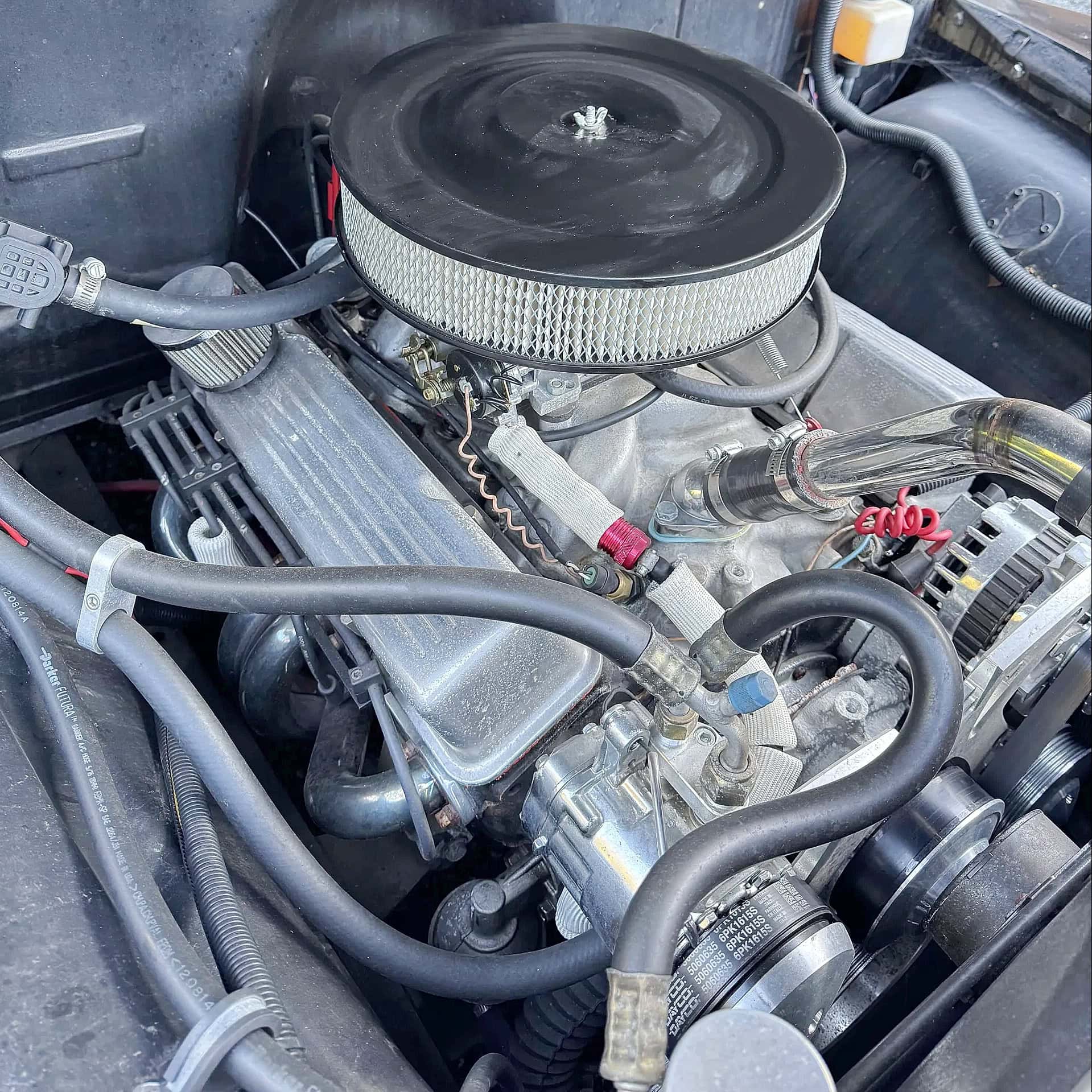 La suite en argot américain pour connaisseurs only… : A Chevy small-block 383-cu.in. OHV V8 powers this pickup…The engine has an aluminum intake manifold and exhaust headers… A custom oil pan is present… Dual exhausts exit behind the running boards in the lower rear fenders… A Tremec T5 manual five-speed transmission backs the engine… A scatter shield is present… The rear end is a GM 10-bolt unit… No body damage has been reported but there are some scratches and minor rust… The seller calls the black paint “faded,” with some blemishes on several panels…