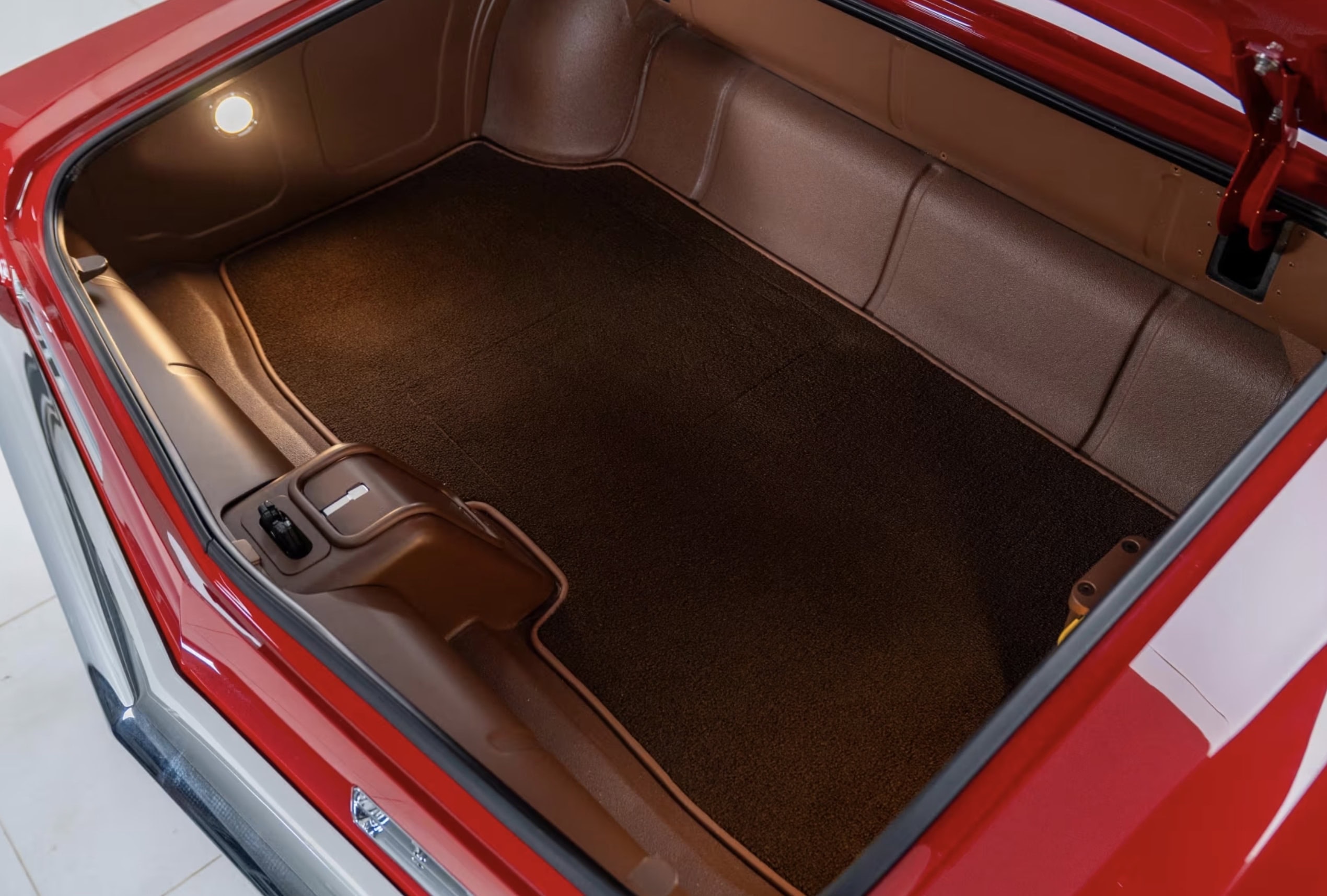 L’équipe a recréé et modifié la voiture pour lui donner l’apparence d’un modèle d’origine tout en lui conférant des performances différentes. En l’examinant attentivement, on remarque qu’elle est légèrement abaissée, ce qui lui donne une allure plus agressive, et qu’elle est équipée de jantes Forgeline plus larges chaussées de pneus Michelin. Les vitres affleurantes, les pare-chocs sur mesure, l’échappement latéral et les phares artisanaux s’intègrent au style original. De plus, le pare-chocs arrière a été redessiné pour accueillir des feux personnalisés intégrés à un panneau arrière en aluminium usiné.