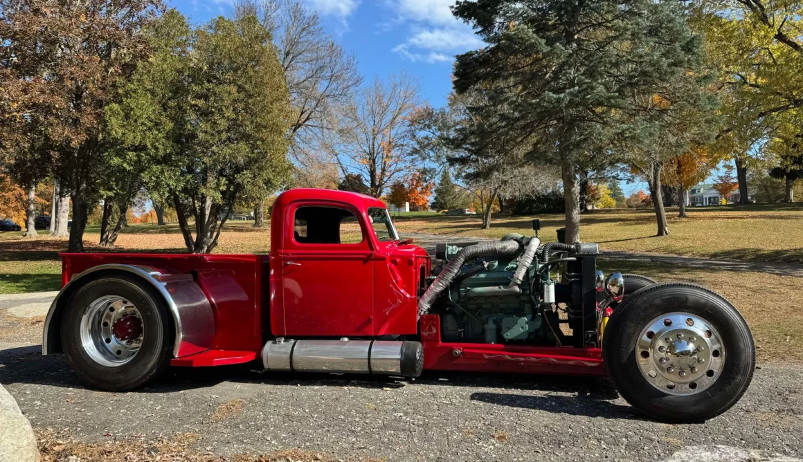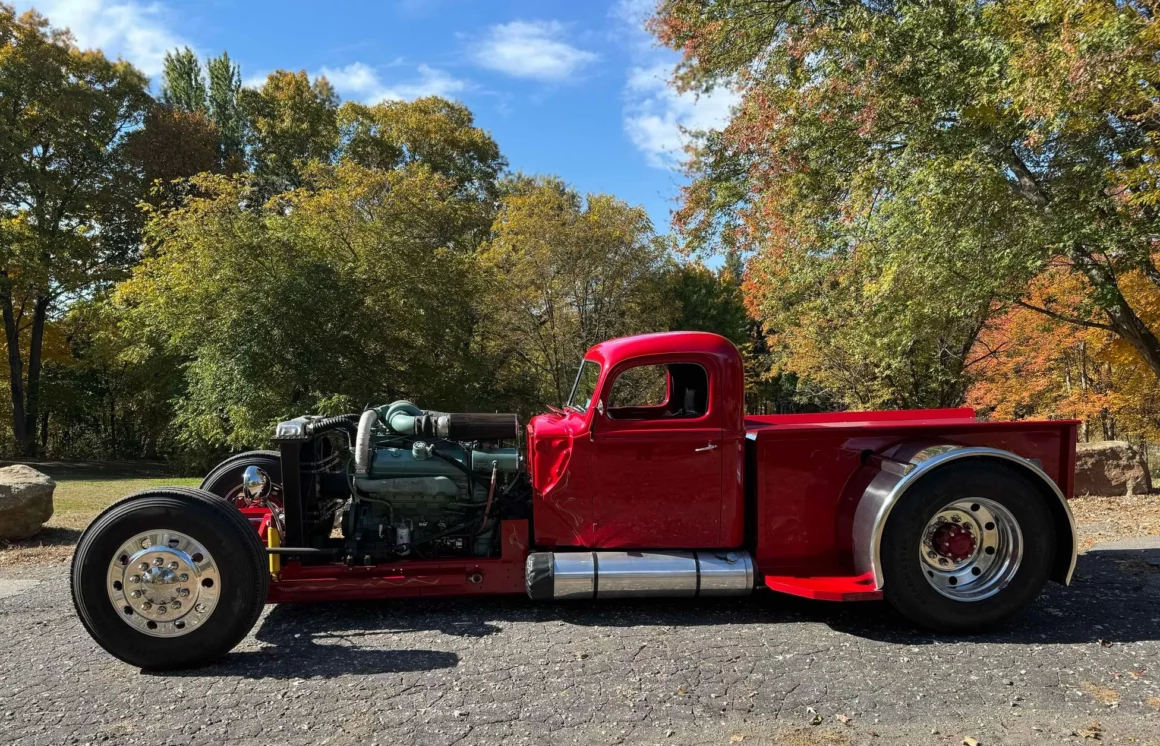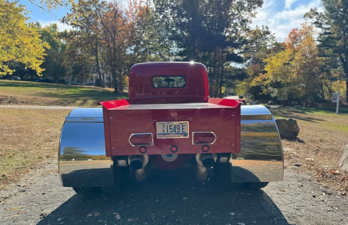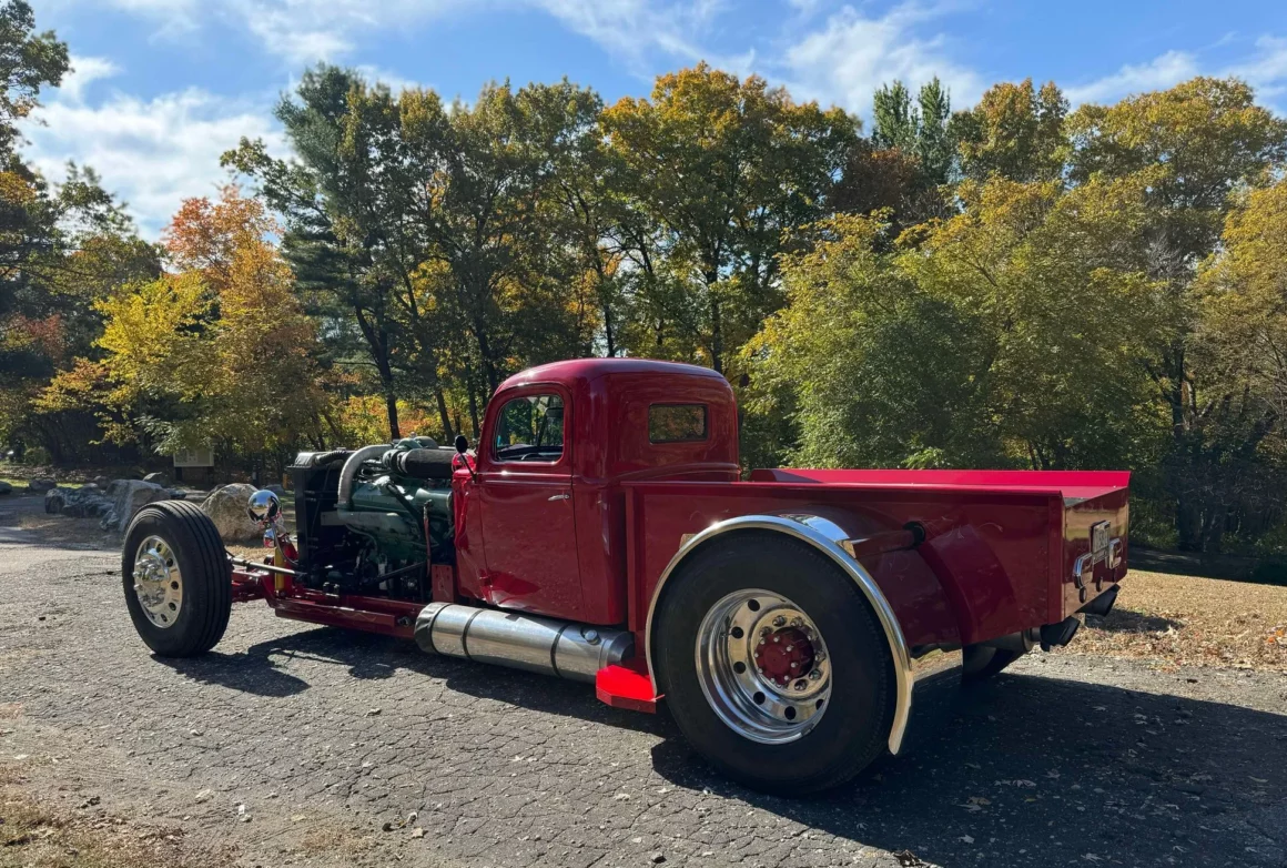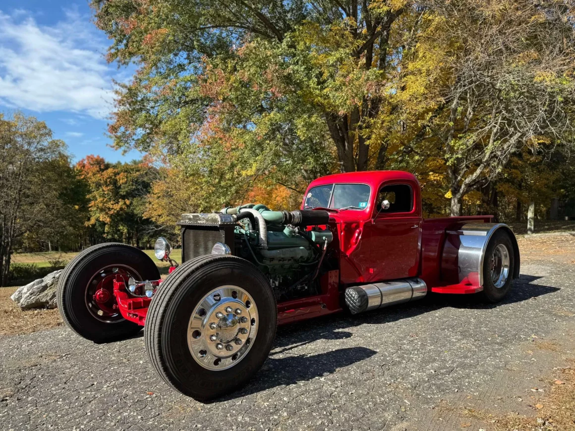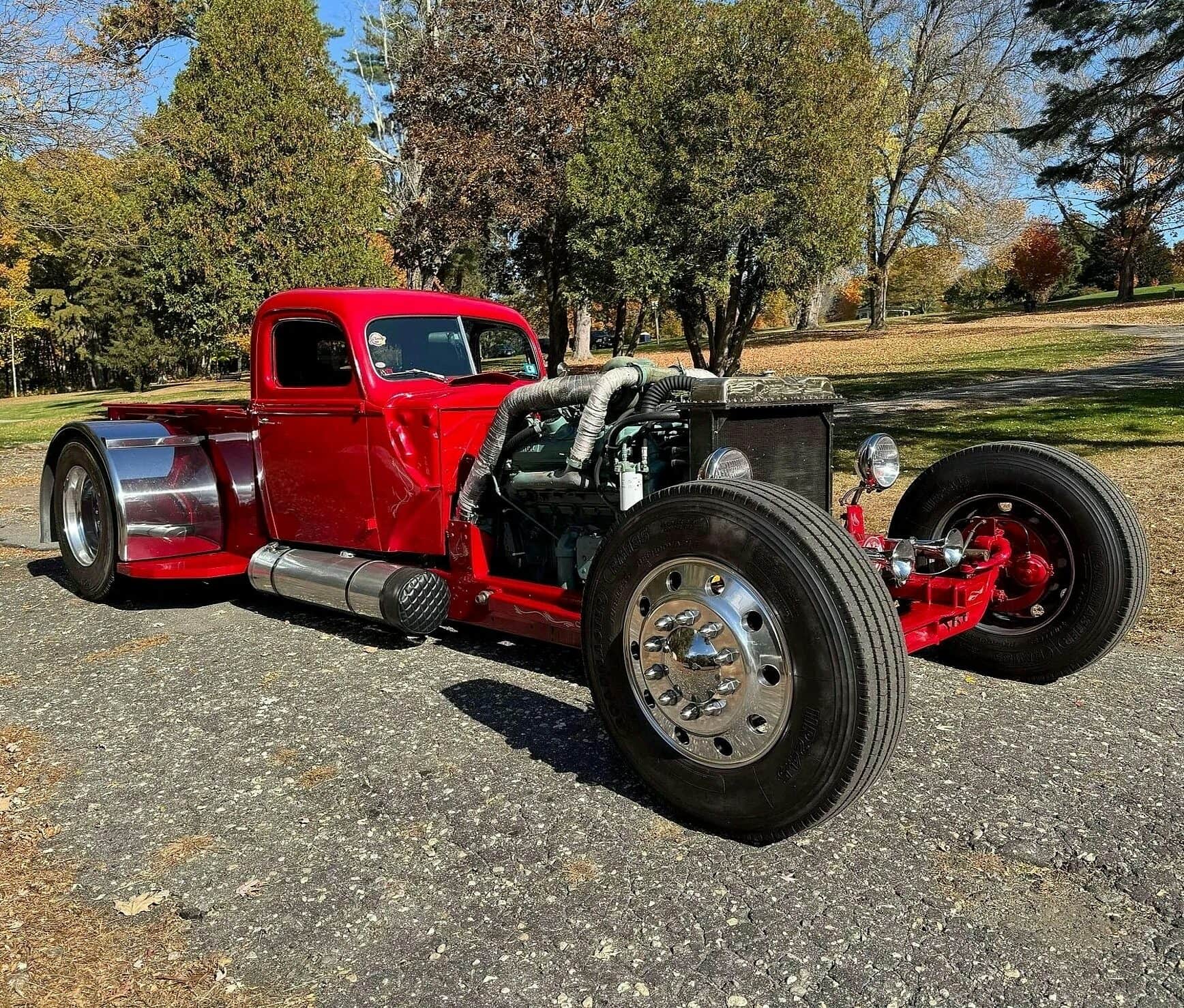 Je précise que c’est avec un engrenage de 4,64:1… La vitesse maximale du véhicule est d’environ 120km/h, son poids est de 3T5. Le véhicule est immatriculé comme un camion MAXI de 1946 en utilisant le numéro d’identification attribué au New Hampshire NH0012360. Peint en rouge avec des “enluminures” blanches, ce Super Hot Rod est doté d’une cabine de pick-up Ford’46 montée sur un châssis en acier fabriqué sur mesure qui roule sur des jantes en alliage de 24,5po avec une partie avant suicidaire sur mesure, un double essieu arrière, une direction assistée et des freins à air. Toujours dans la démesure, l’intérieur est garni de peau d’autruche noire avec passepoil rouge, il a été réalisé par Lenny Quail de Quail’s Upholstery à Littleton, dans le New Hampshire.