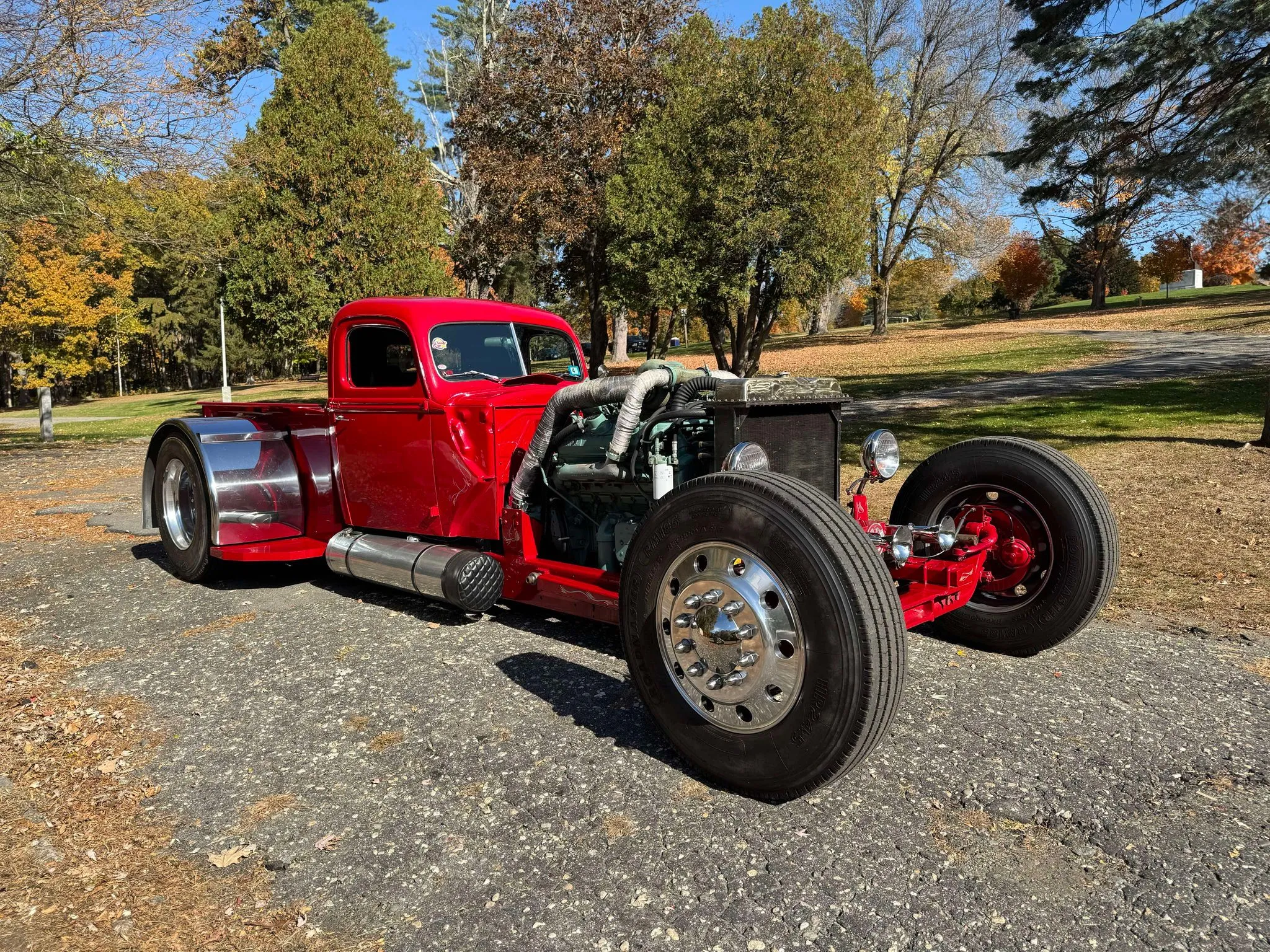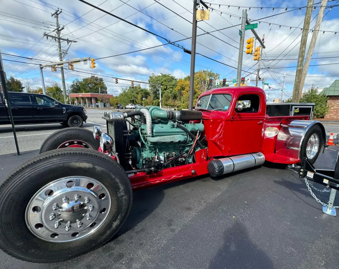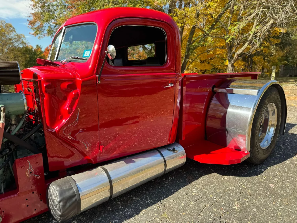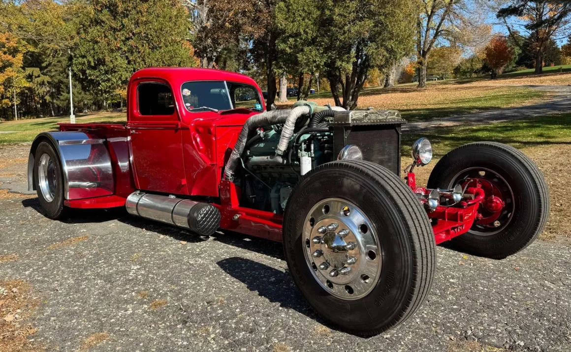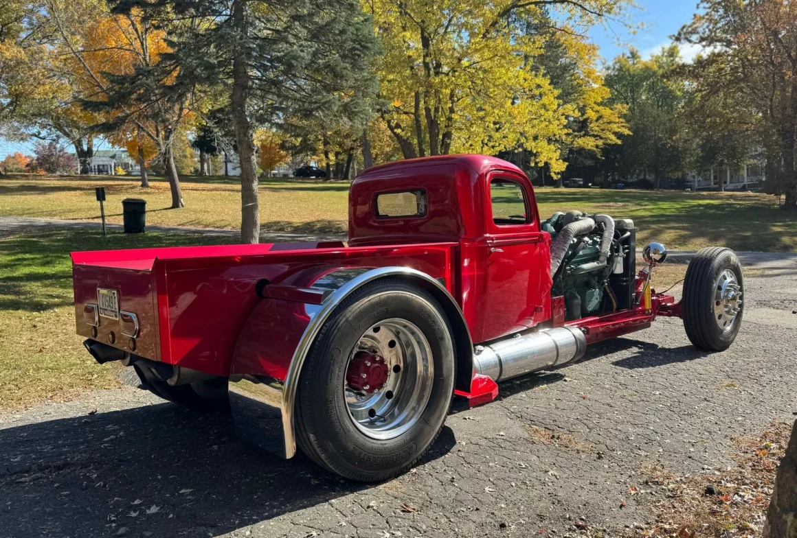 Je précise que c’est avec un engrenage de 4,64:1… La vitesse maximale du véhicule est d’environ 120km/h, son poids est de 3T5. Le véhicule est immatriculé comme un camion MAXI de 1946 en utilisant le numéro d’identification attribué au New Hampshire NH0012360. Peint en rouge avec des “enluminures” blanches, ce Super Hot Rod est doté d’une cabine de pick-up Ford’46 montée sur un châssis en acier fabriqué sur mesure qui roule sur des jantes en alliage de 24,5po avec une partie avant suicidaire sur mesure, un double essieu arrière, une direction assistée et des freins à air. Toujours dans la démesure, l’intérieur est garni de peau d’autruche noire avec passepoil rouge, il a été réalisé par Lenny Quail de Quail’s Upholstery à Littleton, dans le New Hampshire.