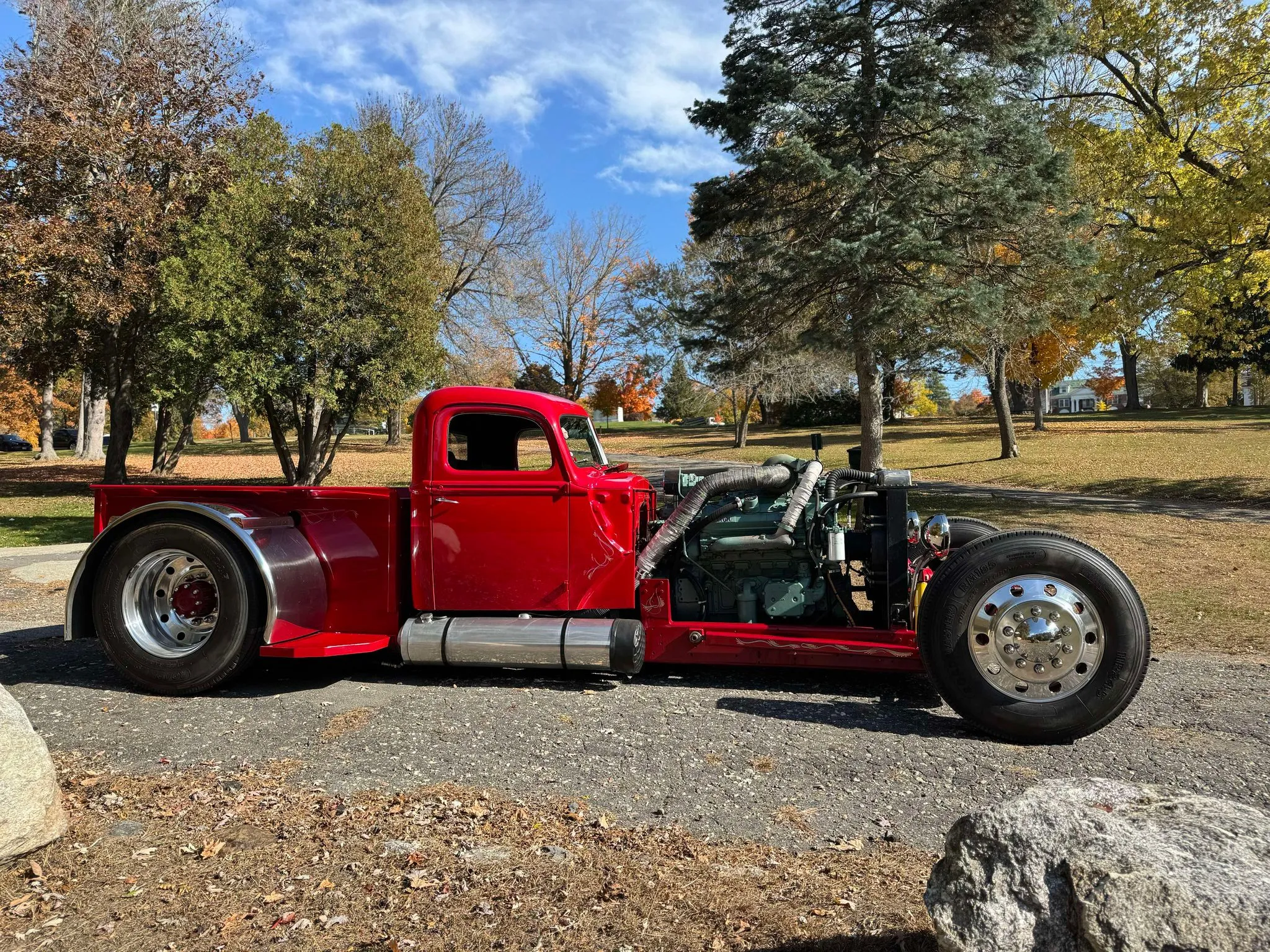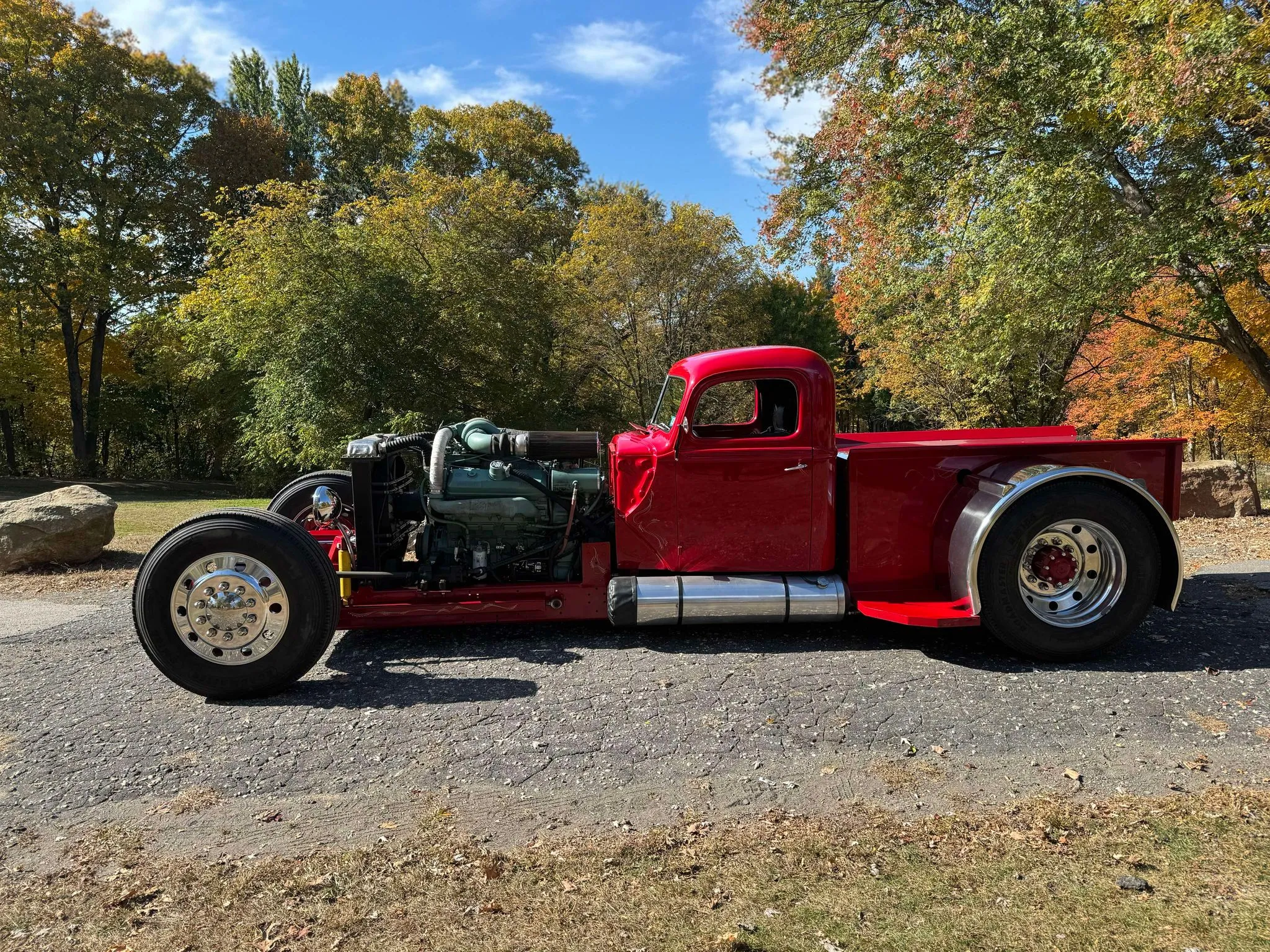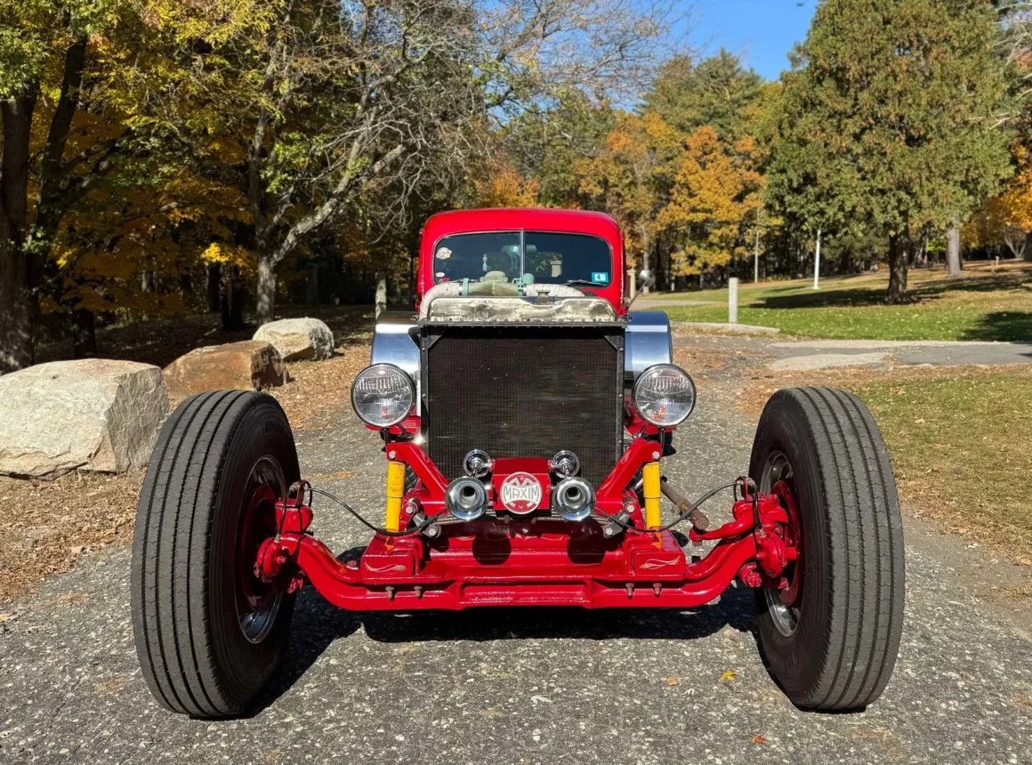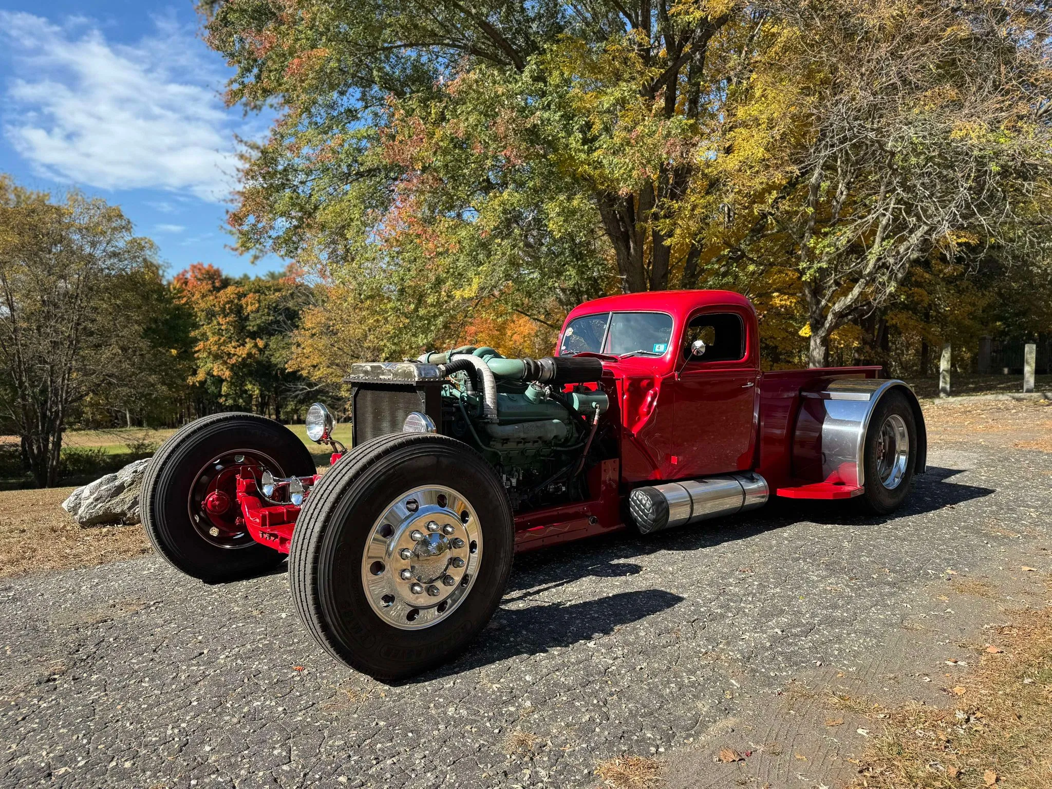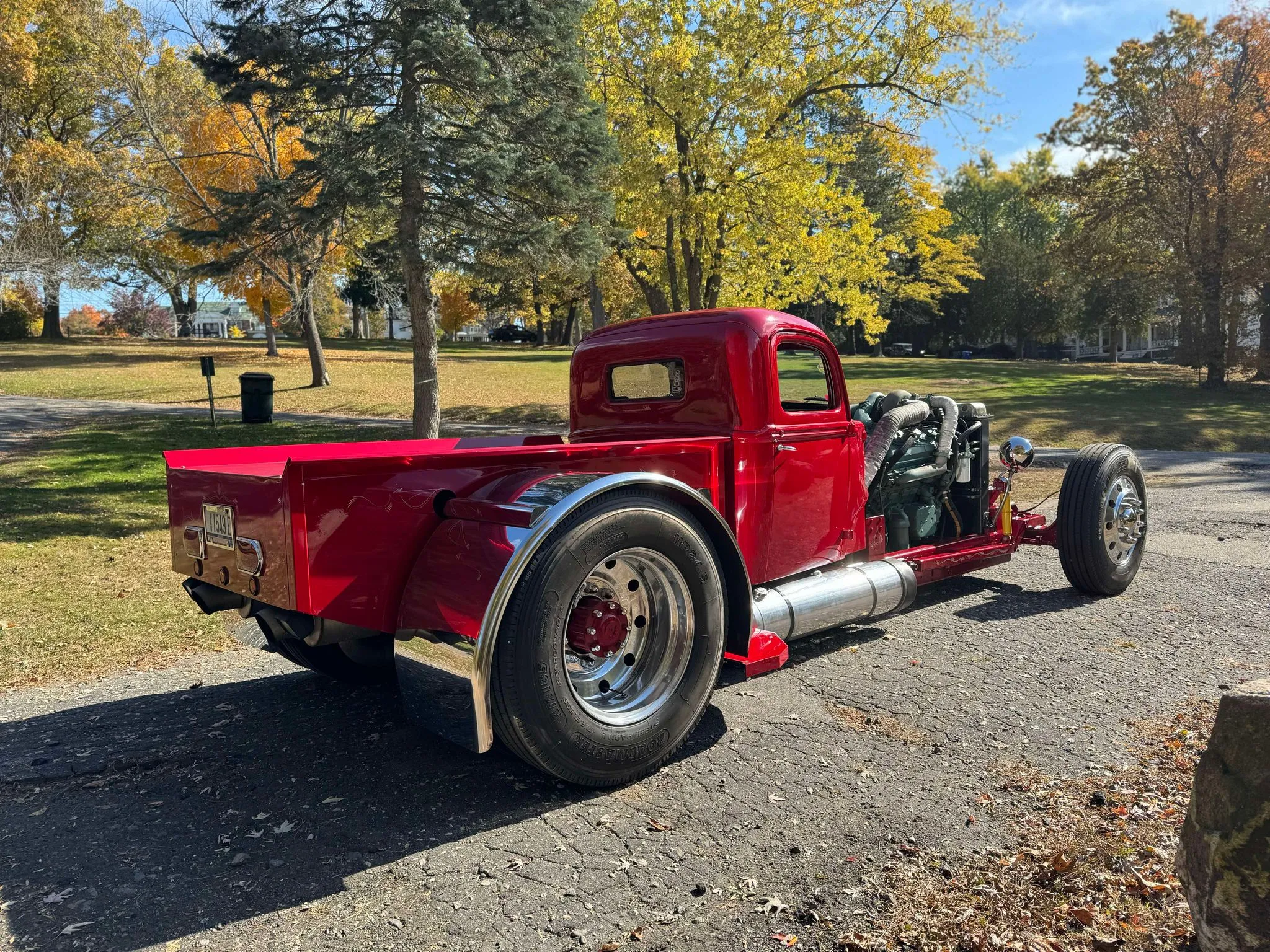 Je précise que c’est avec un engrenage de 4,64:1… La vitesse maximale du véhicule est d’environ 120km/h, son poids est de 3T5. Le véhicule est immatriculé comme un camion MAXI de 1946 en utilisant le numéro d’identification attribué au New Hampshire NH0012360. Peint en rouge avec des “enluminures” blanches, ce Super Hot Rod est doté d’une cabine de pick-up Ford’46 montée sur un châssis en acier fabriqué sur mesure qui roule sur des jantes en alliage de 24,5po avec une partie avant suicidaire sur mesure, un double essieu arrière, une direction assistée et des freins à air. Toujours dans la démesure, l’intérieur est garni de peau d’autruche noire avec passepoil rouge, il a été réalisé par Lenny Quail de Quail’s Upholstery à Littleton, dans le New Hampshire.