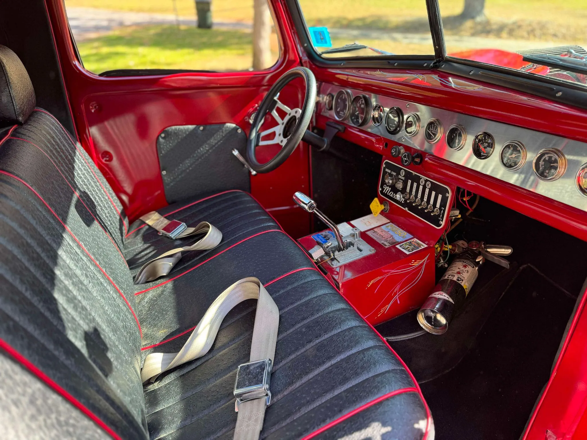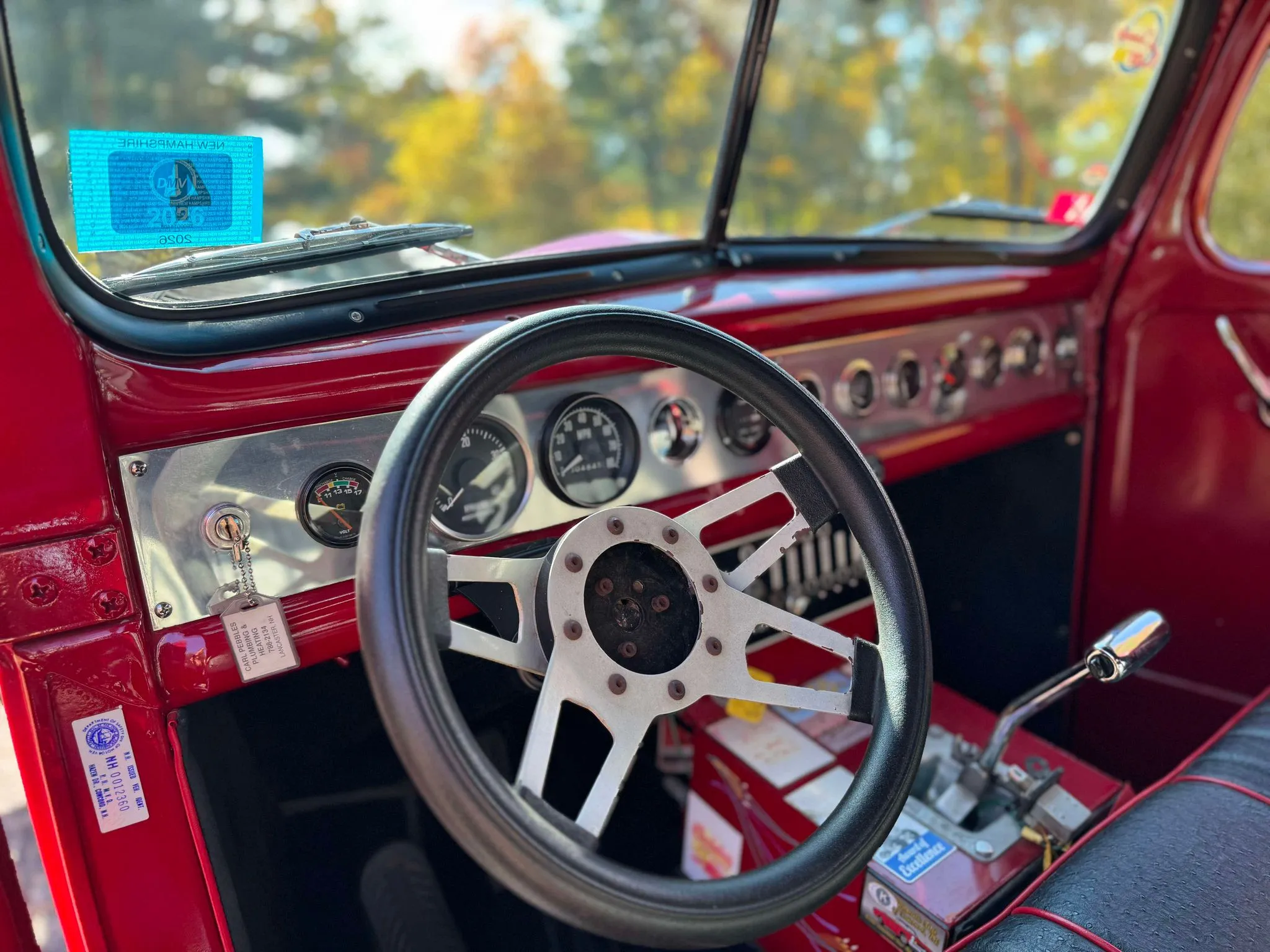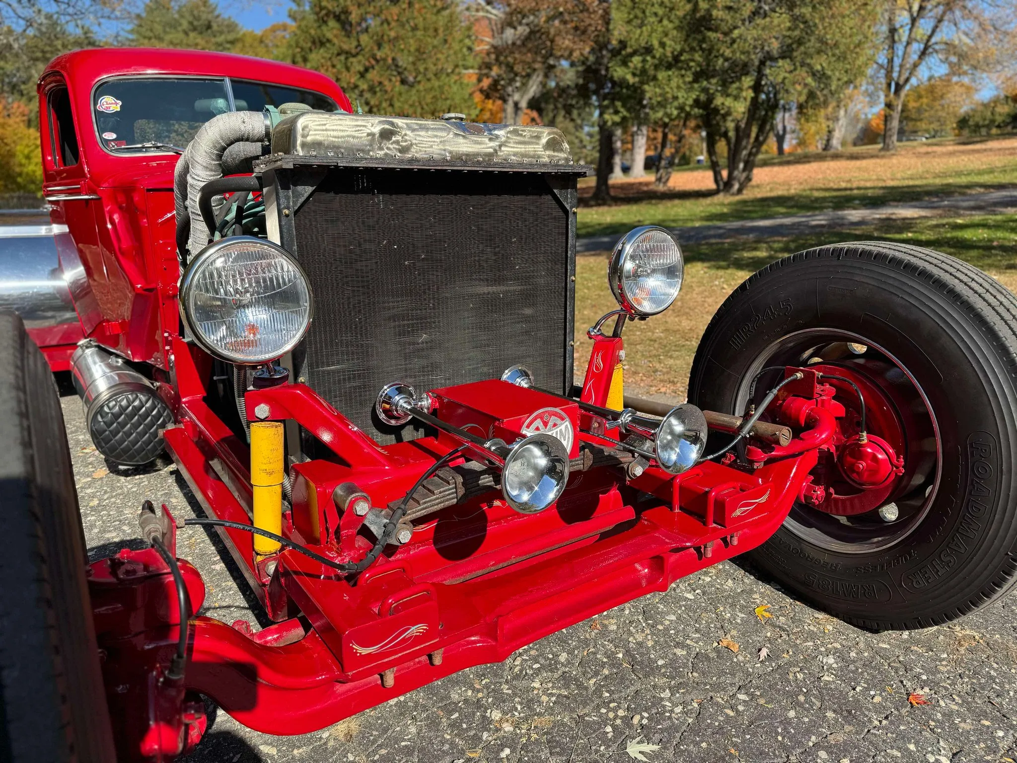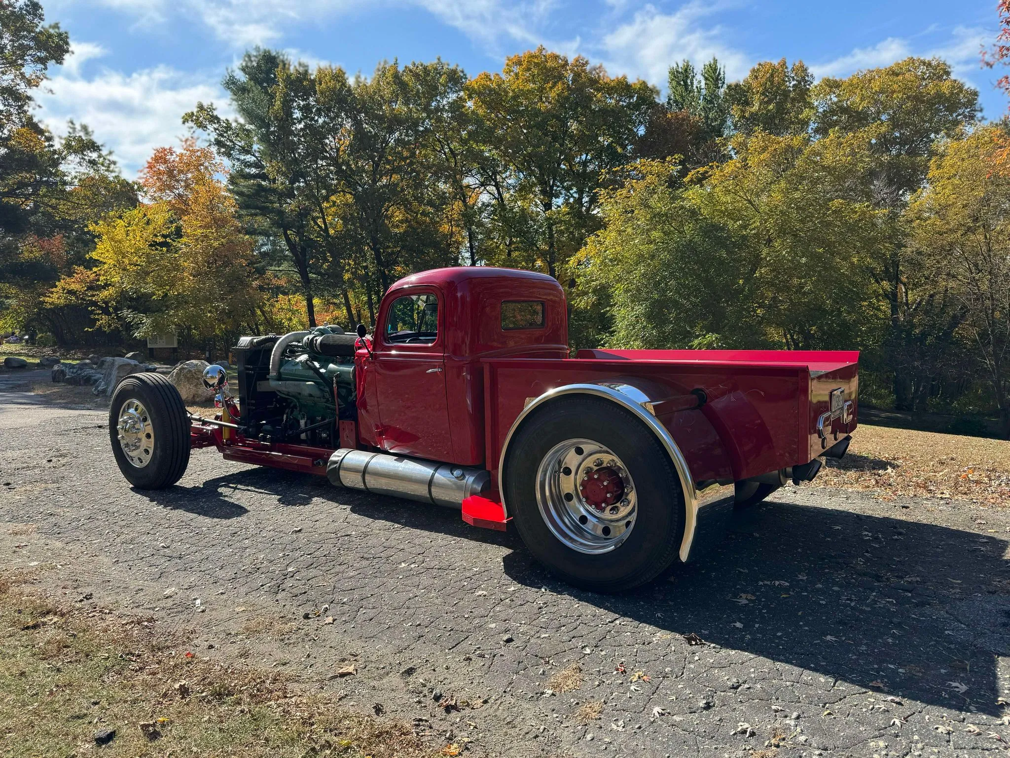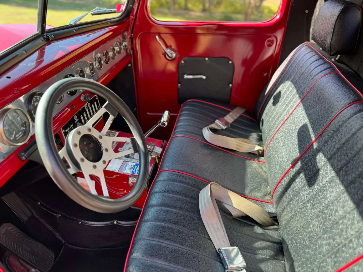 Je précise que c’est avec un engrenage de 4,64:1… La vitesse maximale du véhicule est d’environ 120km/h, son poids est de 3T5. Le véhicule est immatriculé comme un camion MAXI de 1946 en utilisant le numéro d’identification attribué au New Hampshire NH0012360. Peint en rouge avec des “enluminures” blanches, ce Super Hot Rod est doté d’une cabine de pick-up Ford’46 montée sur un châssis en acier fabriqué sur mesure qui roule sur des jantes en alliage de 24,5po avec une partie avant suicidaire sur mesure, un double essieu arrière, une direction assistée et des freins à air. Toujours dans la démesure, l’intérieur est garni de peau d’autruche noire avec passepoil rouge, il a été réalisé par Lenny Quail de Quail’s Upholstery à Littleton, dans le New Hampshire.