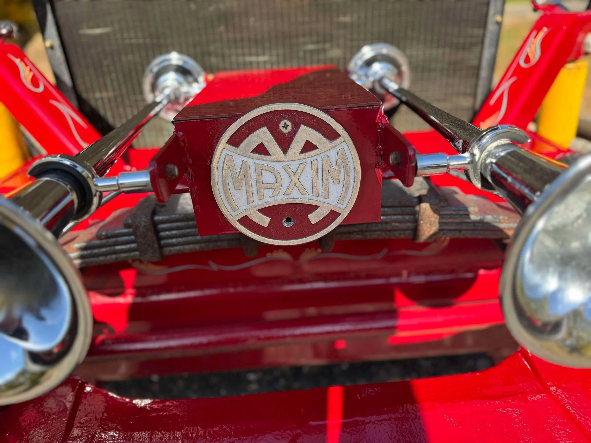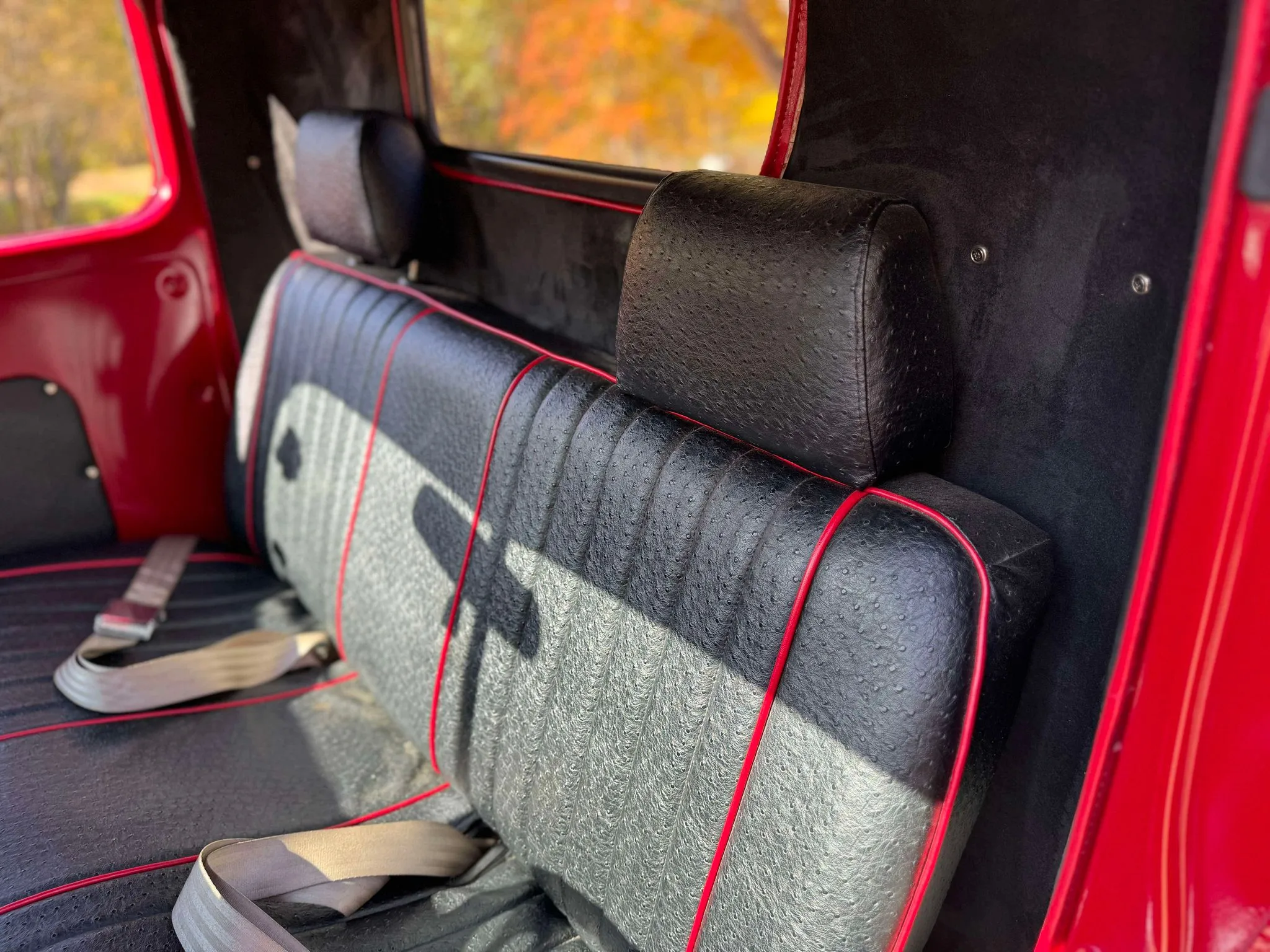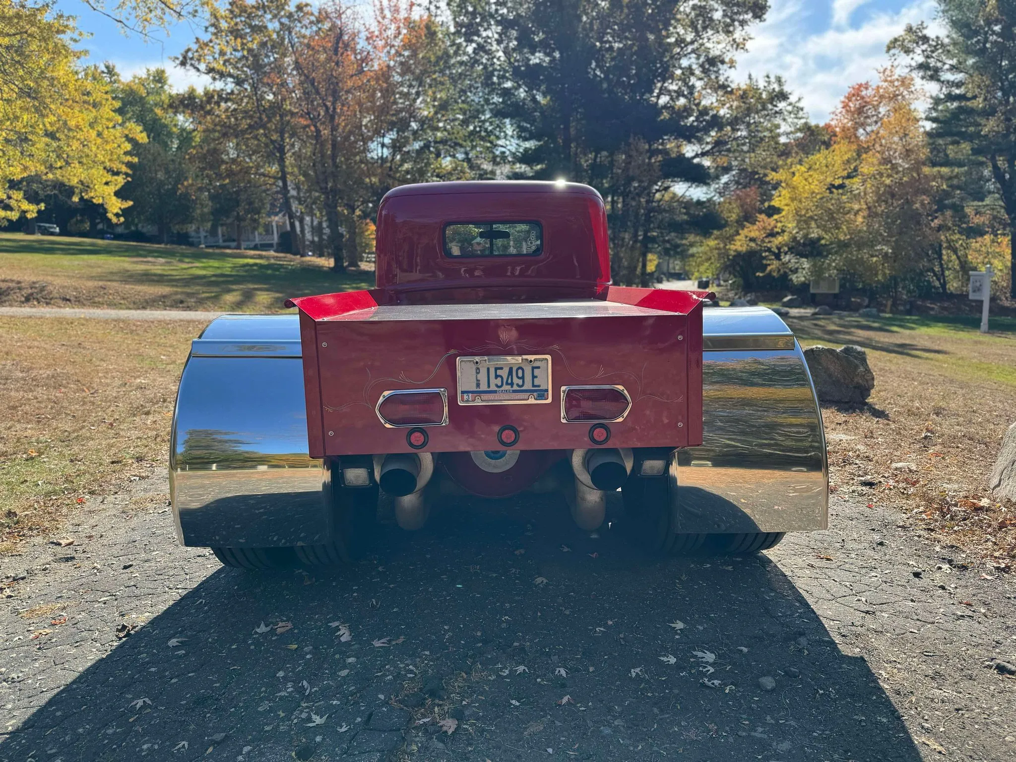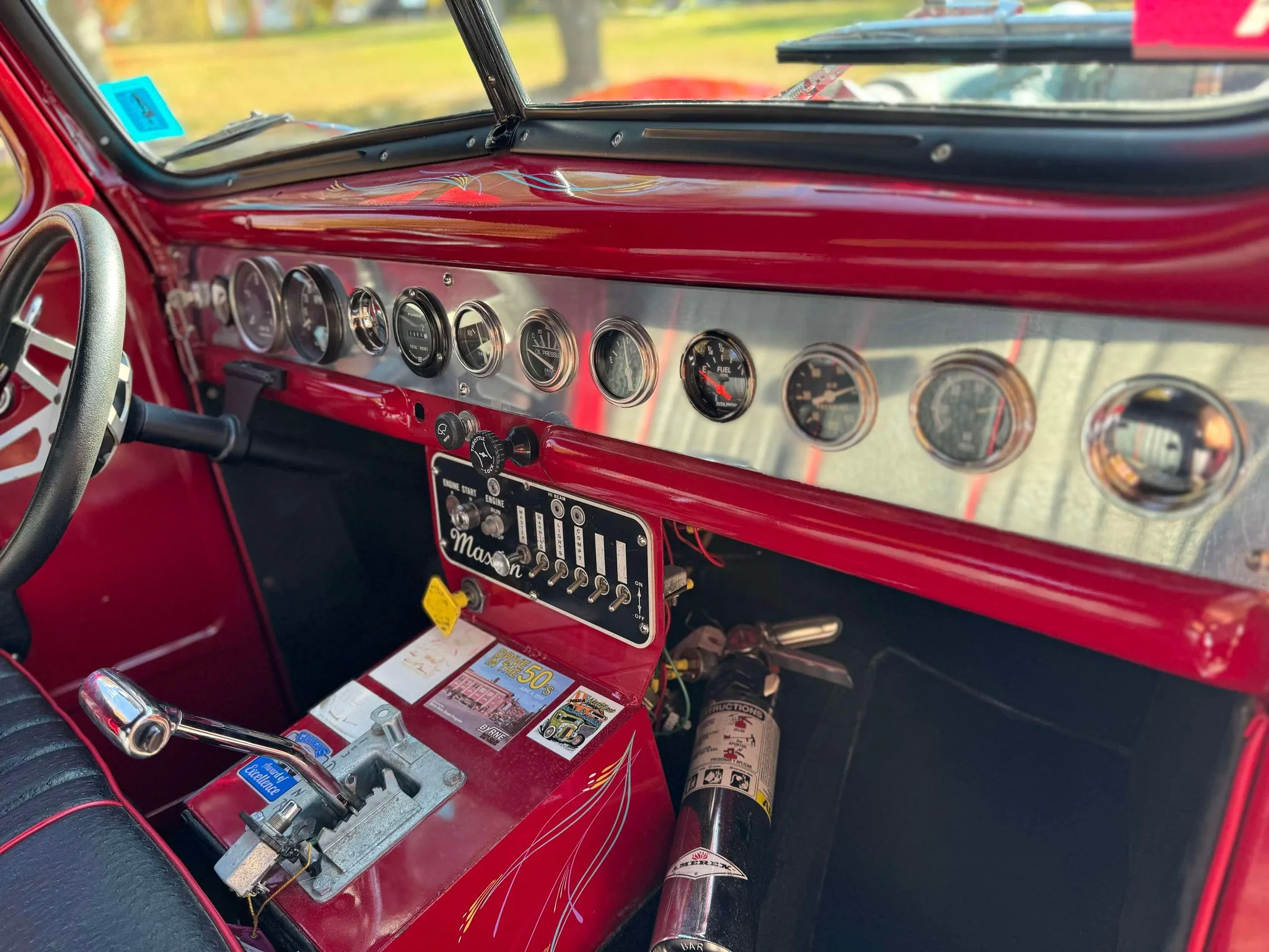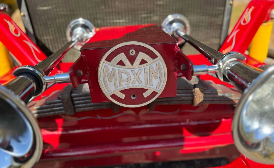 Je précise que c’est avec un engrenage de 4,64:1… La vitesse maximale du véhicule est d’environ 120km/h, son poids est de 3T5. Le véhicule est immatriculé comme un camion MAXI de 1946 en utilisant le numéro d’identification attribué au New Hampshire NH0012360. Peint en rouge avec des “enluminures” blanches, ce Super Hot Rod est doté d’une cabine de pick-up Ford’46 montée sur un châssis en acier fabriqué sur mesure qui roule sur des jantes en alliage de 24,5po avec une partie avant suicidaire sur mesure, un double essieu arrière, une direction assistée et des freins à air. Toujours dans la démesure, l’intérieur est garni de peau d’autruche noire avec passepoil rouge, il a été réalisé par Lenny Quail de Quail’s Upholstery à Littleton, dans le New Hampshire.