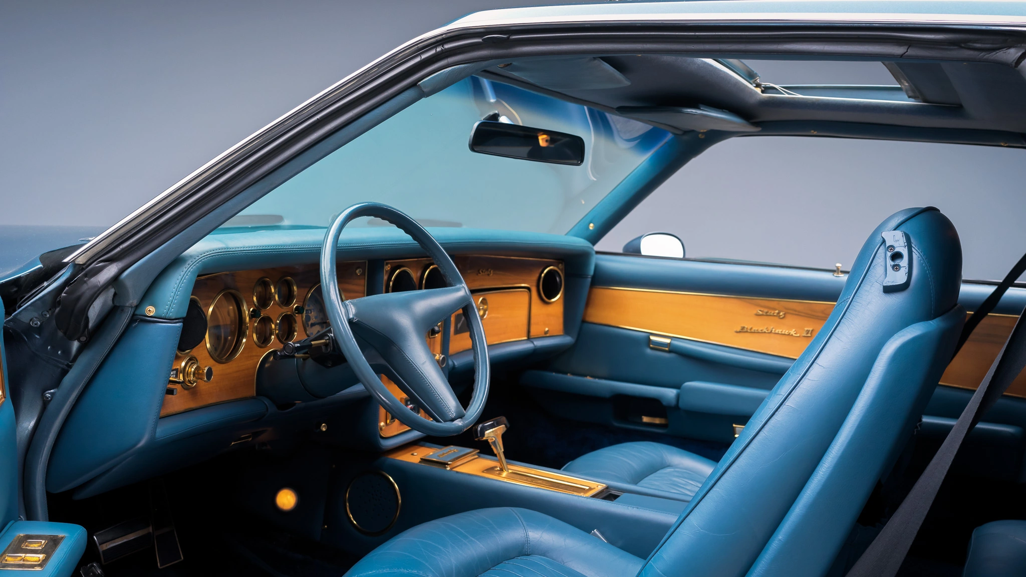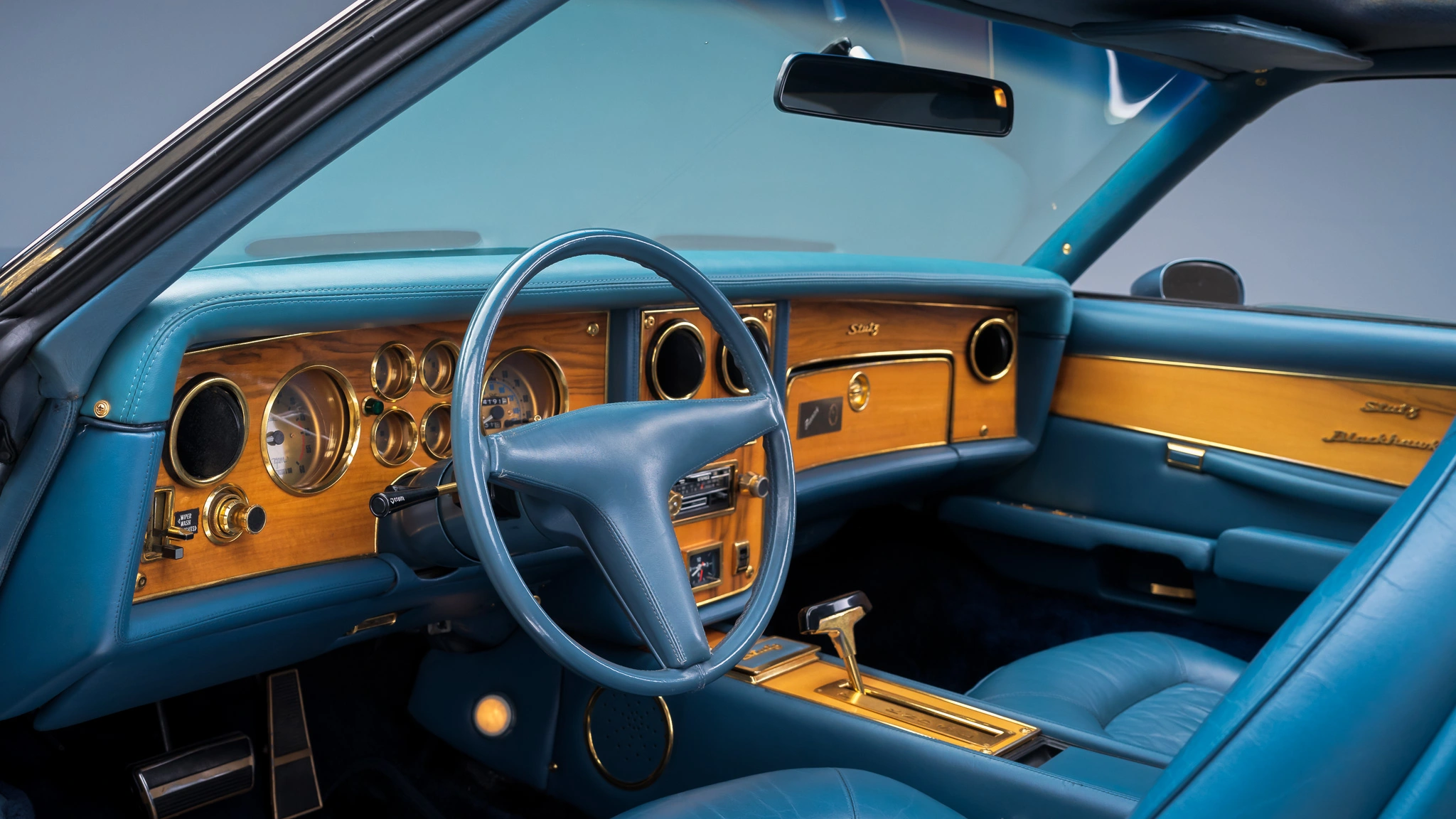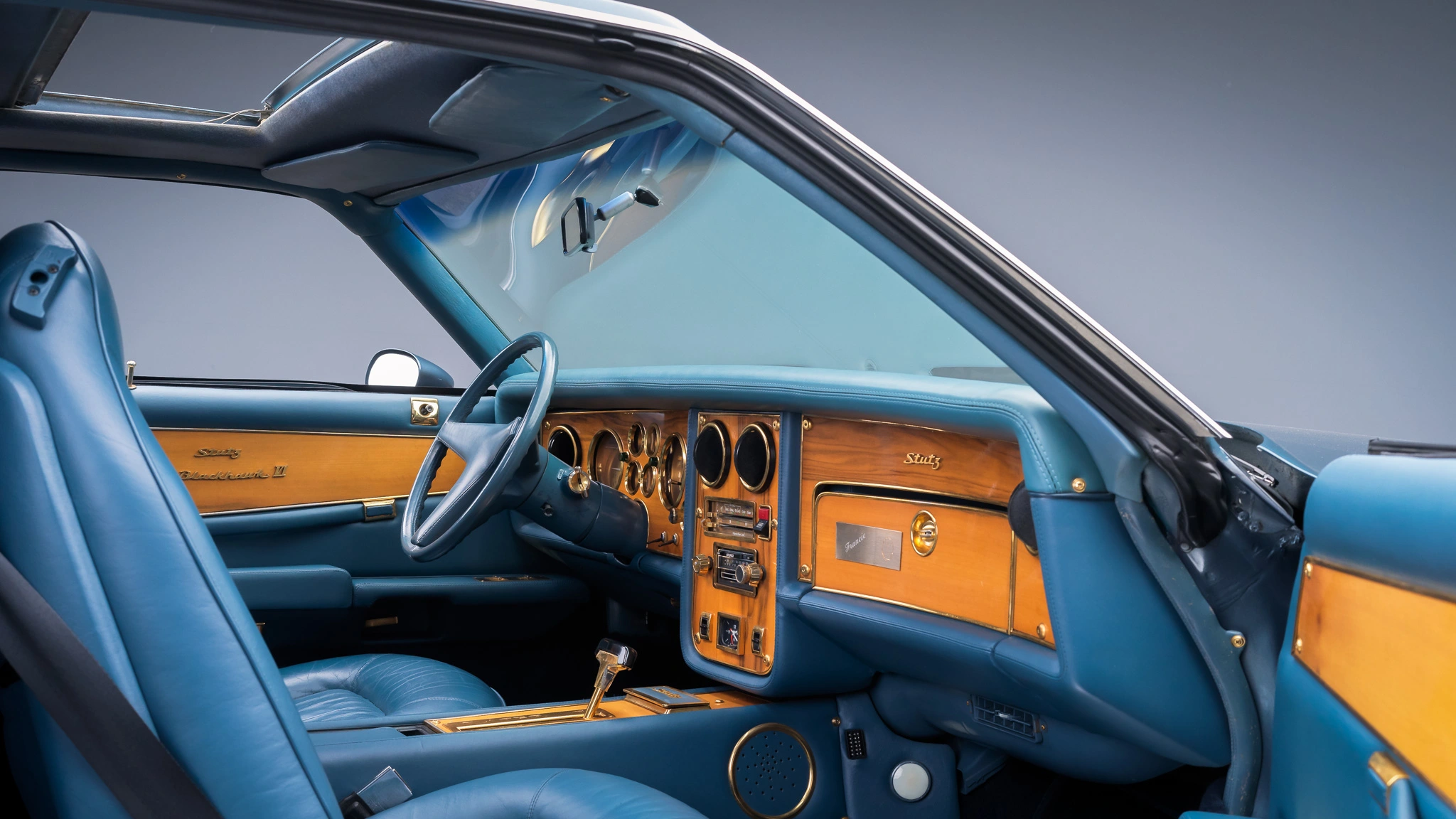 Cette Stutz Blackhawk VI de 1977 est l’une des quelques 600 Blackhawk’s produites entre 1971 et 1987. La voiture se voulait réservée aux “ceusses” ayant le sang bleu qui en tombaient bleu d’émotion (moins actuellement), sa bicolorisation en deux tons de bleu sur un intérieur en cuir Connolly bleu étant un “plus” pour les snob au sang bleu… La puissance glougloutesque fournie par un V8 General Motors 403ci associé (pour la vie jusqu’à ce que la mort les sépare) à une transmission automatique à trois vitesses TH400, était la démonstration d’avoir des finances à hauteur stratosphérique de la consommation… L’équipement standard consistait en des roues fil 16 pouces, des faux tuyaux latéraux simulant l’échappement, un toit ouvrant, des sièges à multi-réglages électriques, des garnitures intérieures plaquées or, la climatisation d’une autre époque et une chaîne stéréo à cassette AM/FM déjà démodée dès sa sortie. Le Must ultime, mais rare, étant en 2022 de disposer d’une version jouant des disques 45T ainsi qu’in antédiluvien lecteur de cassettes 8 pistes…
