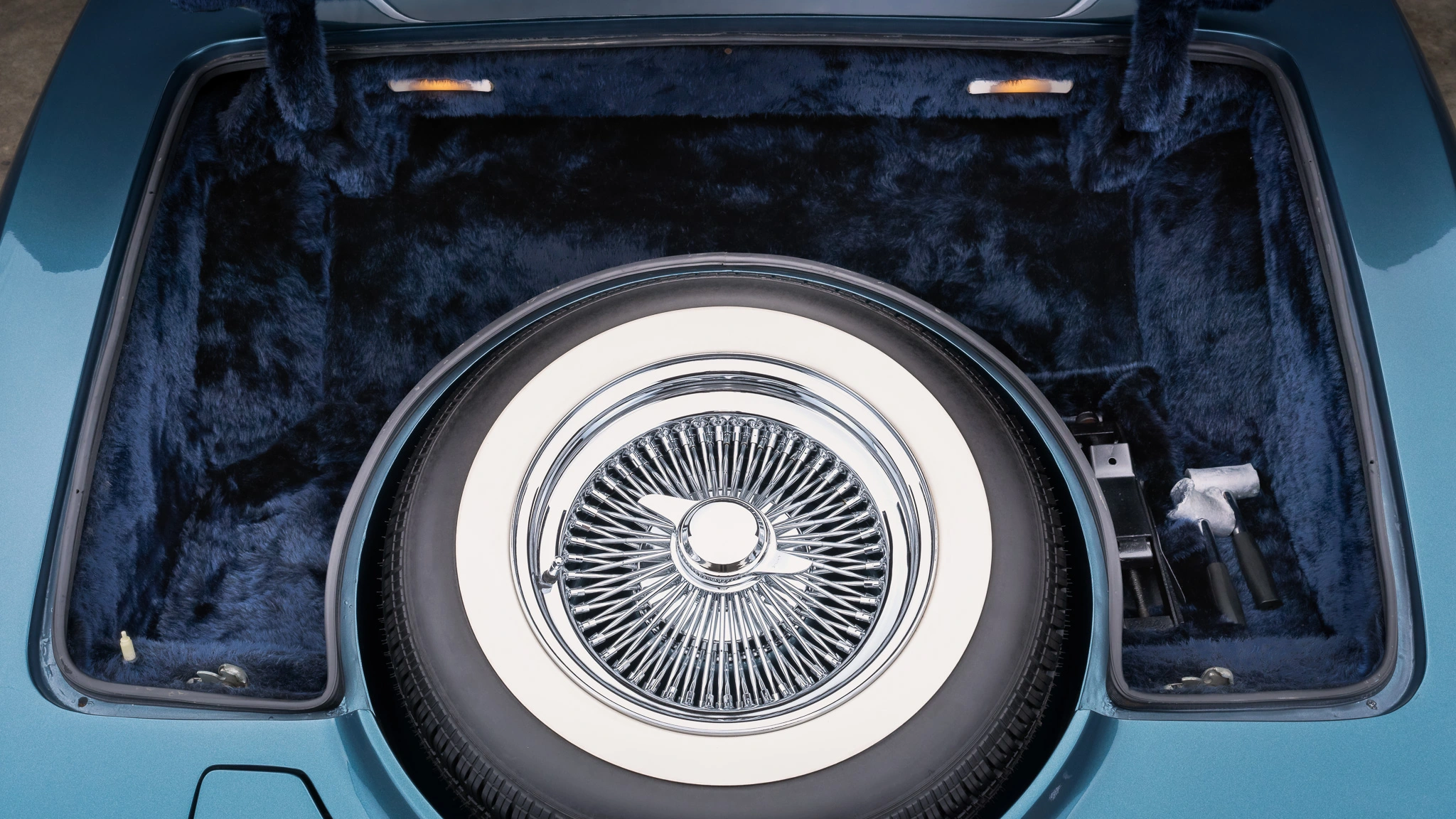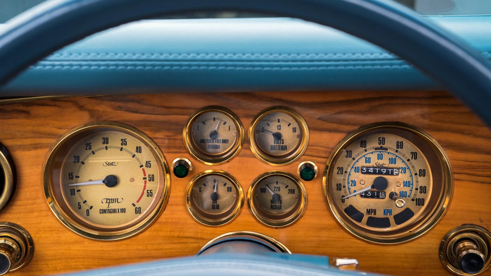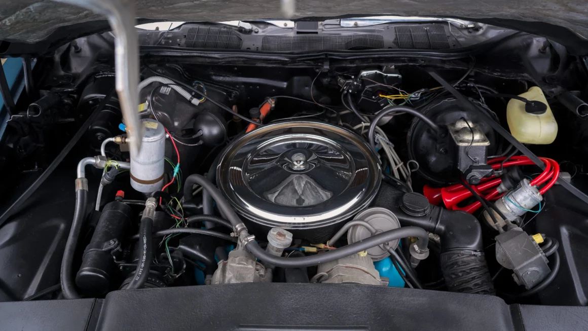Cette Stutz Blackhawk VI de 1977 est l’une des quelques 600 Blackhawk’s produites entre 1971 et 1987. La voiture se voulait réservée aux “ceusses” ayant le sang bleu qui en tombaient bleu d’émotion (moins actuellement), sa bicolorisation en deux tons de bleu sur un intérieur en cuir Connolly bleu étant un “plus” pour les snob au sang bleu… La puissance glougloutesque fournie par un V8 General Motors 403ci associé (pour la vie jusqu’à ce que la mort les sépare) à une transmission automatique à trois vitesses TH400, était la démonstration d’avoir des finances à hauteur stratosphérique de la consommation… L’équipement standard consistait en des roues fil 16 pouces, des faux tuyaux latéraux simulant l’échappement, un toit ouvrant, des sièges à multi-réglages électriques, des garnitures intérieures plaquées or, la climatisation d’une autre époque et une chaîne stéréo à cassette AM/FM déjà démodée dès sa sortie. Le Must ultime, mais rare, étant en 2022 de disposer d’une version jouant des disques 45T ainsi qu’in antédiluvien lecteur de cassettes 8 pistes…