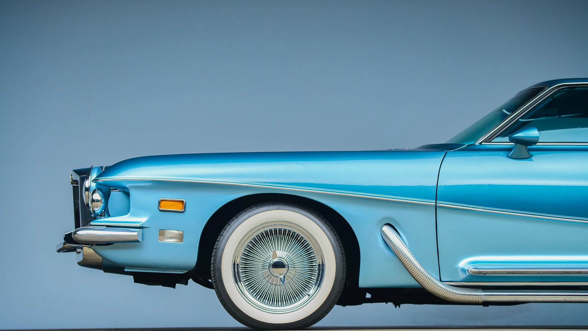 Consternation et bouche bée, mes montes pneumatiques avaient rétréci de cinq ou six pointures au moins. Retenant un cri, je m’écroulais à même le sol sous le poids de la confusion. Au bord de la crise de nerf, j’osais encore regarder dans les phares ma mutante, laquelle ne me renvoyait qu’une expression idiote de cétacé inoffensif. Et c’est ainsi que je vivais chaque nuit le cauchemar de “LA” révélation ultime… Au cours de son mandat à la tête de Chrysler design, Virgil Exner définissait l’emblématique ère des années 1950 avec son révolutionnaire “Forward Look”, un langage de conception quasi ésotérique réservé à “ceusses” qui savaient ! Avant cela, il avait transformé l’image “stodgy” de Chrysler et présenté aux acheteurs américains un style italien sophistiqué avec des voitures de rêve collaboratives créées aux côtés de Gigi Segre de la Carrozzeria Ghia.